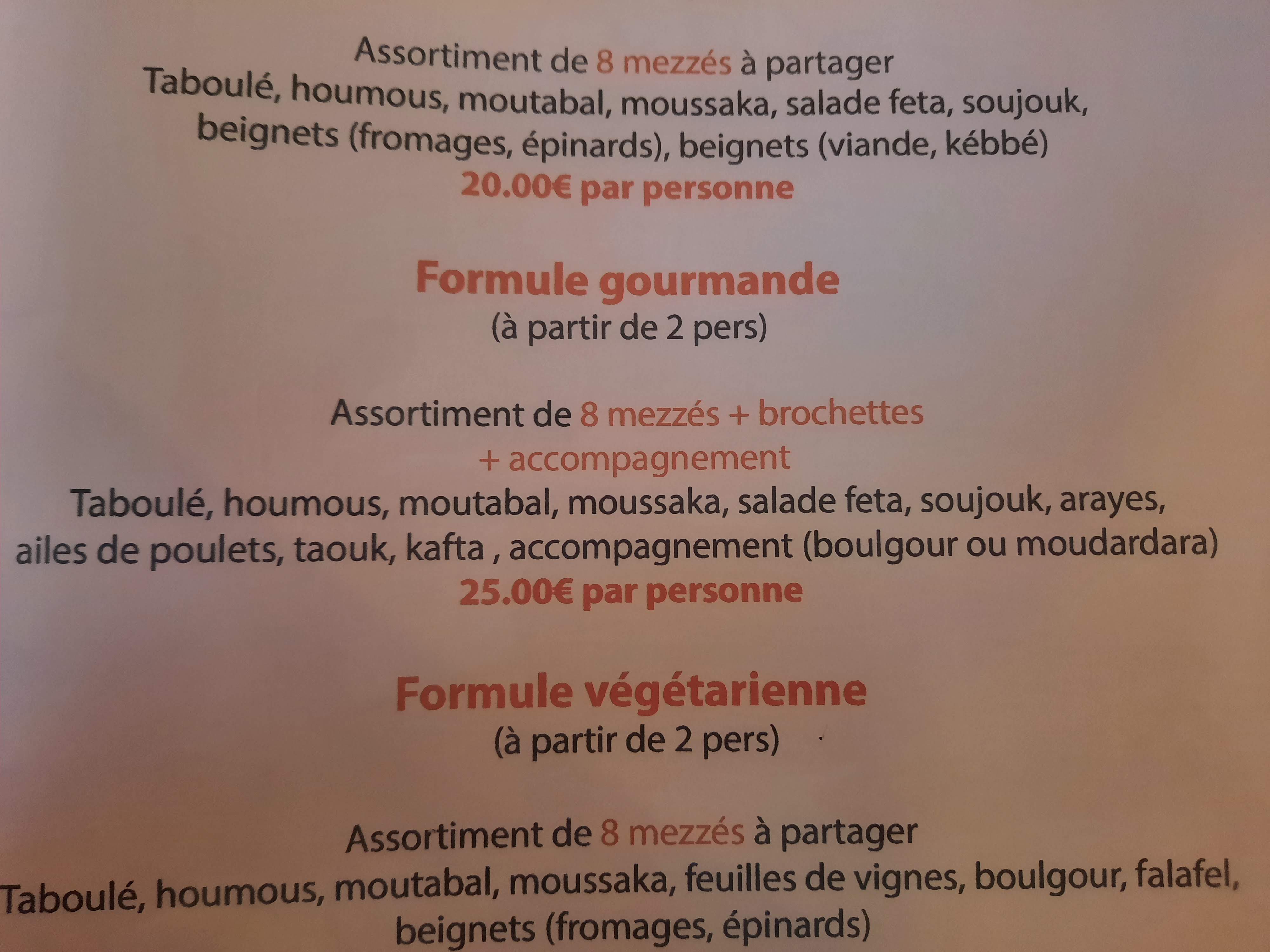 Spécialités libanaises, menu découverte avec plusieurs mezzés, du goût, la quantité et qualité pour un prix correct. Avons mangé sur la terrasse, très agréable, je recommande