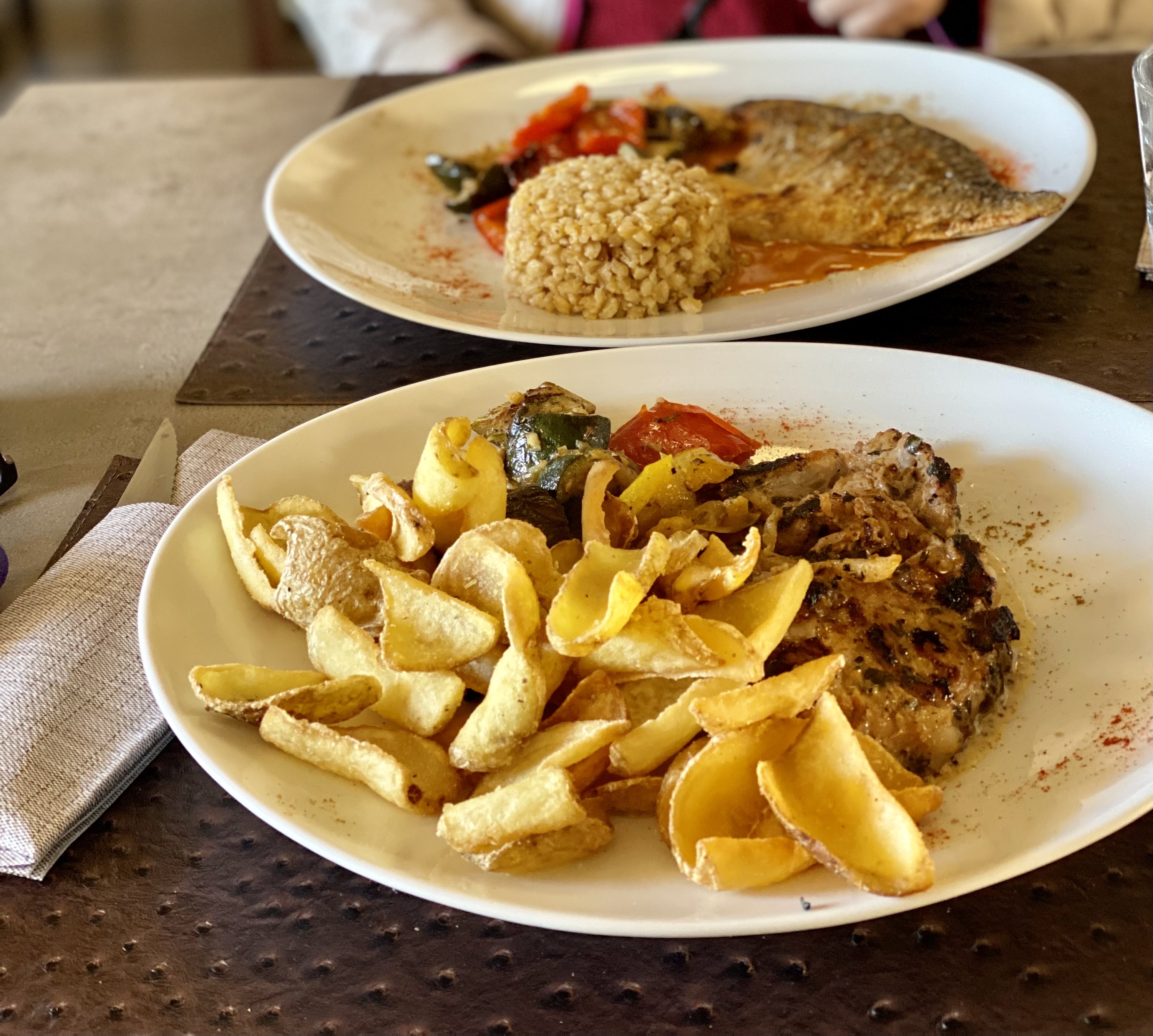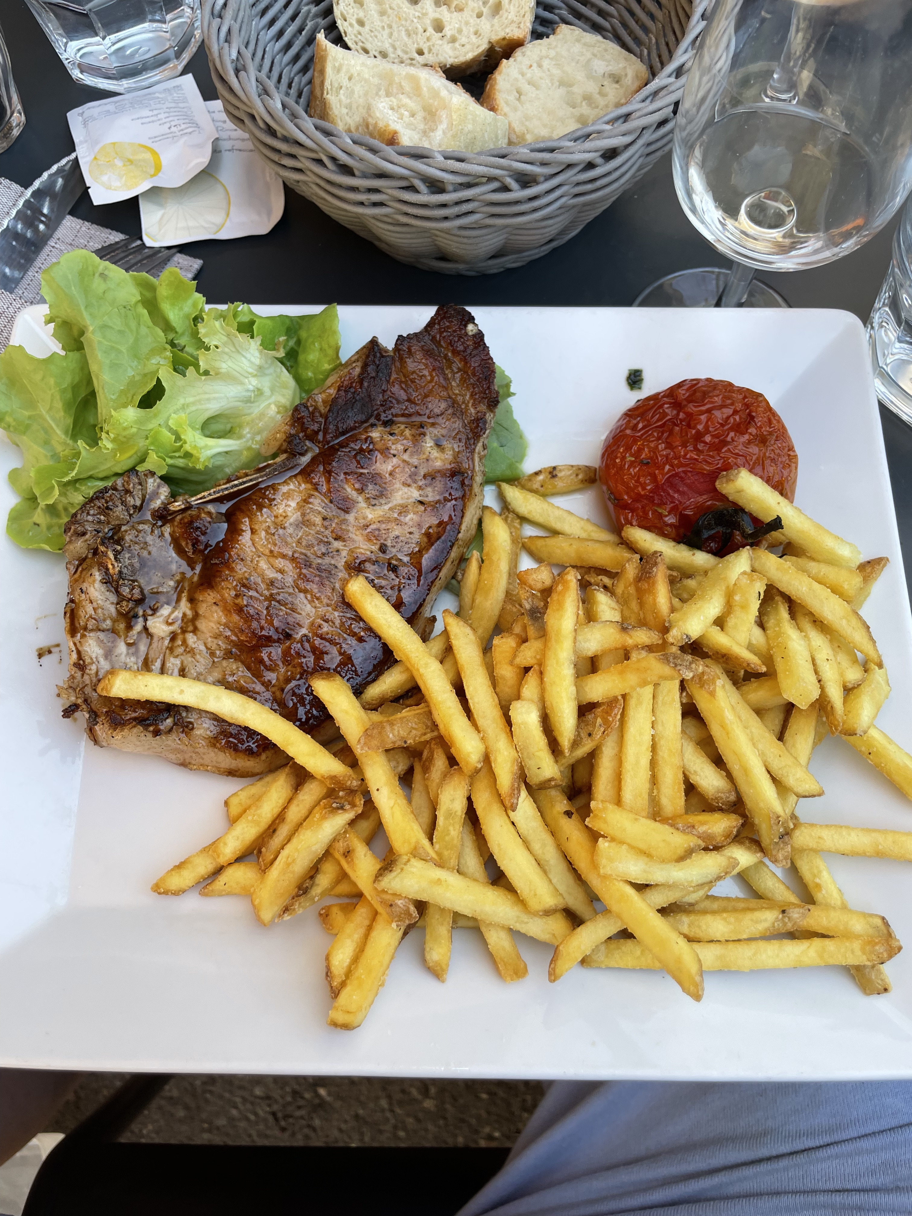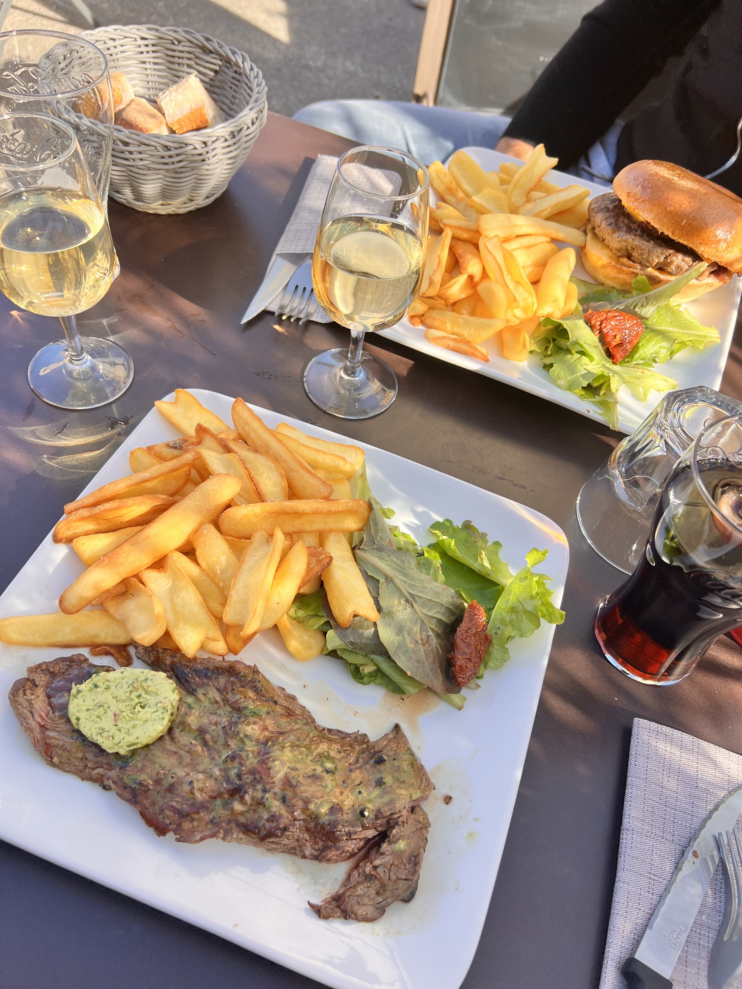 Avec notre compréhension très limitée du français, nous avons (pensé) commandé le steak de poisson et de bœuf dans leur menu du déjeuner, avec une tarte aux pommes et une panna cotta comme desserts. Le steak (nous pensons qu'il s'agissait plus de veau que de bœuf) et ses frites étaient vraiment excellentes. Je dirais que c'est le meilleur repas que j'ai eu au cours de la dernière semaine où nous étions en France. Le poisson n'était pas mauvais et son riz était savoureux. Malheureusement, les desserts n'étaient pas à la hauteur. La tarte aux pommes était brûlée et la panna cotta était trop dure. Je n'étais pas sûr qu'ils faisaient partie du menu et le dessert Al la cart serait en fait meilleur.