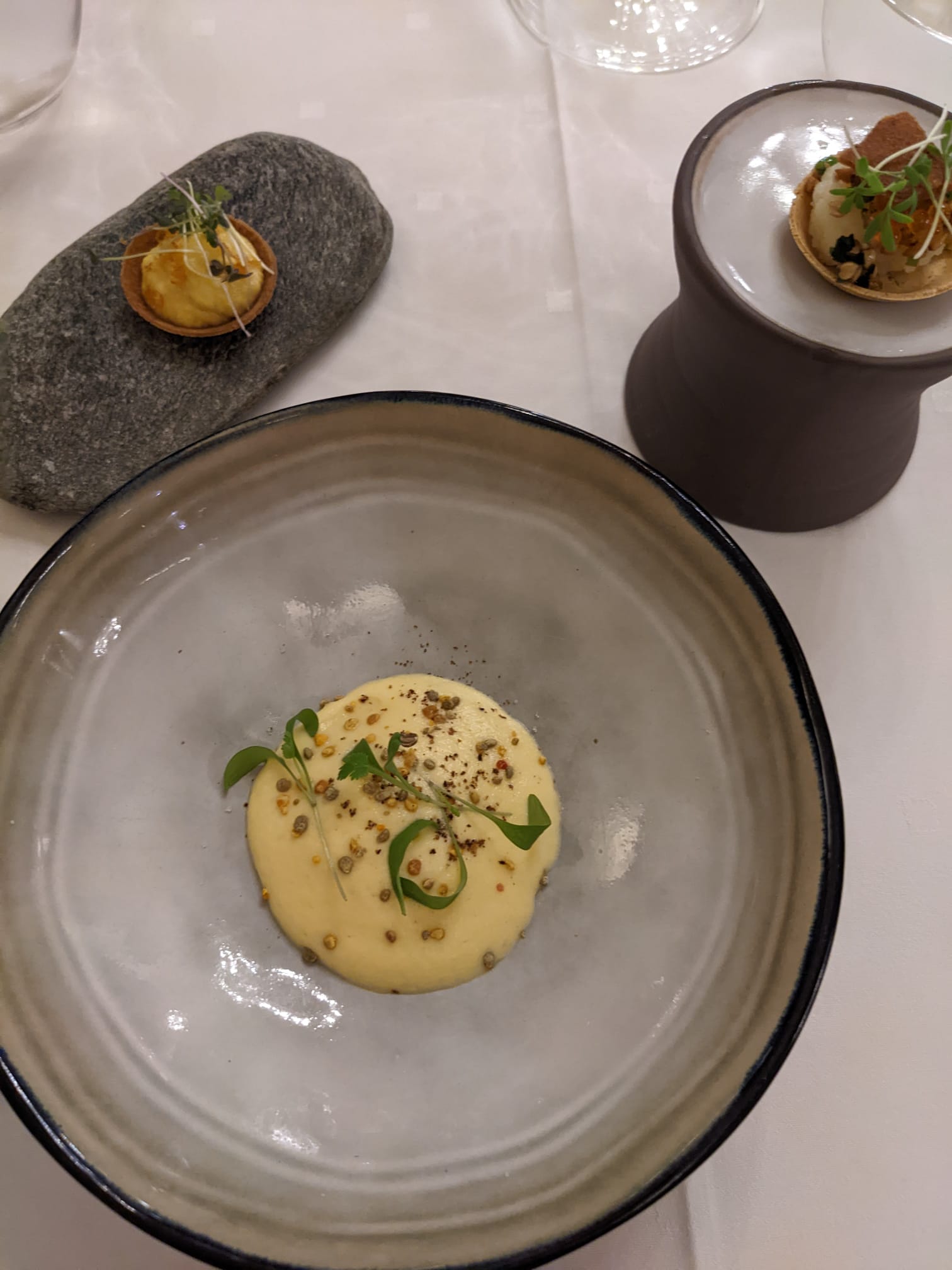 Très joli cadre. De très bons plats mais quelques bémols quand même.... Service presque parfait juste le serveur qui avait un peu de mal à nous dire ce qu'il y avait dans les plats... Les premières mise en bouche et la 1ere entrée ras. La 2e entrée choux fleur oeuf micuit un peu bizarre mais c'est bien passé. Le plat de lotte et le plat de canard très parfait. Prend dessert : soucoupe volante avec la mousse beaucoup trop dure et pas aimé du tout le goût 😂😂. Et le dessert minimaliste mais très bon. Mignardises ras.