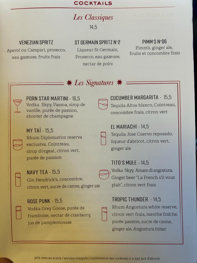 Cher pour finalement pas grand chose. Tartare à 24€… 50% plus cher qu’ailleurs à Paris. Pizza à 22€ mais d’une taille très modeste. Verre de rosé à 9€50 …. à siroter. Personnel sympa et lieu toujours aussi typique. Beaucoup d’étrangers ce qui explique peut être les prix ? Et… très bruyant, insupportable quand un enfant hurle non stop 😕