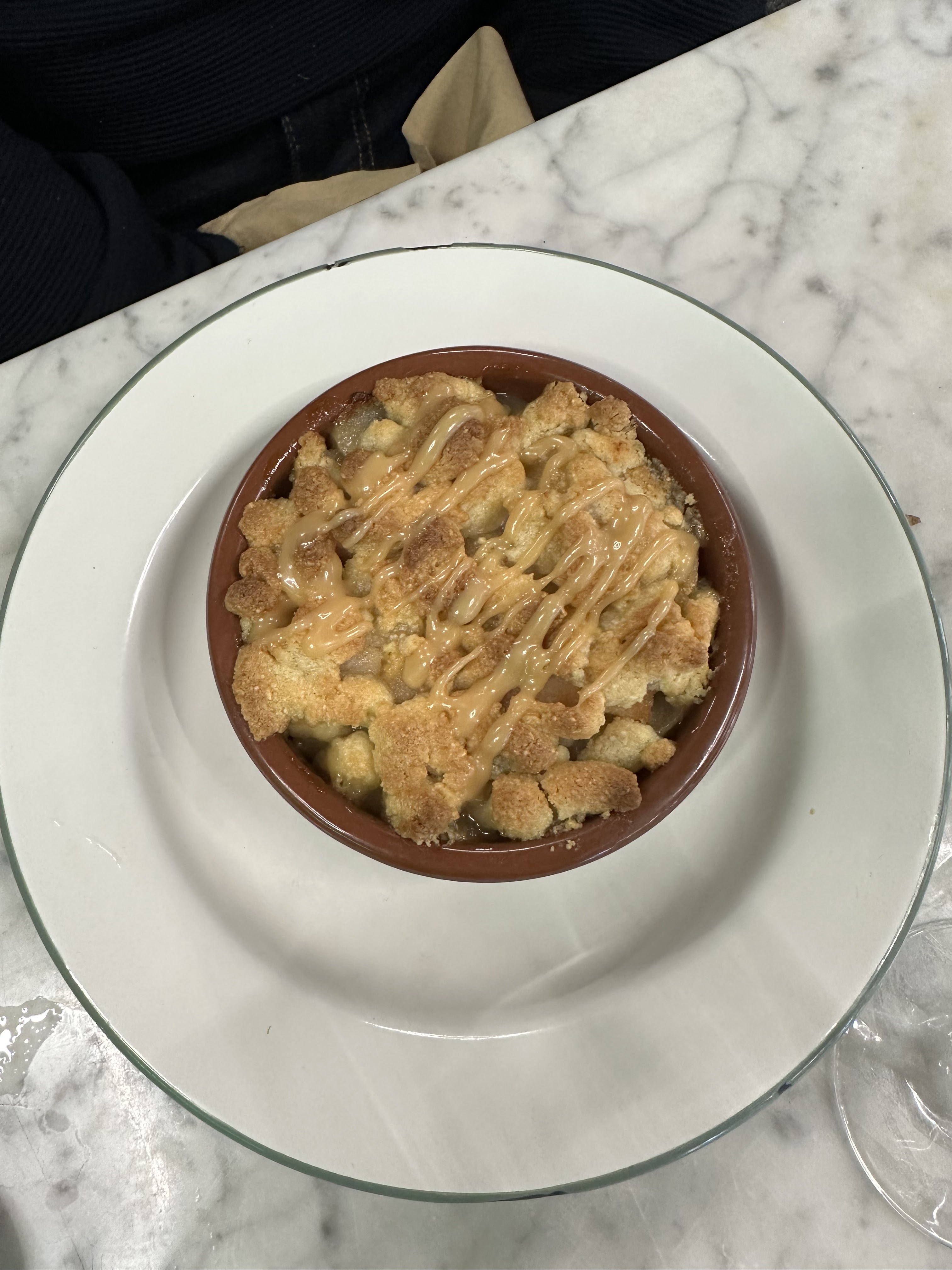 Cadre sympa mais bruillant. Les employés font de leur mieux. On est arrivé pour 20h et il n'y avait plus l'entrée que je voulais. Alors j'ai pris une soupe qui est arrivée à peine tiède et pas du tout copieuse manque de sel et d'épices.j'avais faim et j'ai mangé du pain. J'ai ensuite pris un tartare de saumon, très bien présenté mais j'avais faim et il n'y avait pas assez de garniture, bon mais pas assez en quantité. Le dessert était très bien le crumble j'ai aimé. Le prix était excessif pour le repas... mon chéri avait lui aussi encore faim.