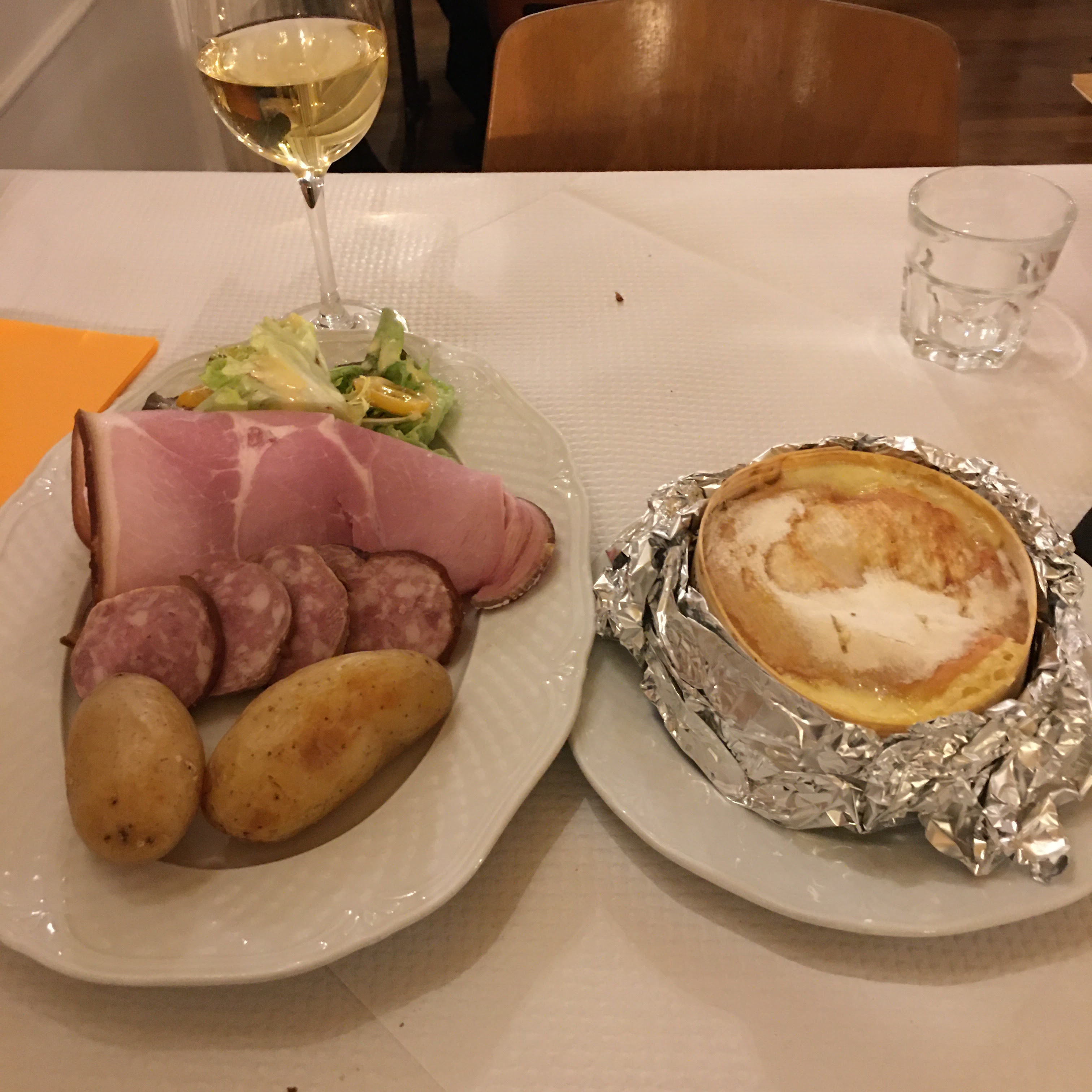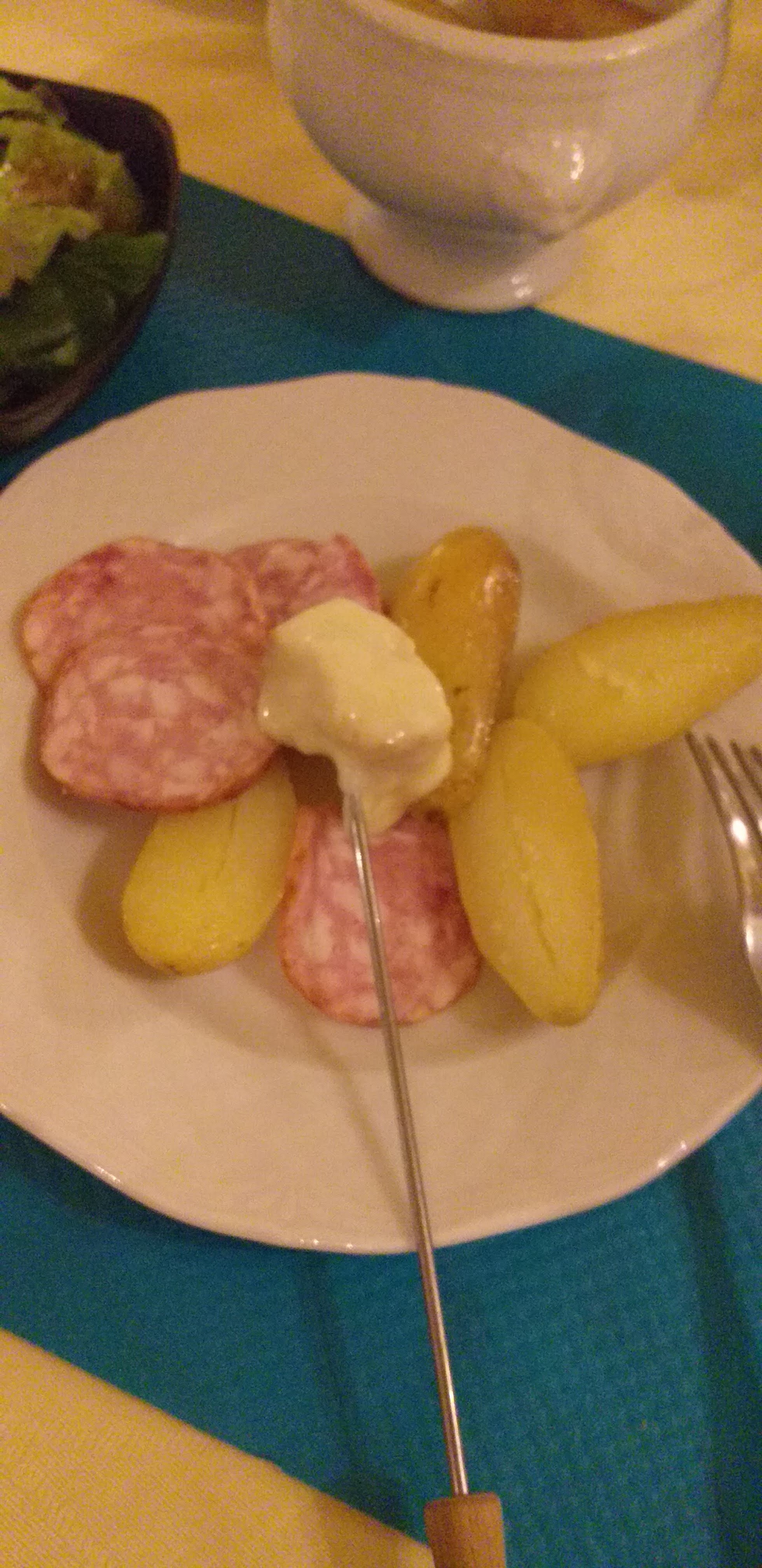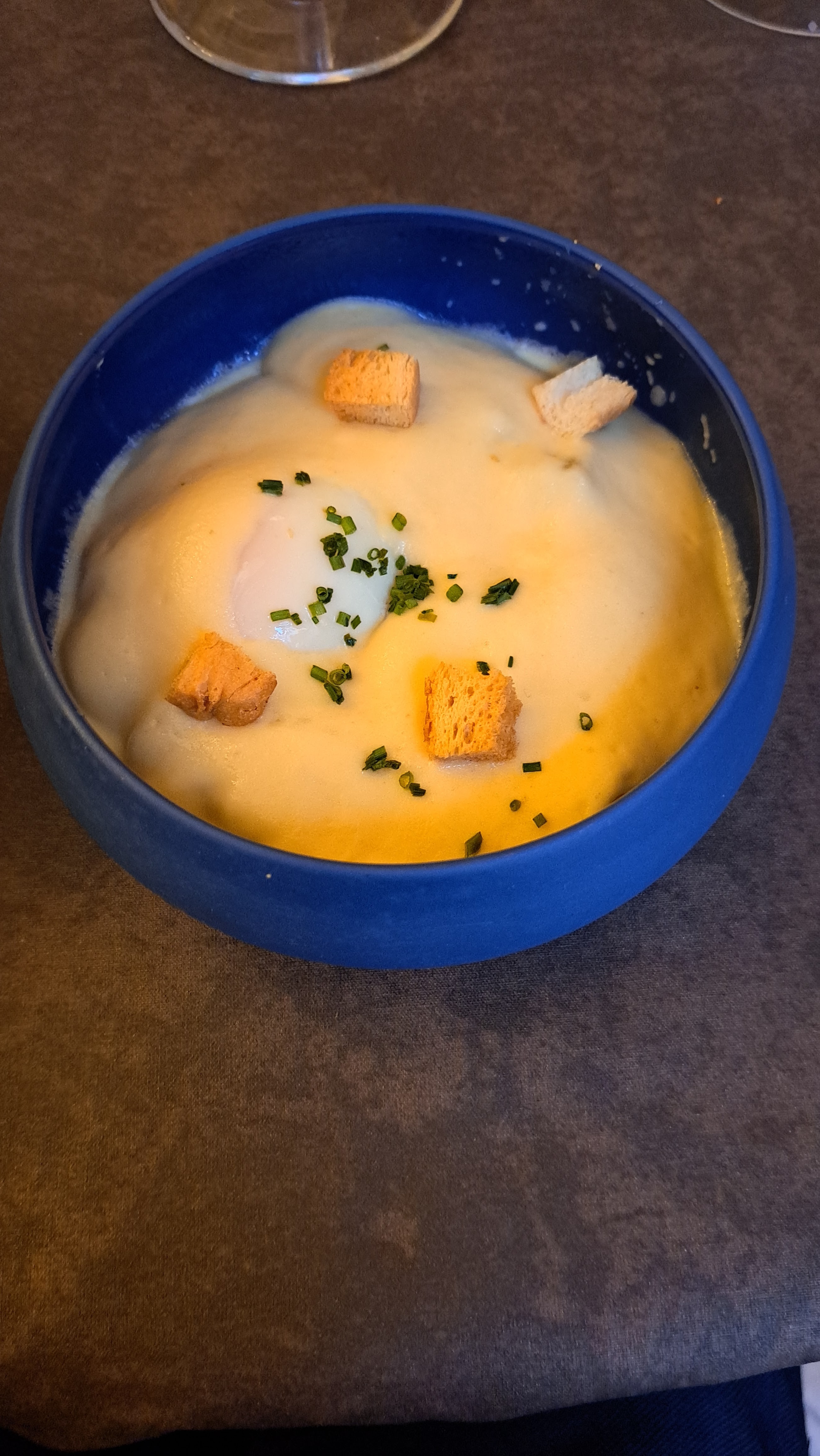 Accueil souriant, fondue au vin jaune bien équilibrée accompagnée d'un verre de Pouilly Fumé. Un finger de crème brûlée et sa crème glacée au vin jaune qui aurait mérité une crème plus intense et une cuillerée de glace plus volumineuse.