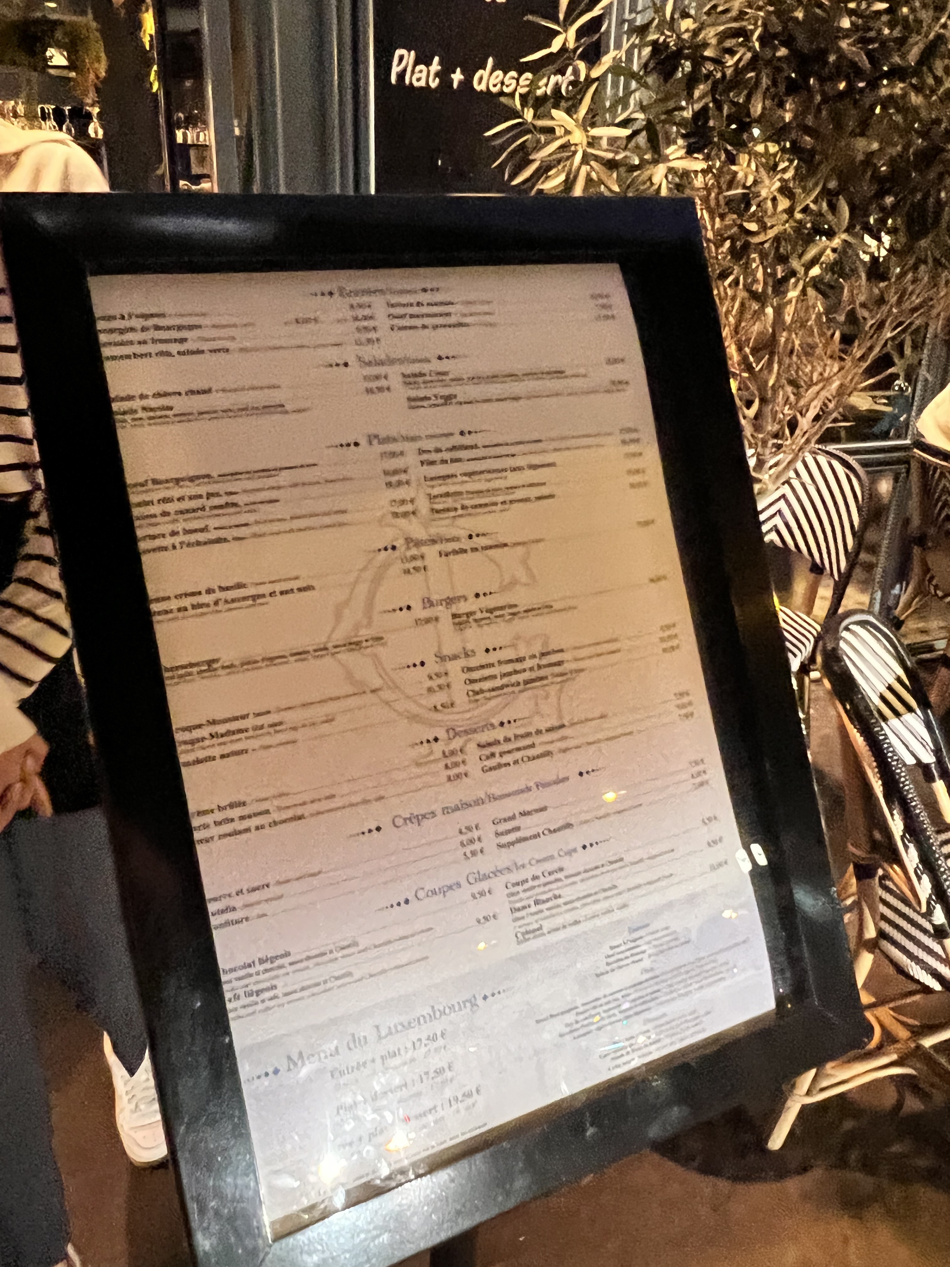 Magnifique endroit face au jardin du Luxembourg. Le personnel est très gentil, accueillant et me laisse pratiquer mon français approximatif. Ils parlaient également un anglais excellent et étaient heureux de nous aider à comprendre le menu. La salade de chèvre chaud et la salade niçoise étaient délicieuses et rafraîchissantes.
