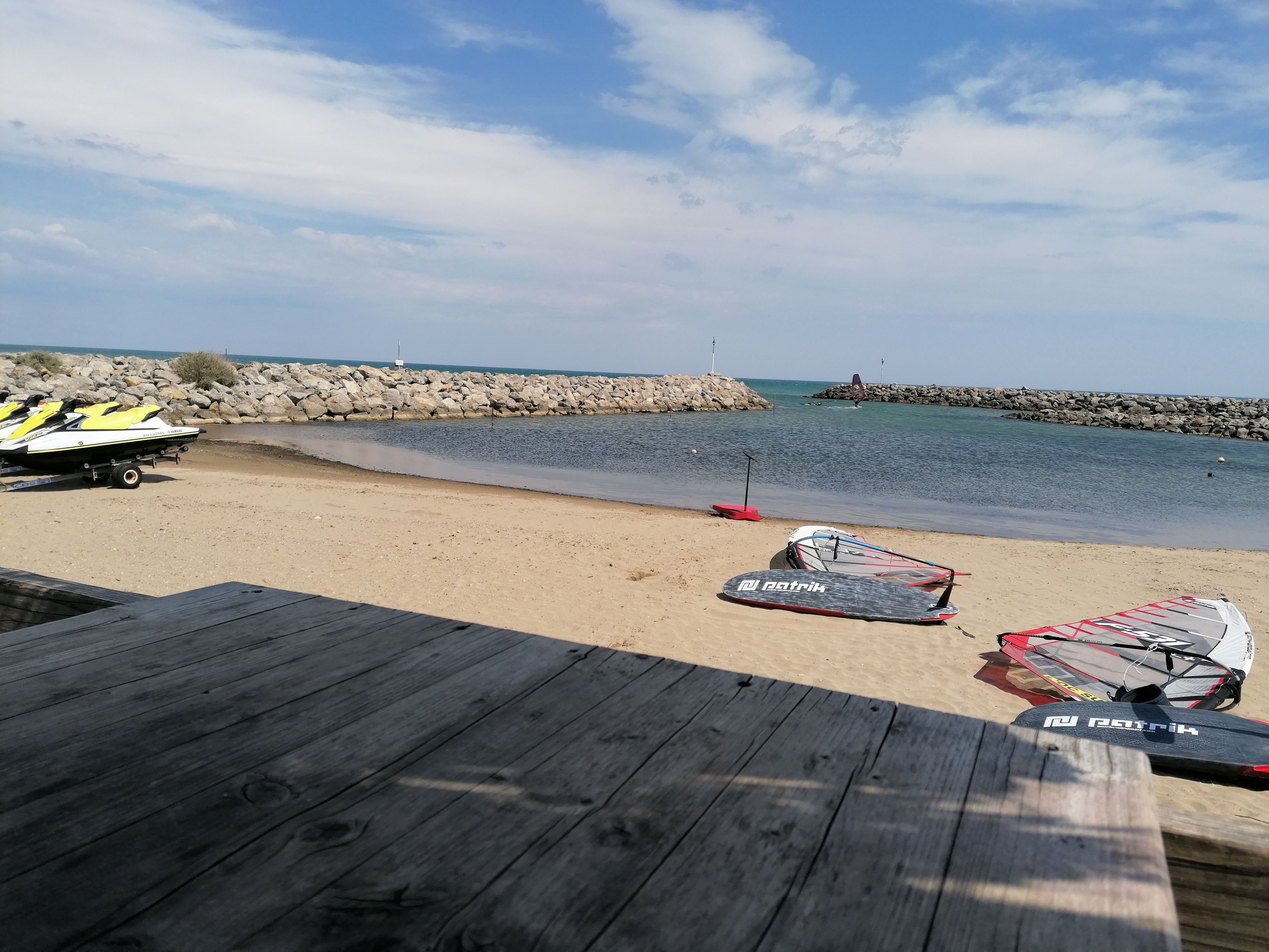 Super emplacement super équipe un endroit idéal pour boire un café le matin, déjeuner ou diner et boire une mousse après une session windsurf