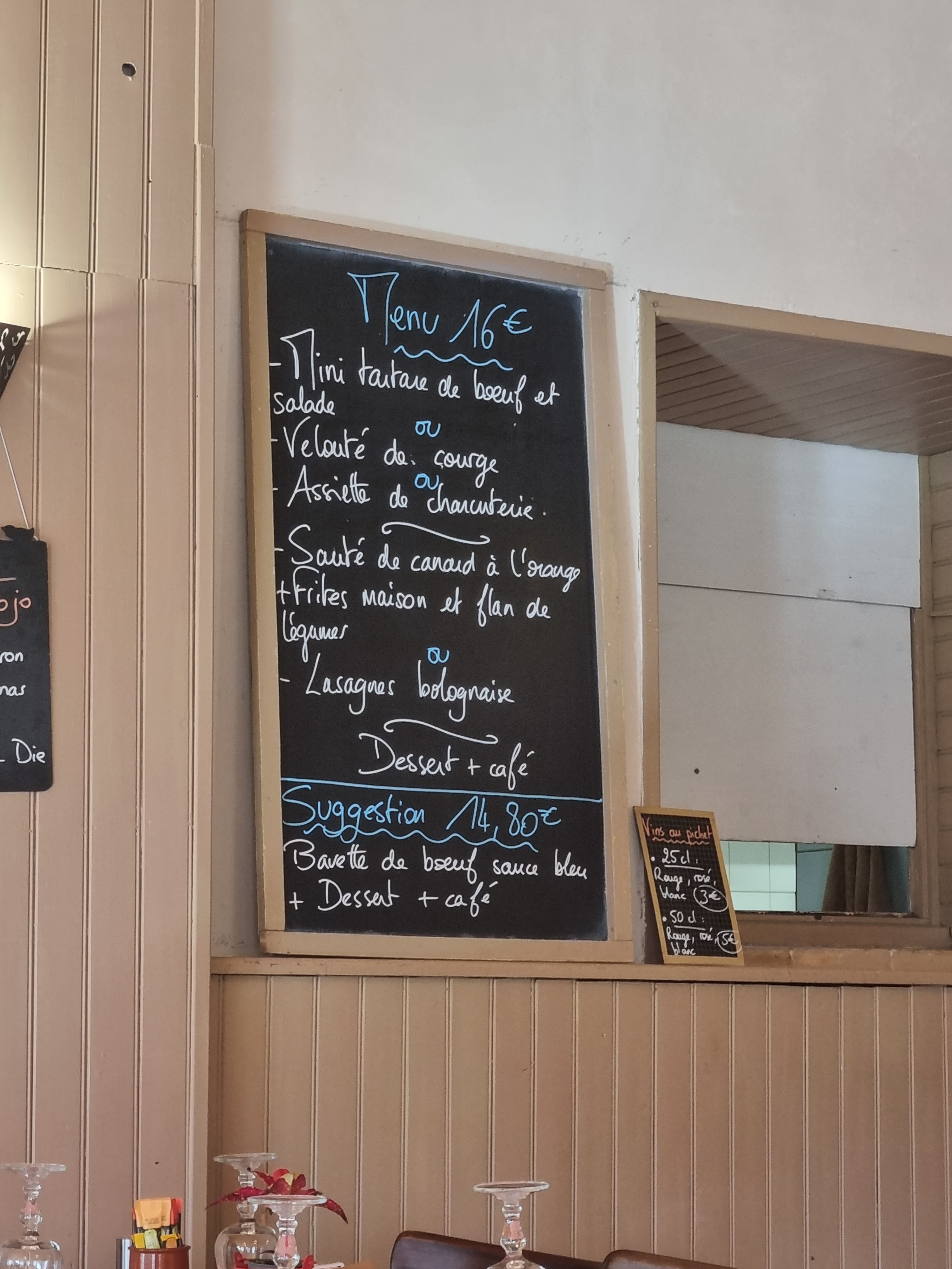 Nous sommes allés chercher notre clairette à Die...Nous sommes arrivés à 13h dans ce restaurant nous avons super bien manger pour 16 euros (vraiment pas cher pour notre époque),un menu avec entrée,plat,dessert et café. Tout été goûteux et suffisant avec une serveuse au top