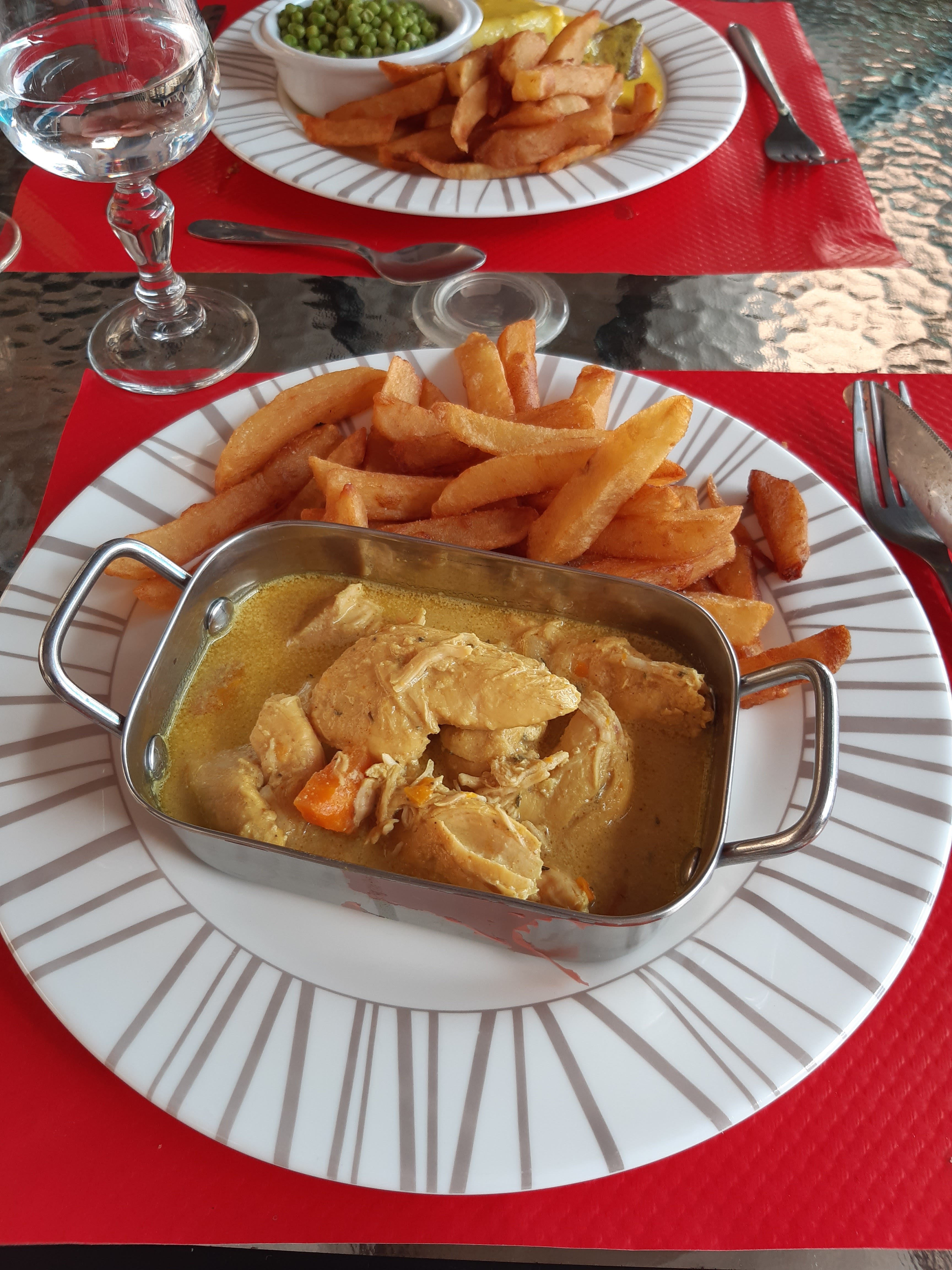 Très bon restaurant on s'est régalé velouté de moules et pour ma part saucisse au vin rouge accompagné de pommes de terre vapeur filet de merlu au citron et pomme de terre vapeur on avait le choix aussi du riz 2 apéros 2 cafés et le tour pour 38,50 € 🙏