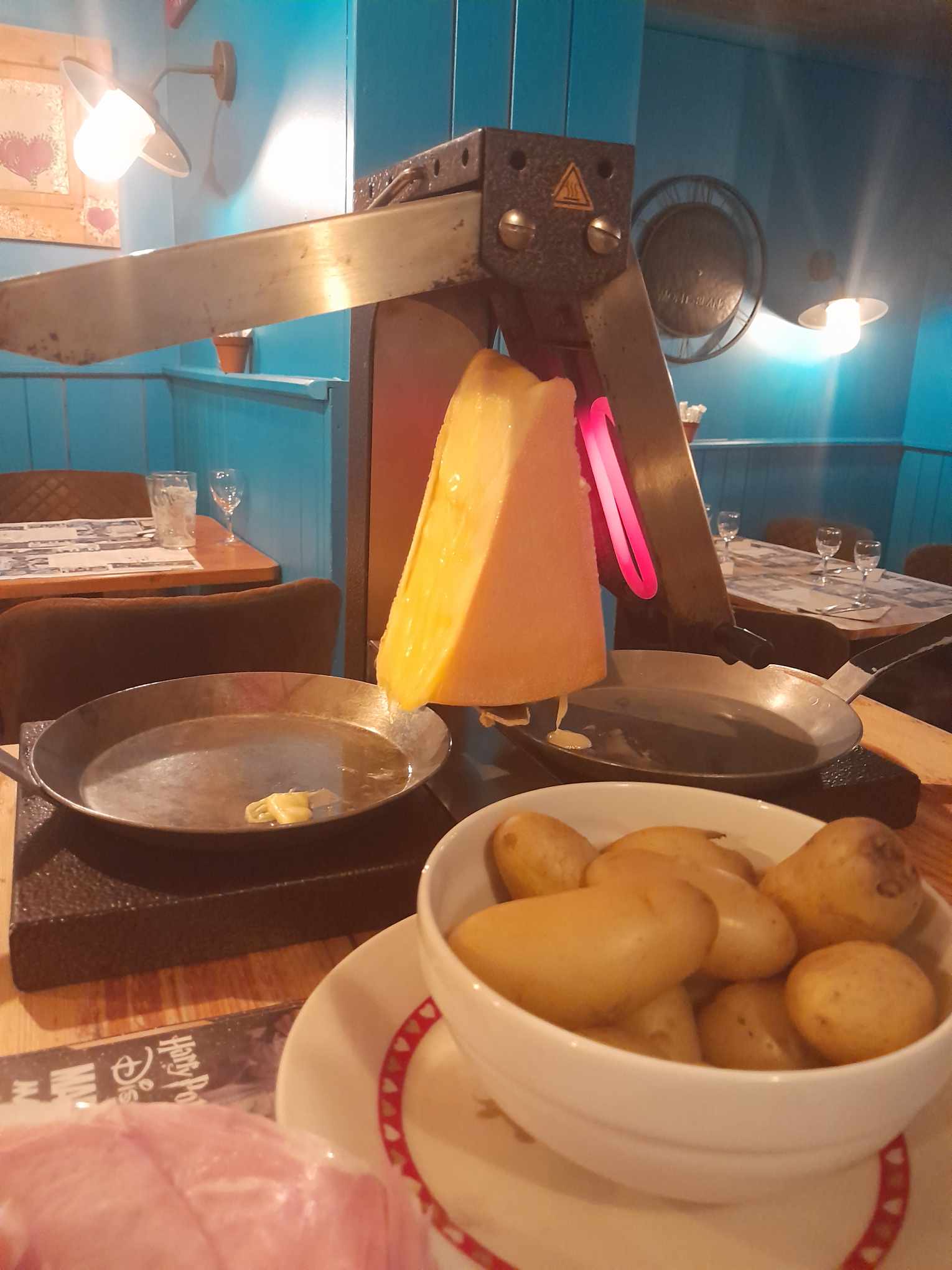 Délicieux très bien servi rien à dire sur le repas juste la contrainte des fils pour la raclette franchement vraiment très bon en famille de 4 2 adultes et un ado et un enfant qui adore les raclettes je le conseille