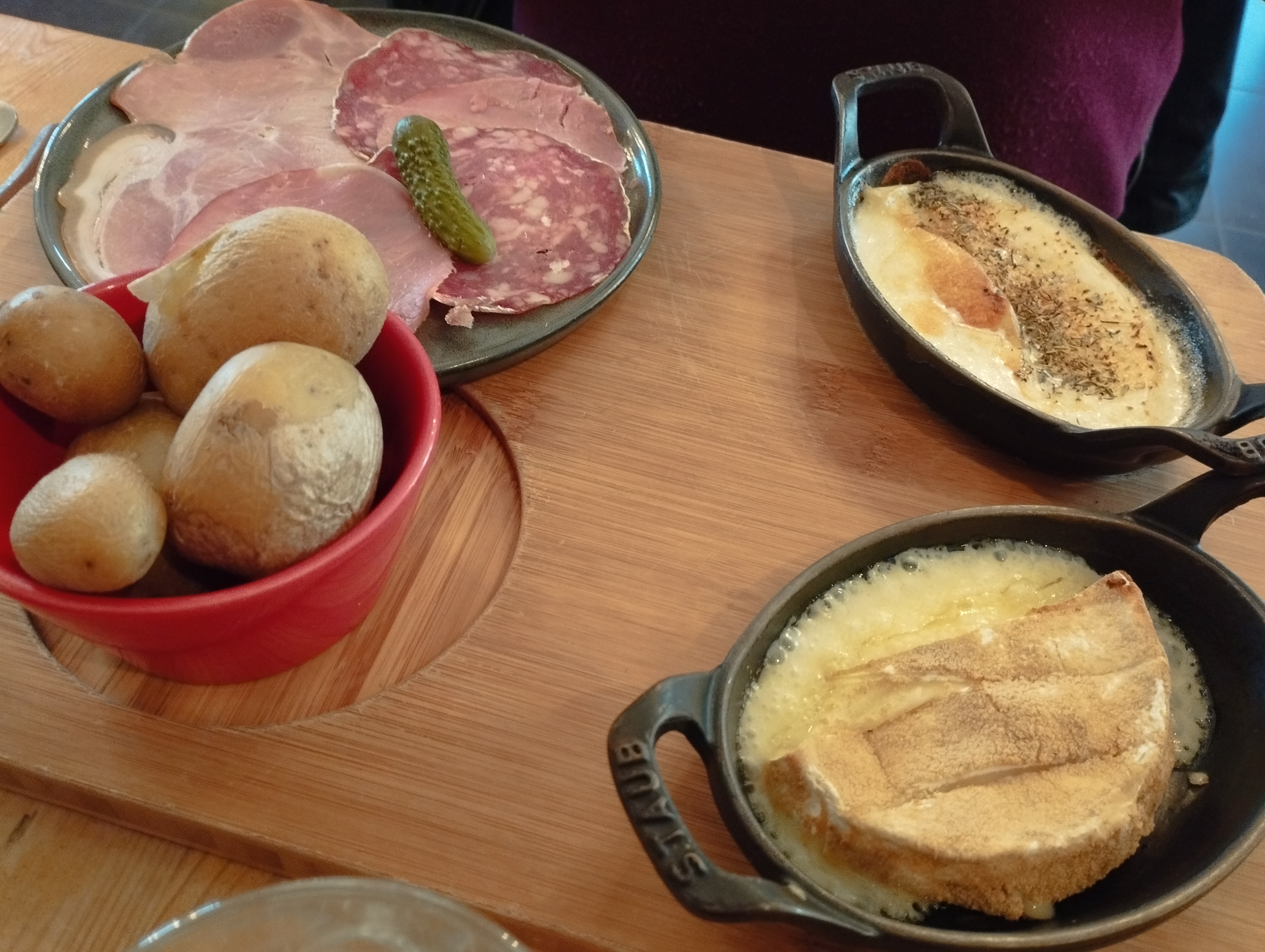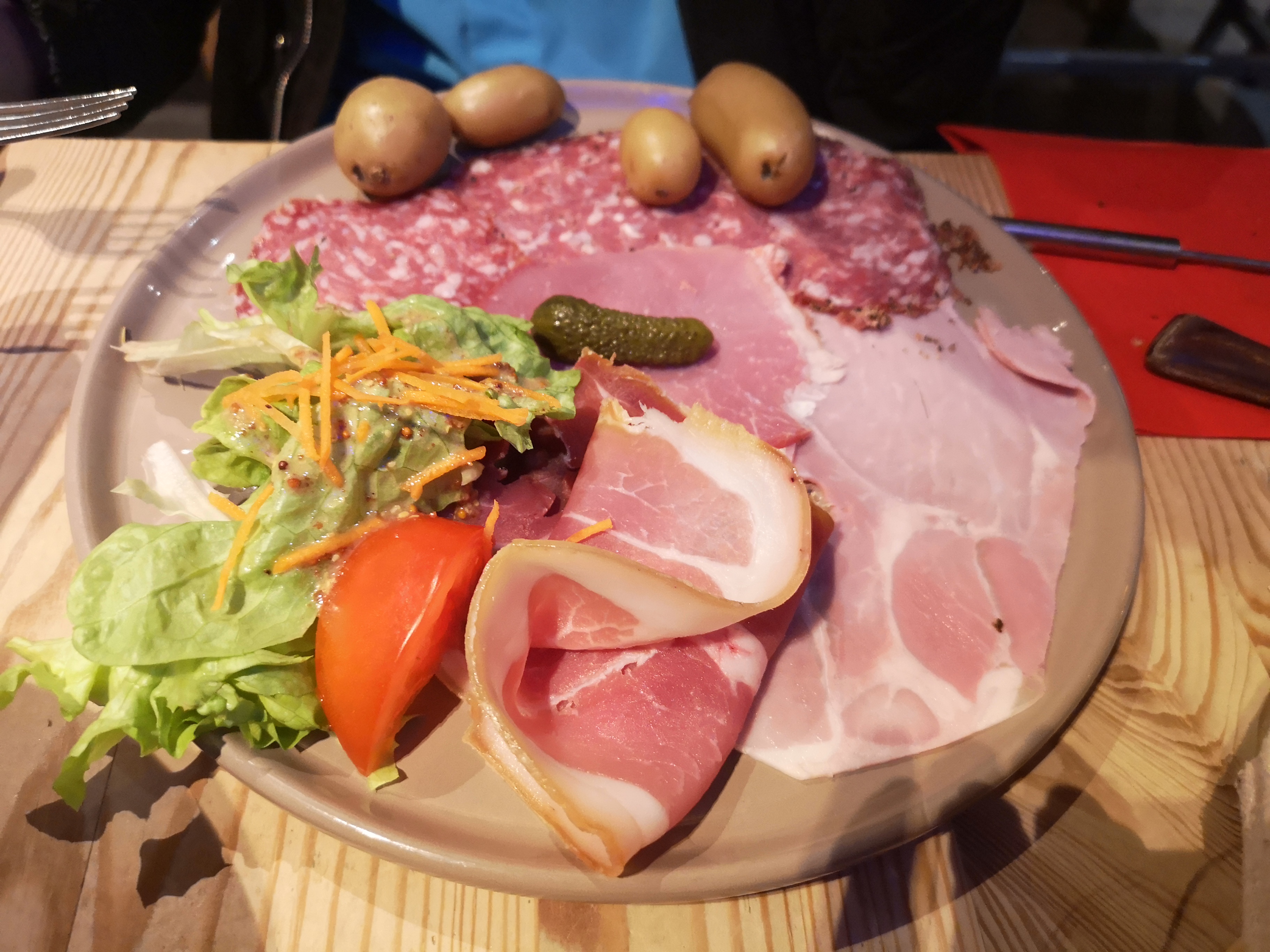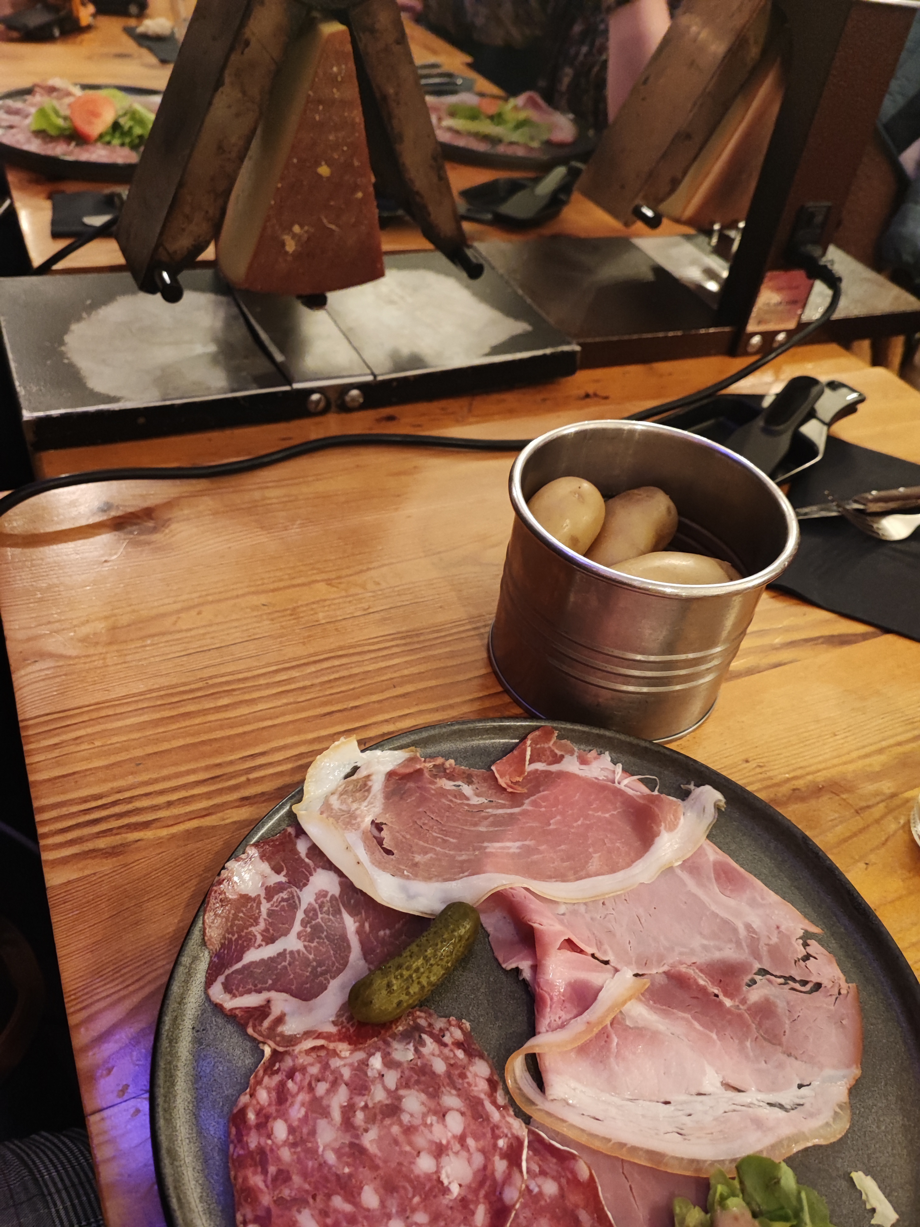On a très bien mangé. Nous étions végétariens donc la charcuterie fut remplacée par une quantité très généreuse de salade et 1 oeuf au plat, c'était parfait pour accompagner pdt et fromage ! La raclette était bonne. J'ai bien aimé la décoration façon chalet, mais j'ai eu une impression de cantine. La disposition des tables ou l'agencement de l'espace peut-être ? Bon service.