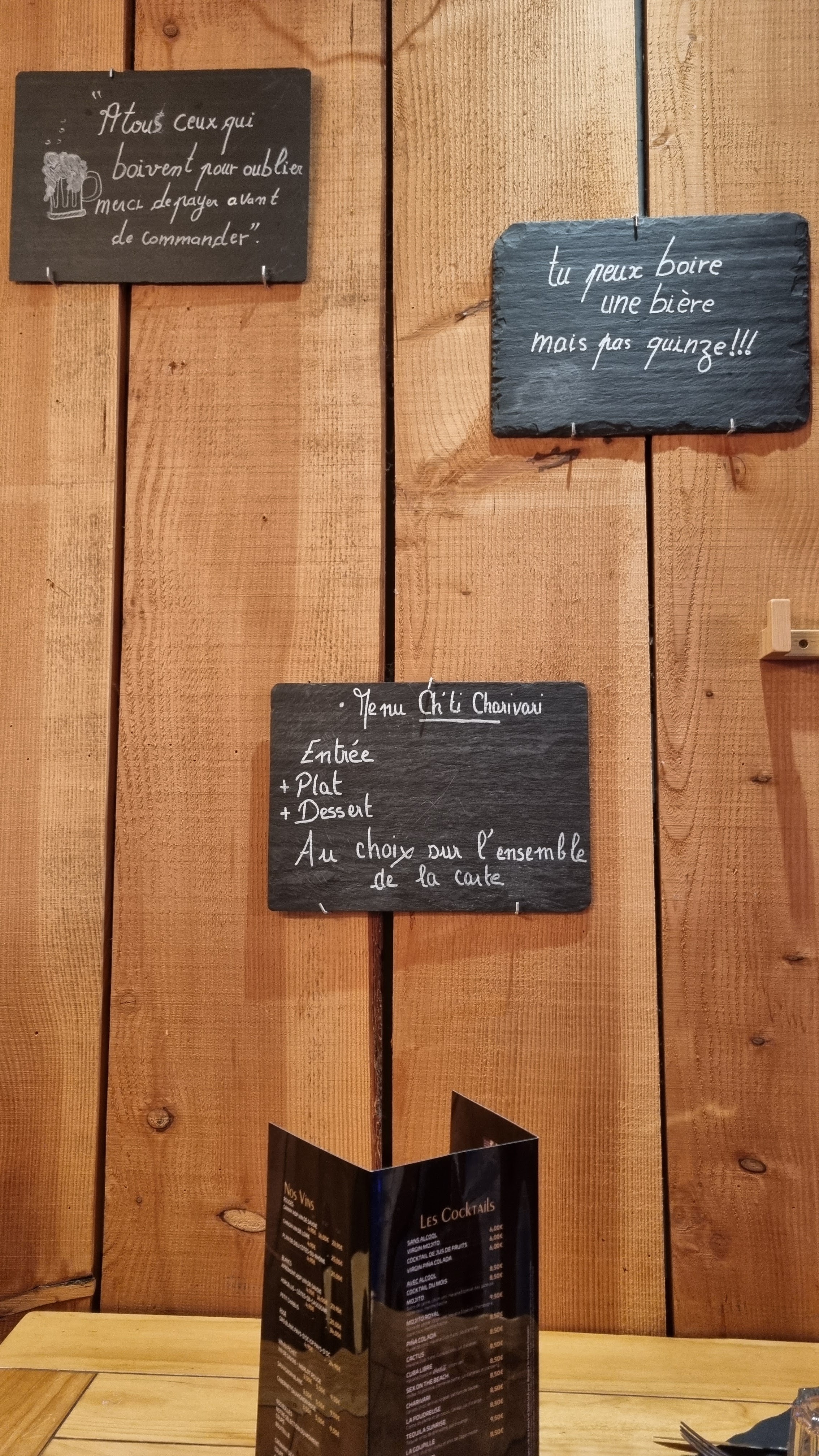 Ce mardi midi je suis allé avec mon épouse au Ch'ti Charivari , nous avons très bien mangé , il y une carte avec des prix pour tous , les plats sont très bon , et l'accueil est chaleureux . Je vous le conseil a tous sans hésitations .