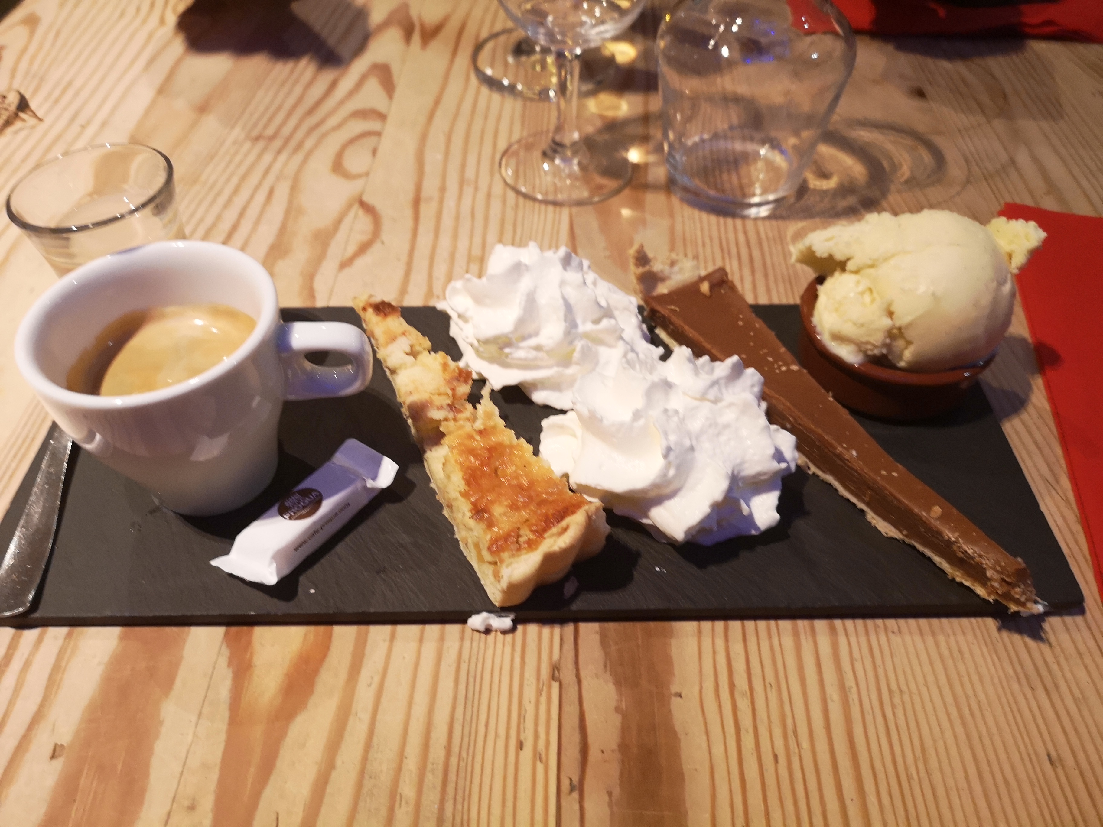 3 étoiles pourquoi Malgré un très bon moment passer un très bon repas une serveuse très gentil très professionnel et surtout à l'écoute. Un responsable derrière le bar très absent qui nous voit à l'entrée est part se cacher a l'arrière avec son téléphone en main 27min pour avoir les boissons qu'il doit préparer alors que nous avions déjà mangé la moitié de la planche et du saussicon. Pour l'entrée mon assiette ébréché a 2 endroits pour une assiette foncé ça ce voit directement. Au moment des plats 3 assiette sur 4 servi par le responsable au bout de dix minutes il a fallu réclamer l'assiette Les desserts commandé nous décidons de discuter un peut avec la serveuse 15 20 min passe la serveuse nous dit je vais allez voir pourquoi vos desserts ne sont pas encore sortie et la le responsable qui s'occupe du bar et des dessert lui répond que c'est parce quel discute avec nous (il reste deux table une de deux et nous) Que les desserts ne sont pas fait elle aurait dû les faire elle même. Mais enfin monsieur a part avoir était sur votre téléphone et avoir fait des erreurs que faite vous ici?