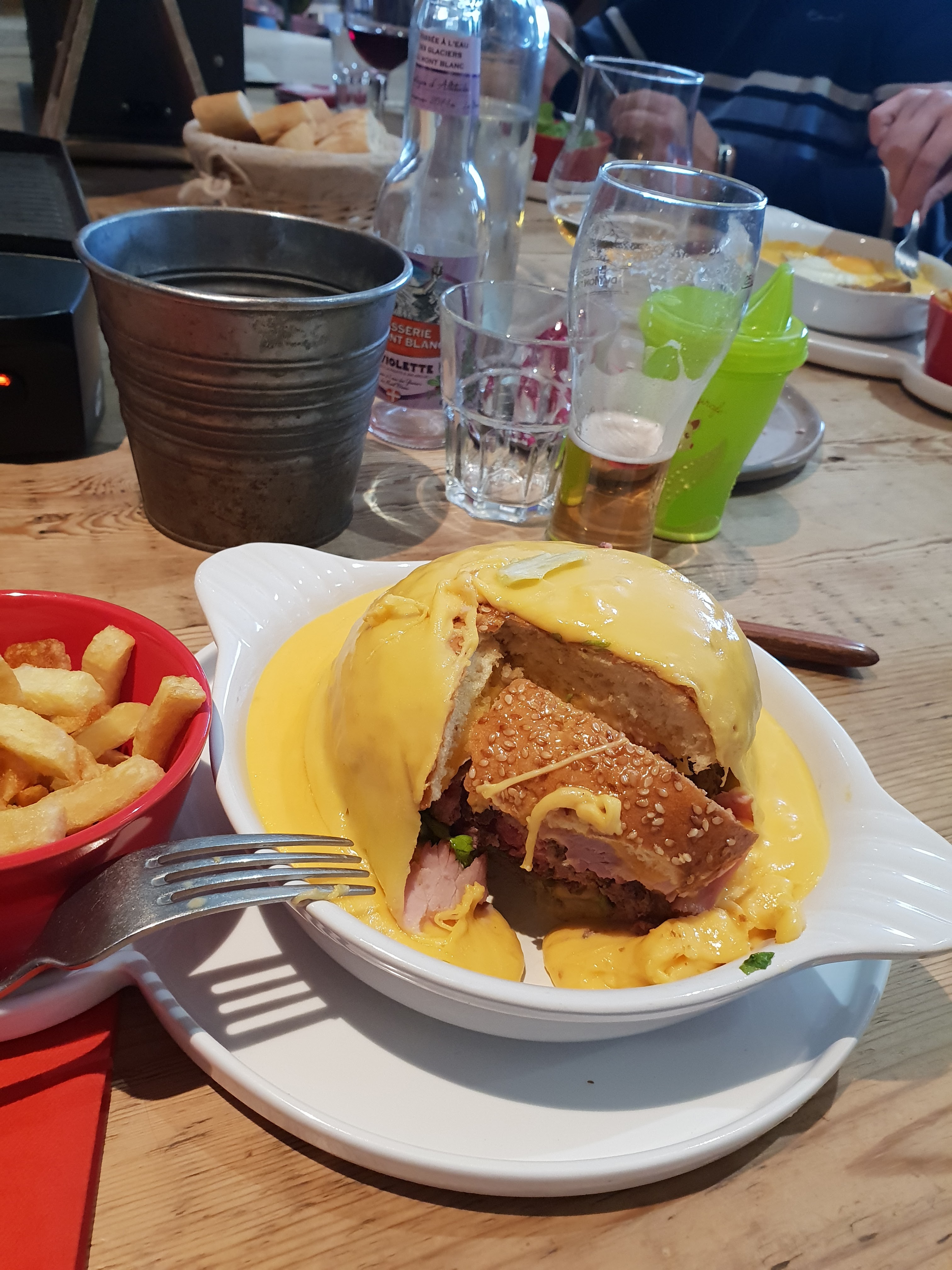 Repas à 4 samedi midi (2 adultes et 2 enfants). Presque une heure d'attente pour être enfin servis. Les enfants se régalent, le steack du burger et les frites sont très bons. Par contre le welsh pour Madame et le reblochon fondu pour moi sont à peine chauds. On mange quand même car on a très faim après toute cette attente et un rdv ensuite. Si on avait été servi plus tôt, on aurait bien sûr renvoyé ces plats pour les faire réchauffer. Là on n'avait plus le temps pour cela. Des excuses formulées à notre départ pour l'attente mais aucune explication ni dédommagement pour les plats pas assez chauds. Heureusement qu'il y a des posters de skieurs dans les WC pour le côté immersion en Savoie. Ca faisait longtemps qu'on était pas venu. Dommage on n'est pas prêts de revenir.