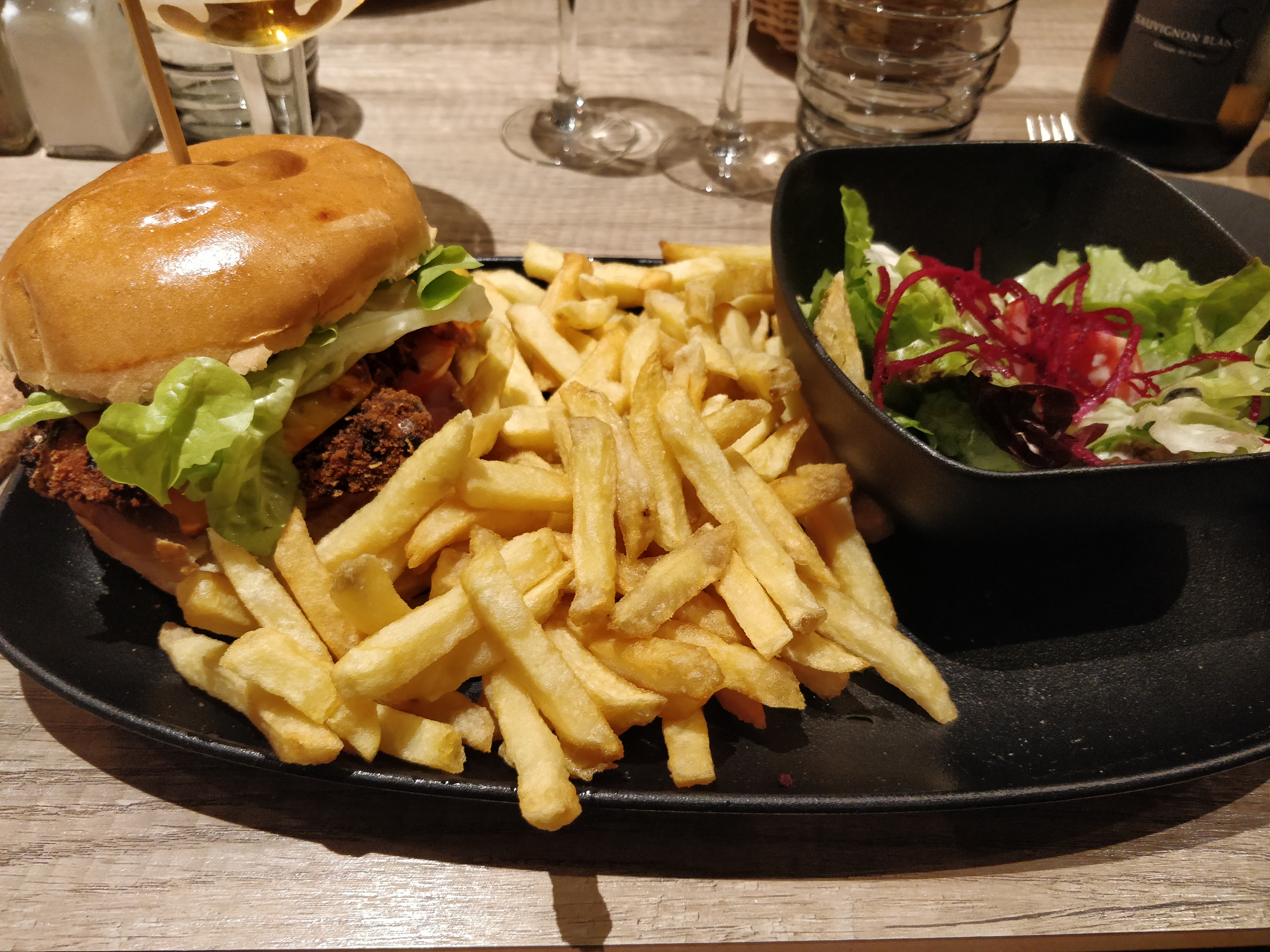 Excellente croûte savoyarde (pain, crème, lardons, oignons, raclette si je ne me trompe pas) Sur la deuxième photo il s’agit du burger végétarien qui a plu également. Les avis ne trompent pas !