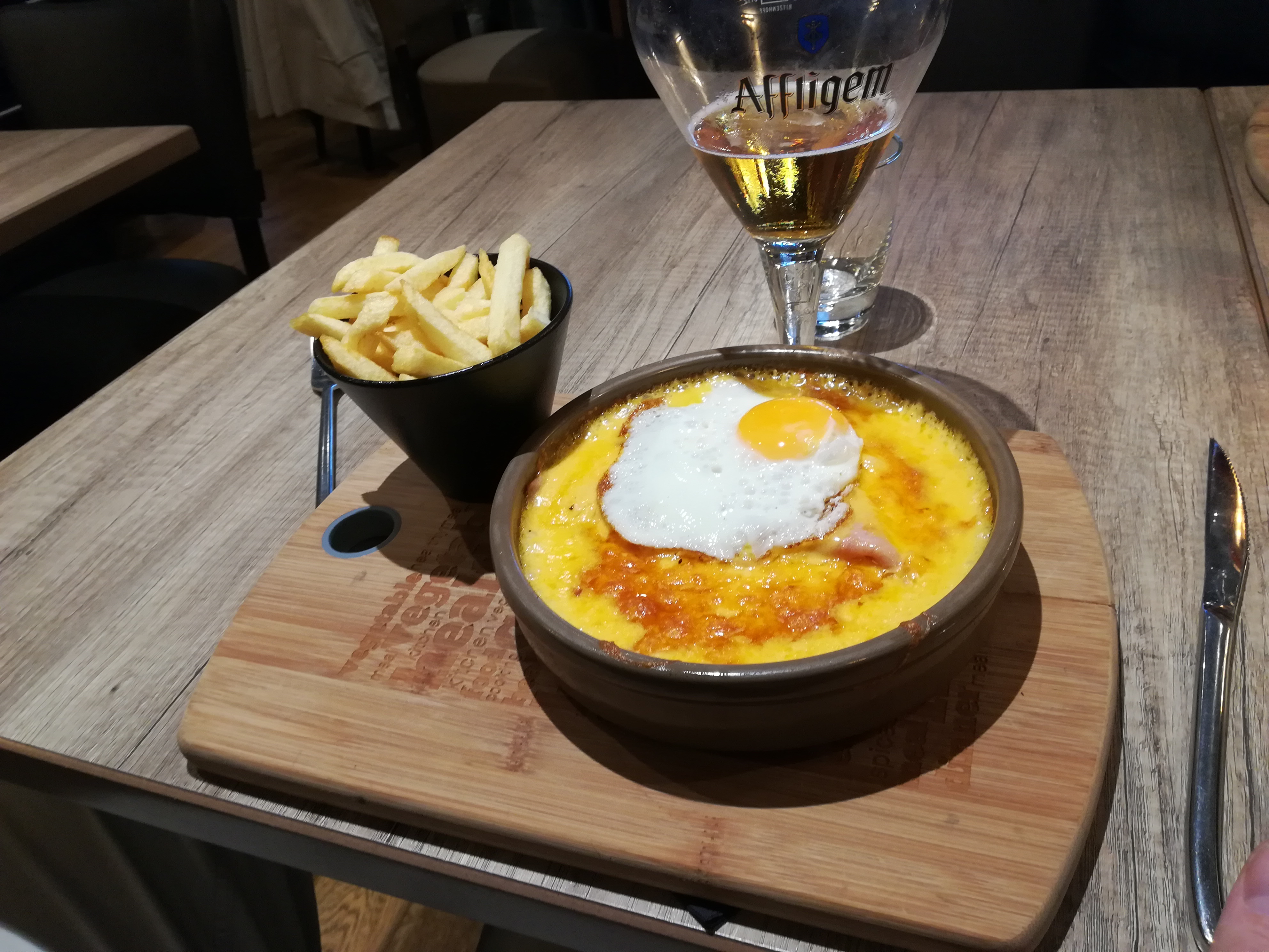 Visité lors de la RWC 23 lors d'un séjour à Arras. C'était l'un des rares restaurants ouverts le dimanche soir. Je suis entré et on m'a montré une table, j'ai commandé une bière chacun et j'ai regardé le menu. Nous avons choisi la tour de steak flamboyante (voir photo) entre 3 d'entre nous - nous sommes venus avec une petite salade de pommes de terre au fromage et nous avons commandé un bol de frites supplémentaire. Quelques bouteilles de rouge pour accompagner. La tour est sortie et du whisky chaud a été versé et incendié. Très théâtral et crée un arôme merveilleux. J'ai même réussi à allumer une serviette. De bons gros morceaux de bœuf de première qualité très savoureux, des pommes de terre également très délicieuses. Il a fallu du temps pour s'installer, mais après une pause, nous avons choisi les desserts - 2 crèmes brûlées et un tiramisu. Super endroit pour manger, personnel sympathique et ambiance agréable. Il y a un manque de taxis à Arras un dimanche soir - mais pendant le retour à l'appartement, nous avons trouvé un bar - donc tout s'est bien passé au final !