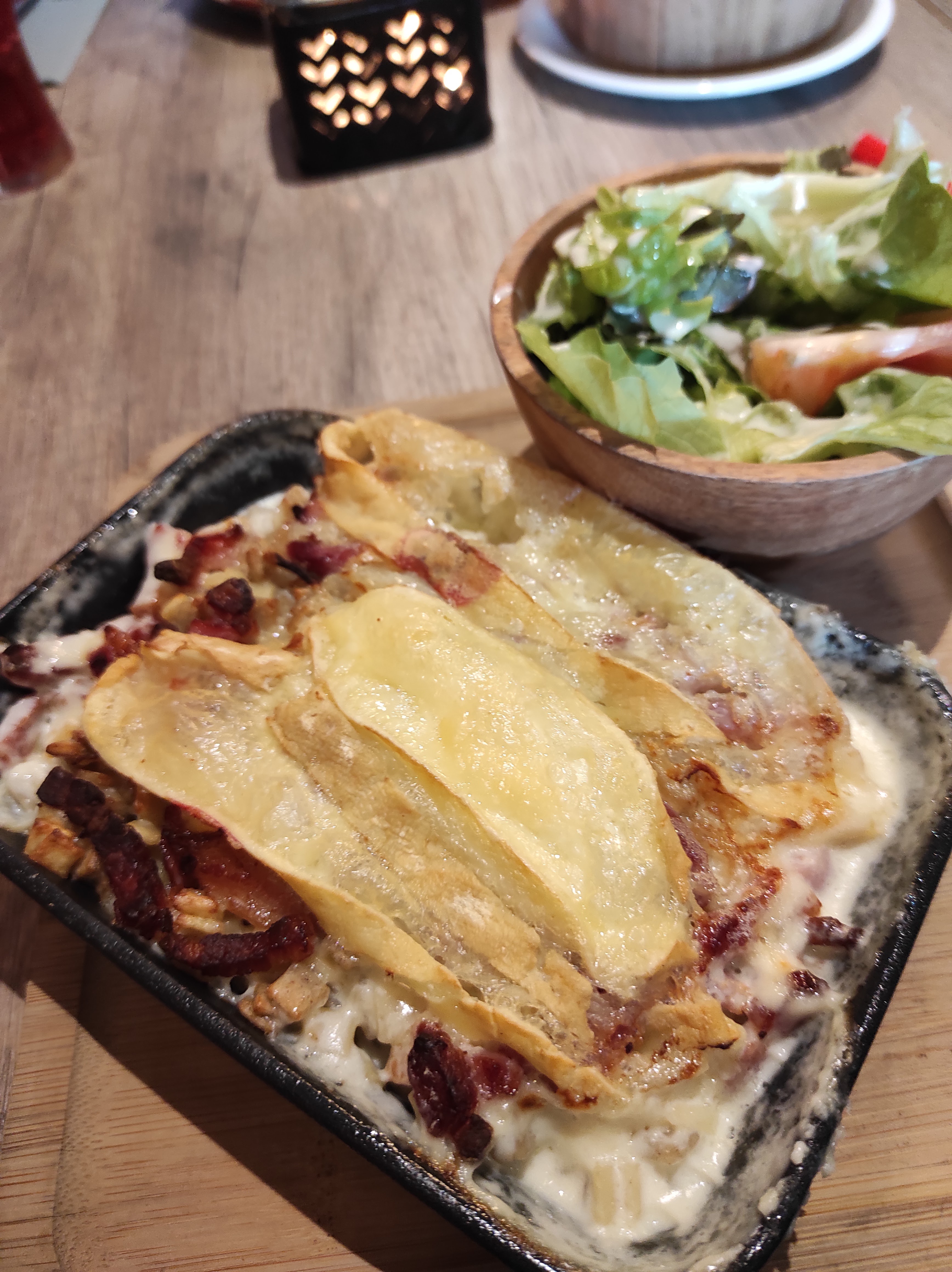 Lieu chaleureux et bon rapport qualité prix, nous avons pris une raclette avec une variante saumon, une excellente alternative à ceux qui ne mangent pas de viande, le fromage est excellent. Seul gros bémol pour un restaurant, les assiettes étaient en plastiques ! Et nous n’avions pas la meilleure table, une table pour deux en plein milieu sans cesse bousculée par le serveur qui n’y peut rien le restaurant est petit mais zéro intimité. Restaurant à privilégier plutôt entre amis qu’en couple. L’équipe à l’accueil et les serveurs sont au top : dynamiques et sympathiques !