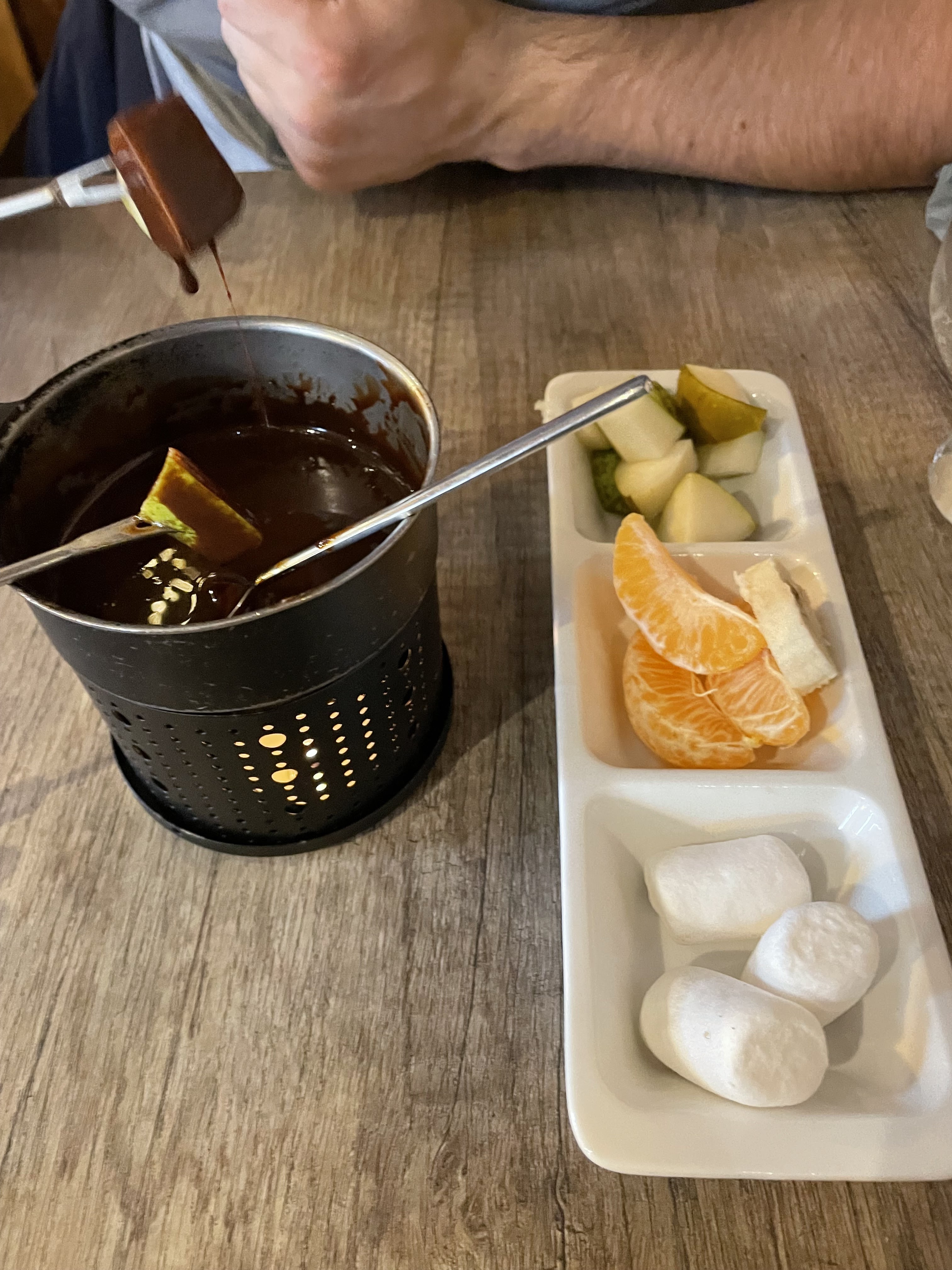 Excellente soirée dans une bonne ambiance. Bien reçu malgré une heure tardive d’arrivée (22h). Les fondues étaient très bonnes avec une belle assiette de charcuterie. ´l’iris coffee était aussi réussi. J’y retournerai sans problème