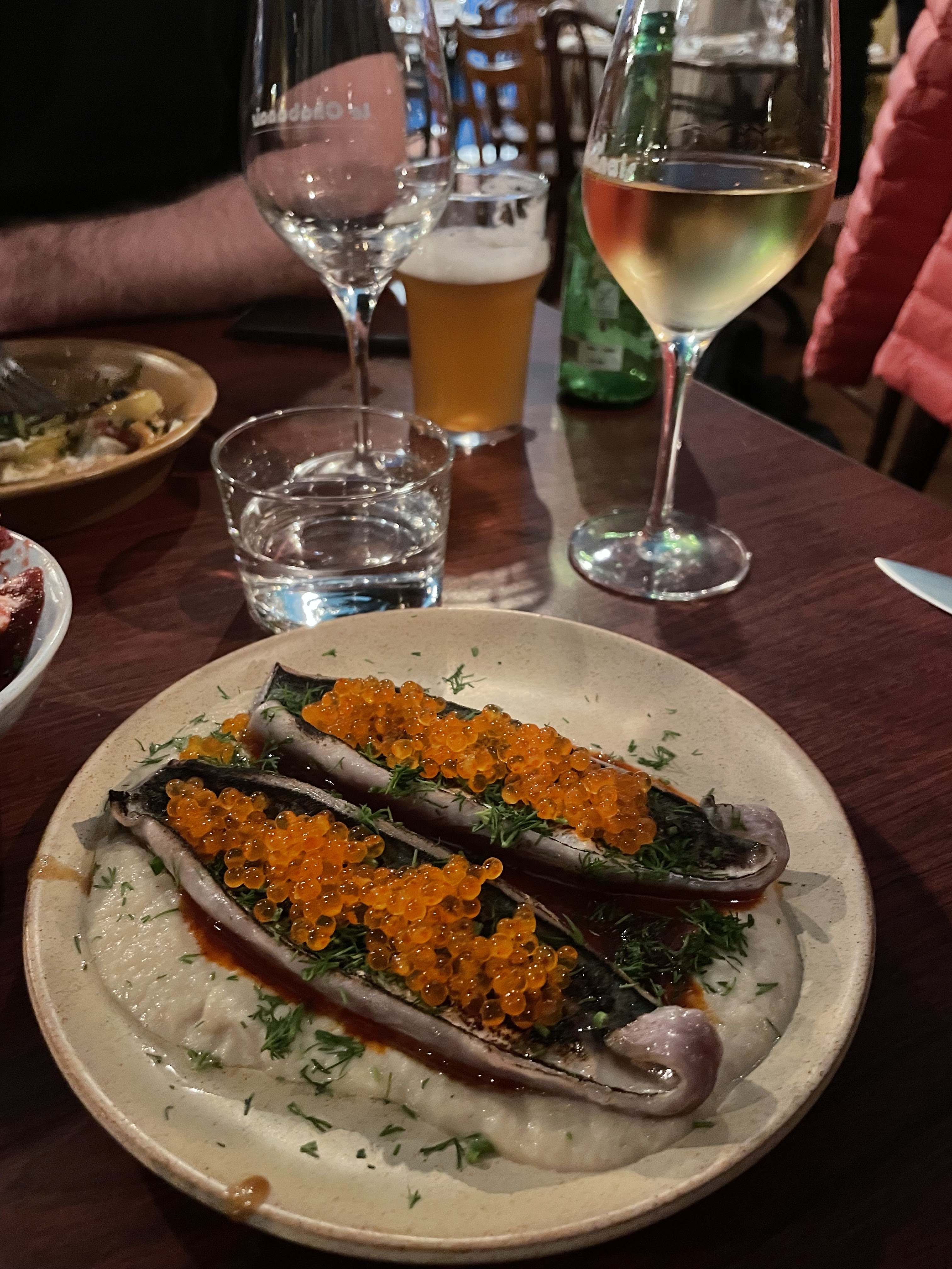 Côté plats, des tapas à la française à partager : de très bons produits, très bien travaillés nous nous sommes régalés. Des vins plutôt typés nature très intéressants, une large sélection de vins au verre. Le tout avec un service souriant : une très belle soirée.