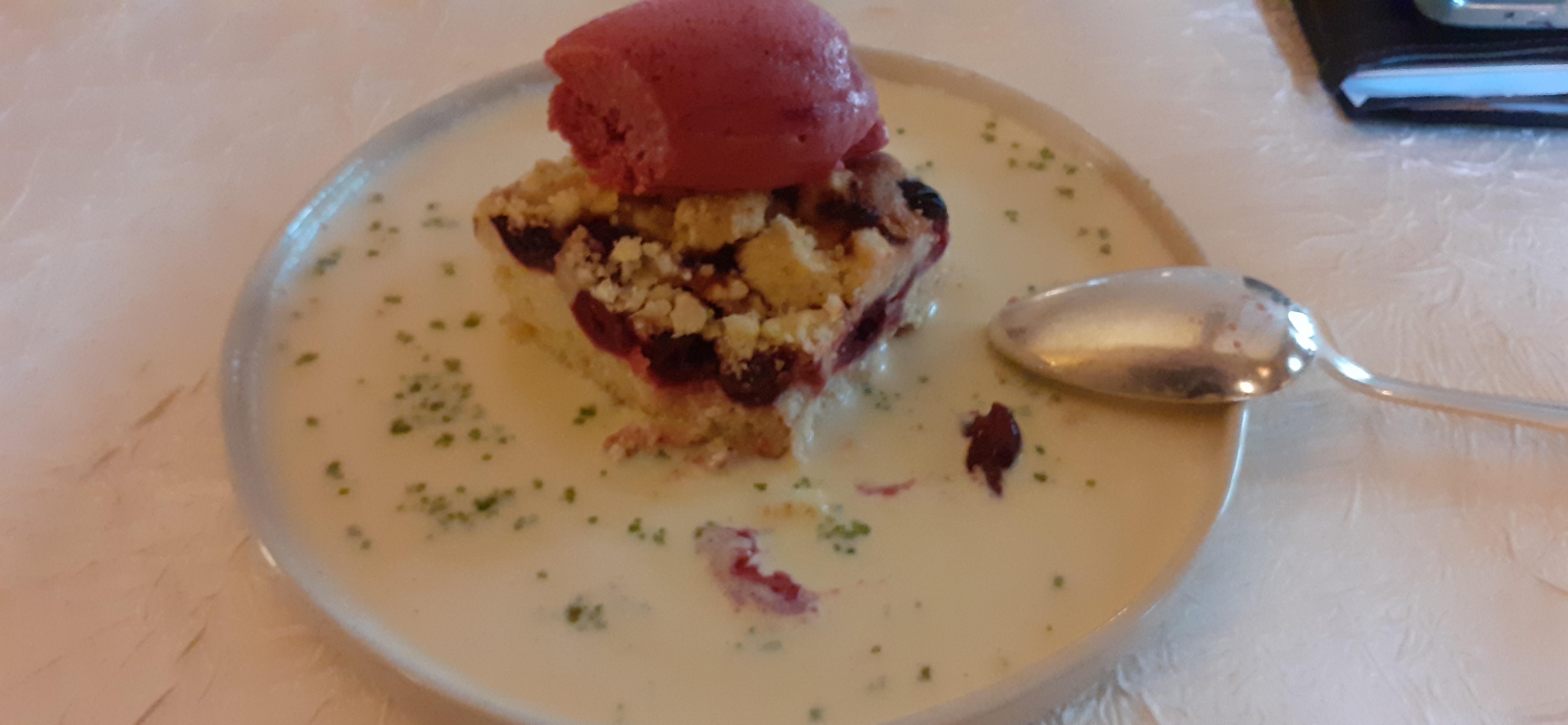 Le plat était excellent mais les desserts sont un peu trop à l'ancienne à mon goût. C'est-à-dire que le dessert faisait très traiteur des années 80/90 : en soit ce n'est pas grave, mais c'est vrai qu'on s'attend à une touche au moins à la hauteur du plat lorsqu'on va au restaurant, surtout que le cadre s'y prête. Je suis peut-être exigeant mais je pense que la carte des desserts mériterait un réel coup de fouet pour attirer plus de clients. J'ai aussi beaucoup aimé l'emplacement entre les tables, et les personnalités des personnes en service.