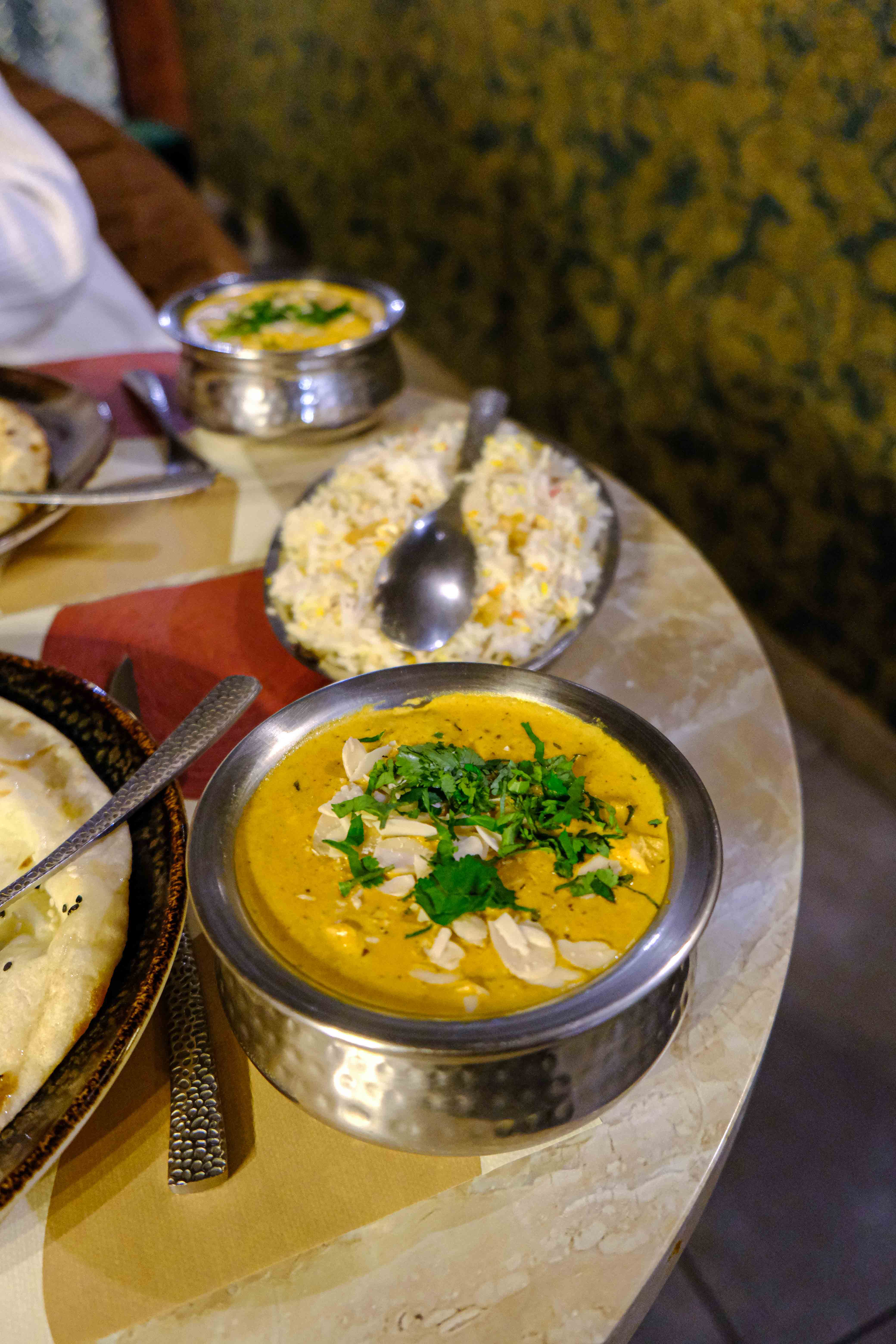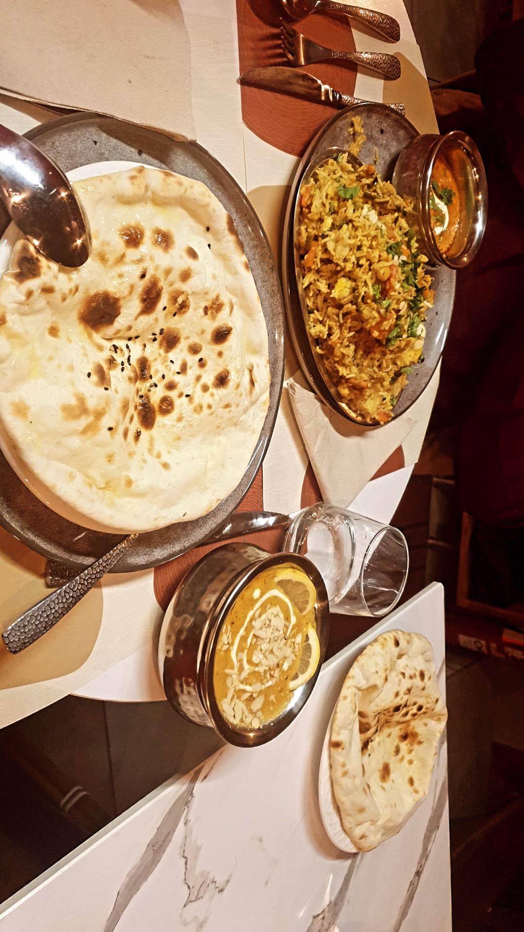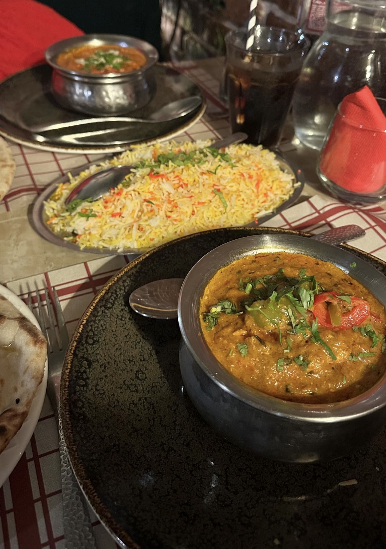 Bonne ambiance, repas copieux et serveurs souriant toujours à l'écoute. Nous avons mangé commodément sur un joli canapé. Je recommande l'agneau Biryiani.