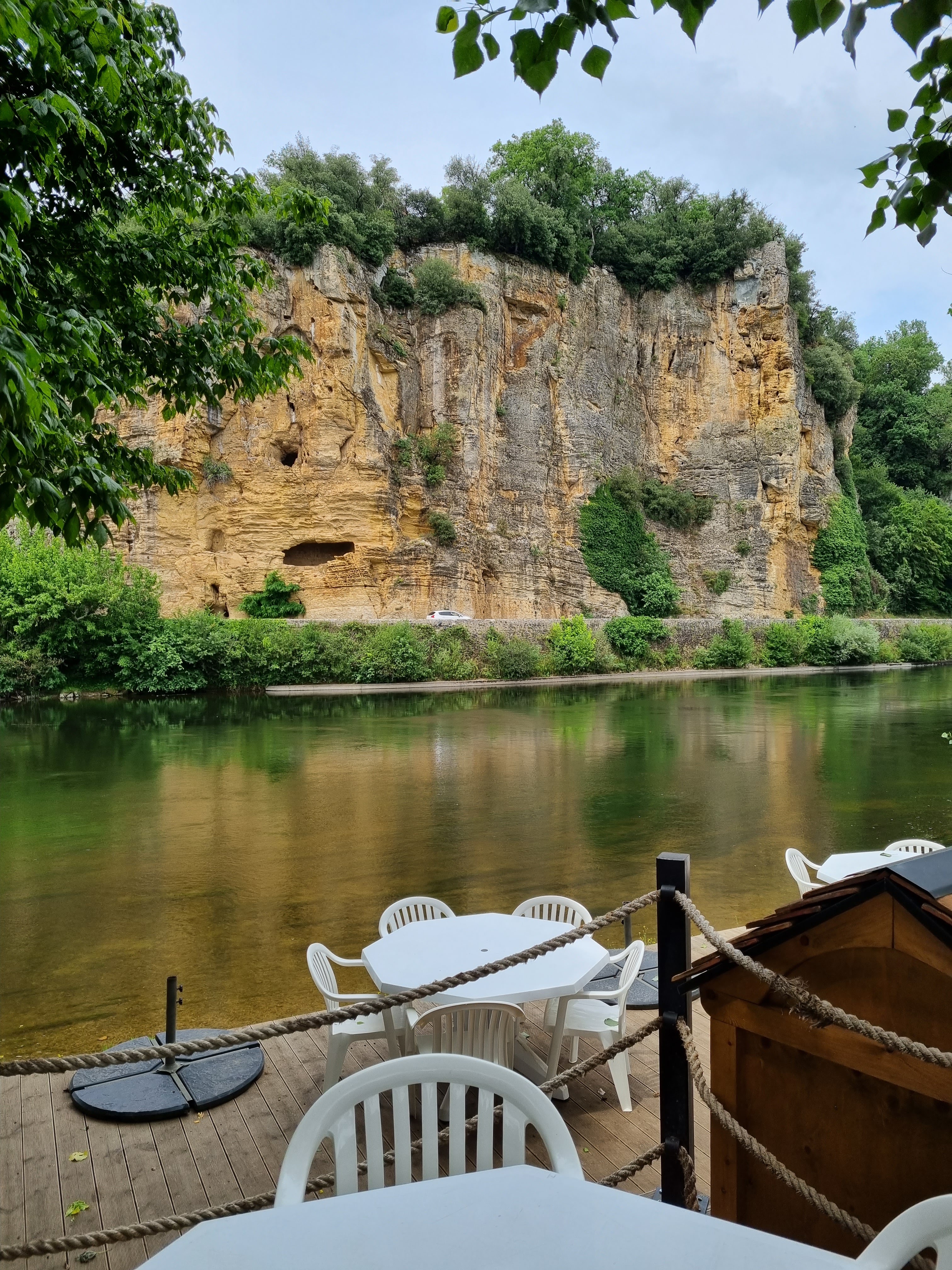 C'est un joli grand snack-bar au bord de la Dordogne, qui existe depuis des années. Il a très certainement amélioré son jeu. Le personnel est charmant et serviable ; l'emplacement est absolument délicieux au bord de la rivière et face à des falaises pittoresques et même à un fort en ruine, mais nous sommes allés manger à l'heure du déjeuner. La cuisine est excellente, le rapport qualité prix est excellent et les portions sont excellentes. Si vous voulez une table au bord de la rivière, réservez, mais sinon, il semble y avoir beaucoup de tables normalement disponibles. Recommandé.