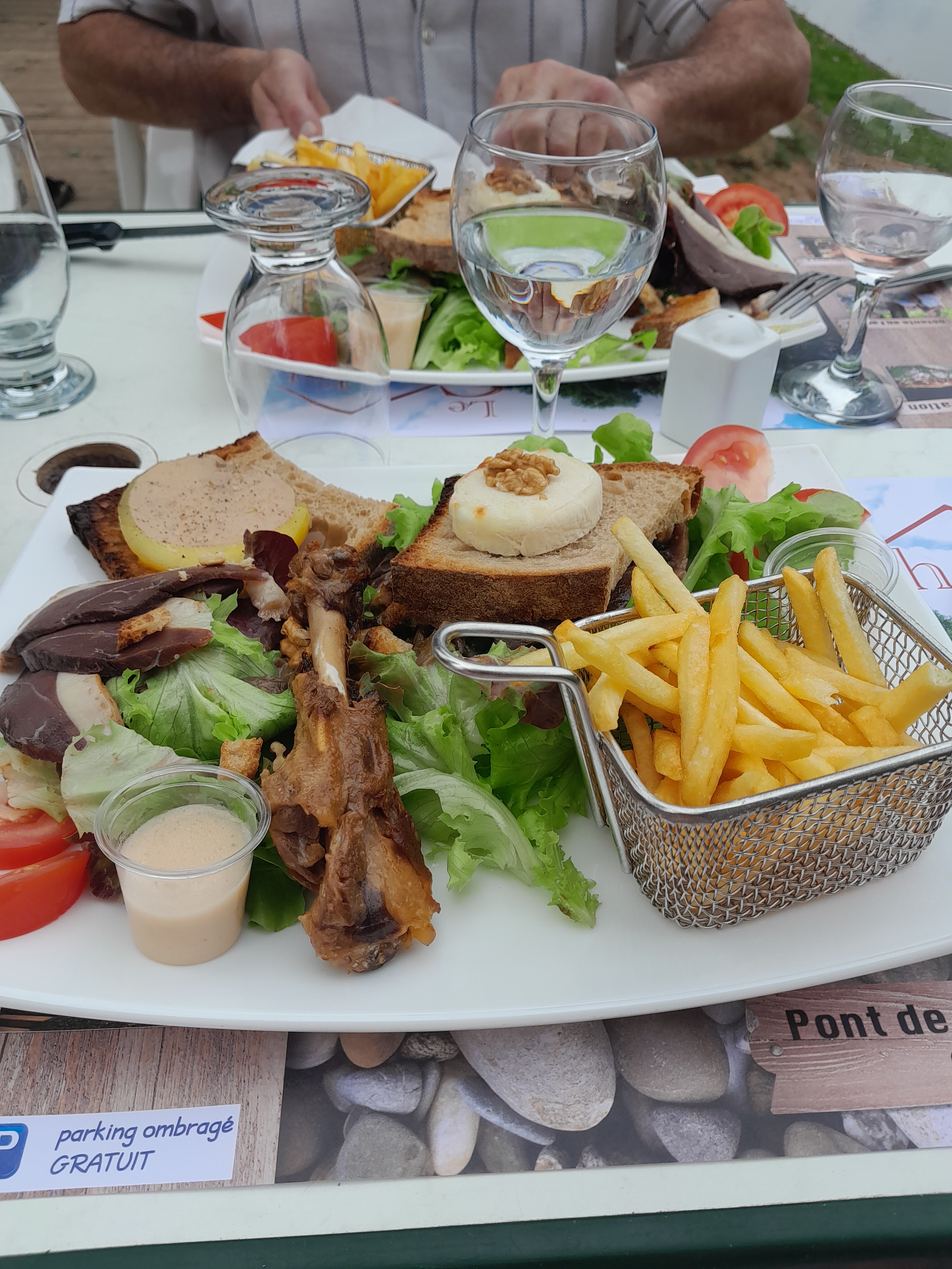 Assiette très maigre pour ma part, canard archi cuit, goût de brûlé, sec. Je vous conseille plutôt la salade perigourdine, qui elle, était bien garnie. Nous y sommes allés en août, pensez à réserver avant d'y aller. C'est toujours complet! Vue sympa sur la Dordogne