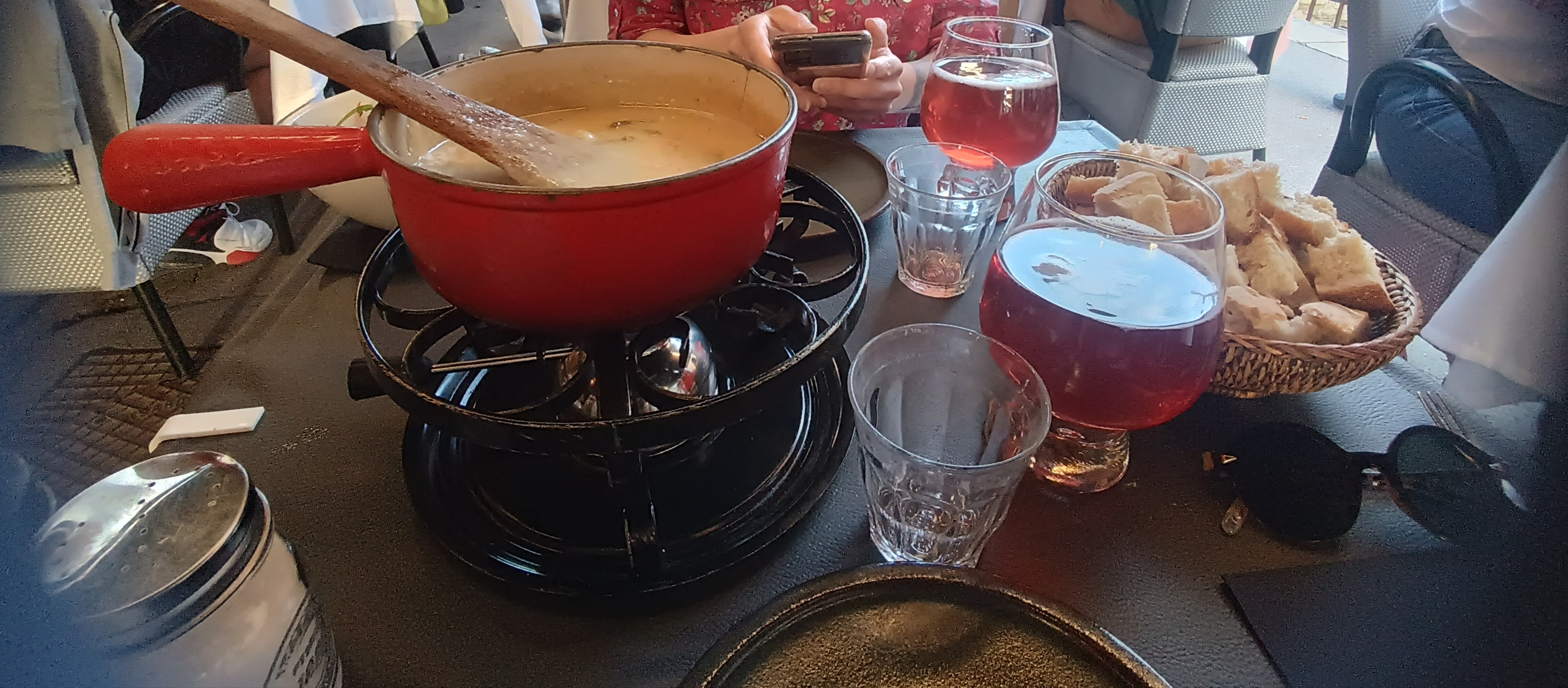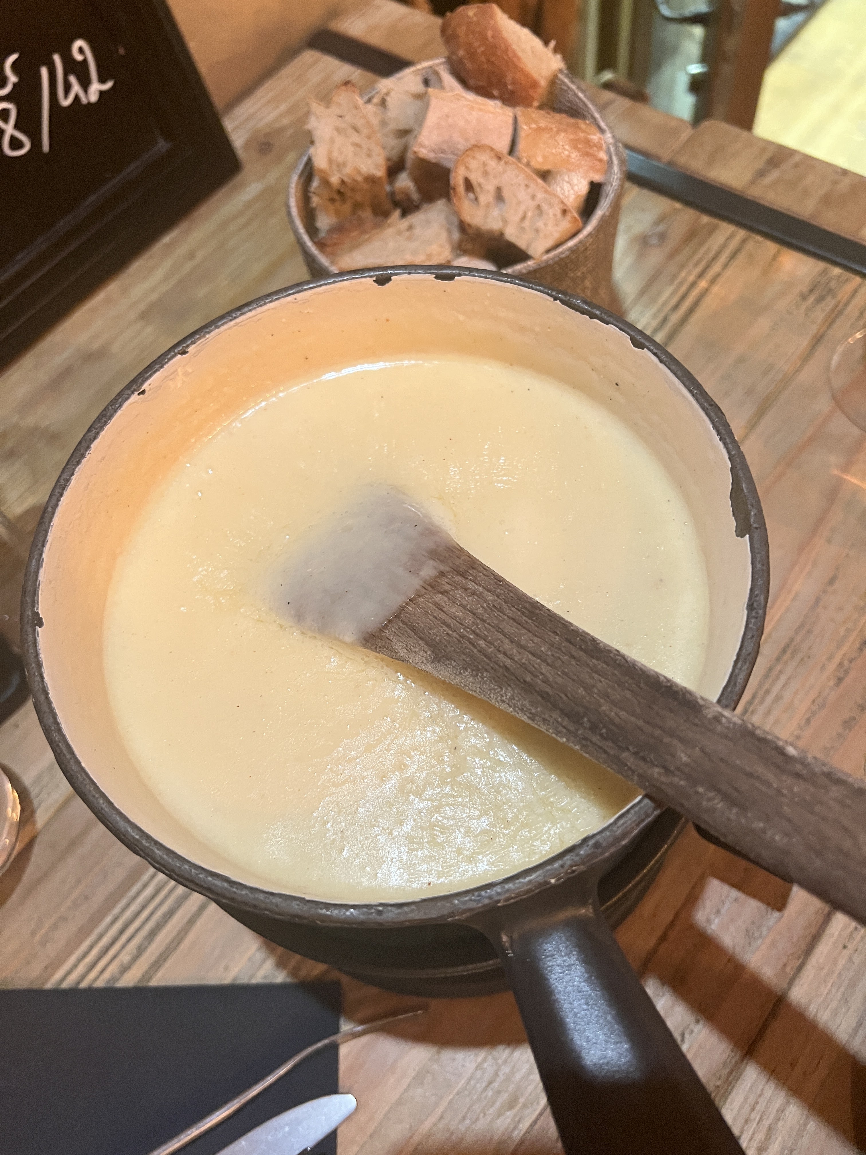 Après quelques échanges par mail m'assurant de la possibilité d'éviter le gluten, ma réservation est prise. Nous sommes arrivés à 19h10, l'accueil fut prompt et efficace. N'appreciant pas la table désignée (car dans le passage), nous avons été installés à une table de choix, au fond du restaurant, sur une banquette, dans un coin cosy. Le service fut assez rapide. En lieu et place du pain, nous avons eu droit à des pommes de terre, la salade mêlée accompagnant la fondue était une excellente idée. En ce qui concerne la fondue moitié-moitié, elle était délicieuse. Le verre de Gigondas était parfait quoiqu'un peu cher. Les serveurs se sont tous montrés avenants et de bonne humeur (sans être lourds). Pas de dessert (nous n'avions plus faim). Merci pour l'accueil et le service.