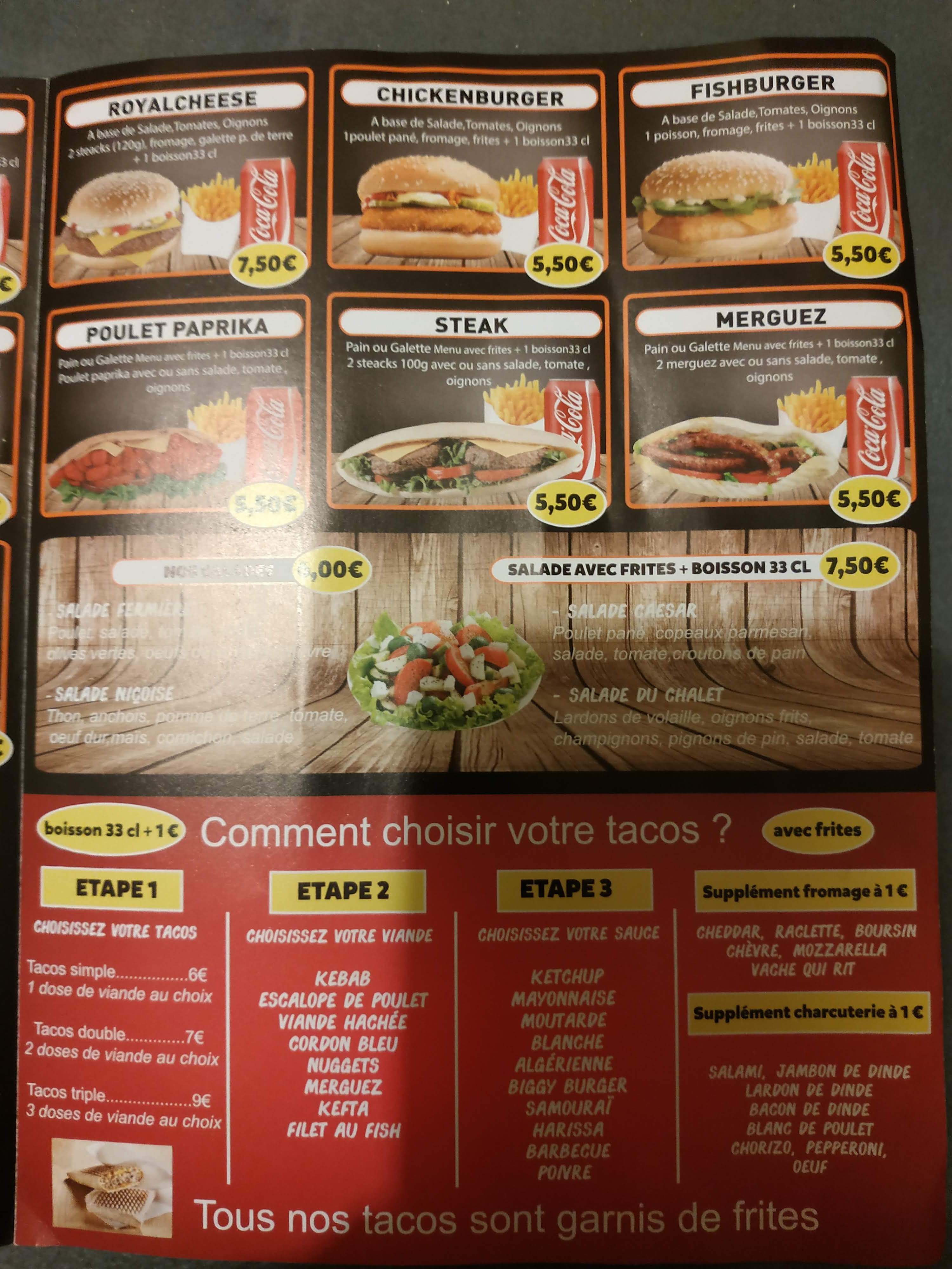 J'ai pris un tacos deux viandes...c'est le meilleur que j'ai mangé jusqu'à aujourd'hui!!! Un régal...je nai pas essayé le reste mais ça une tuerie. Je recommande vraiment x1000