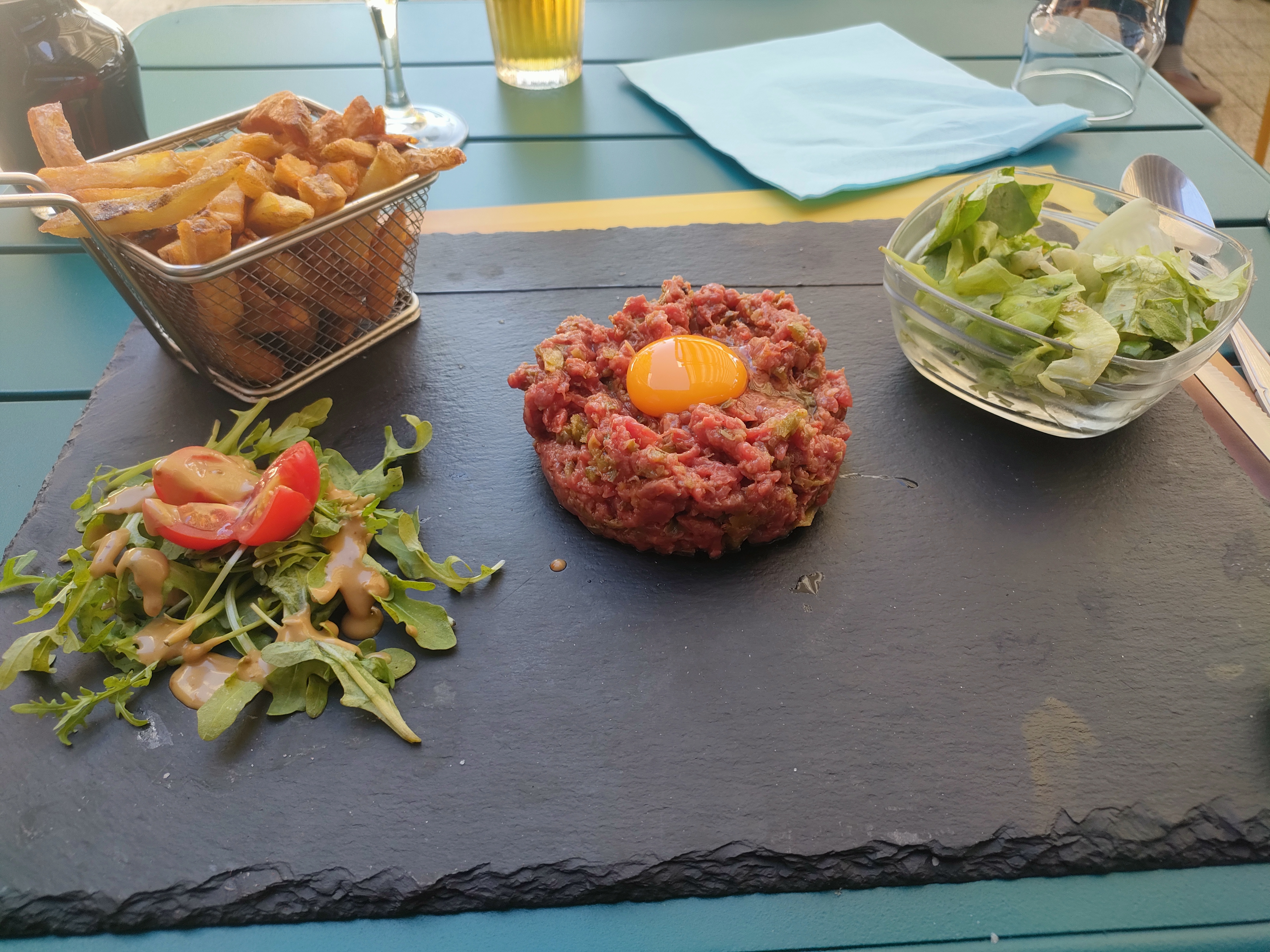 Service beaucoup trop long dû à une mauvaise organisation, apéritif qui dure 2H... frites beaucoup trop cuites car réchauffées. 4H sur place au total pour apéritif, plat, dessert. Dommage.