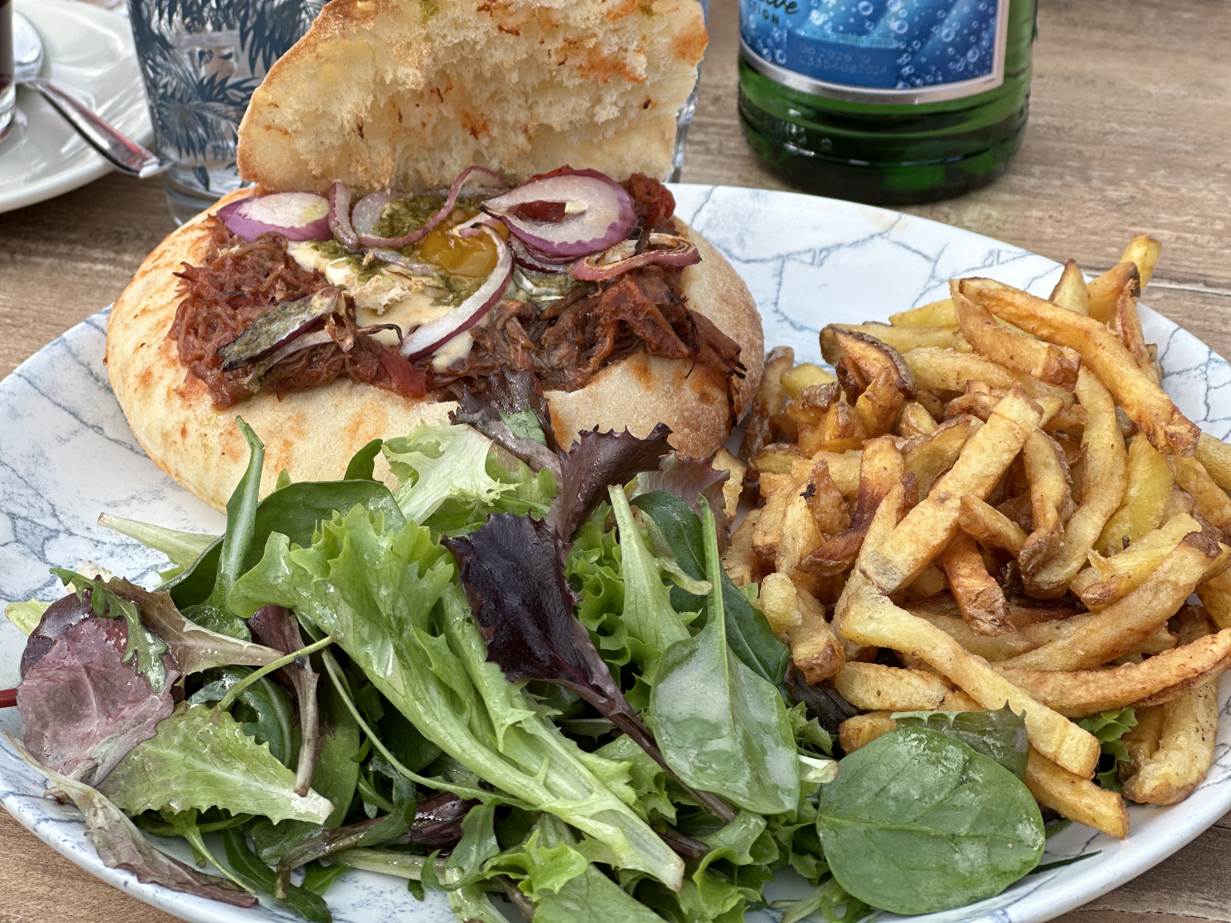 Excellent repas, portions ultra généreuse produits de qualité,vin excellent,et une petit gamelle d'eau pour notre toutou ☺️ Le pub est décoré avec goût Je recommande Un vrai plaisir