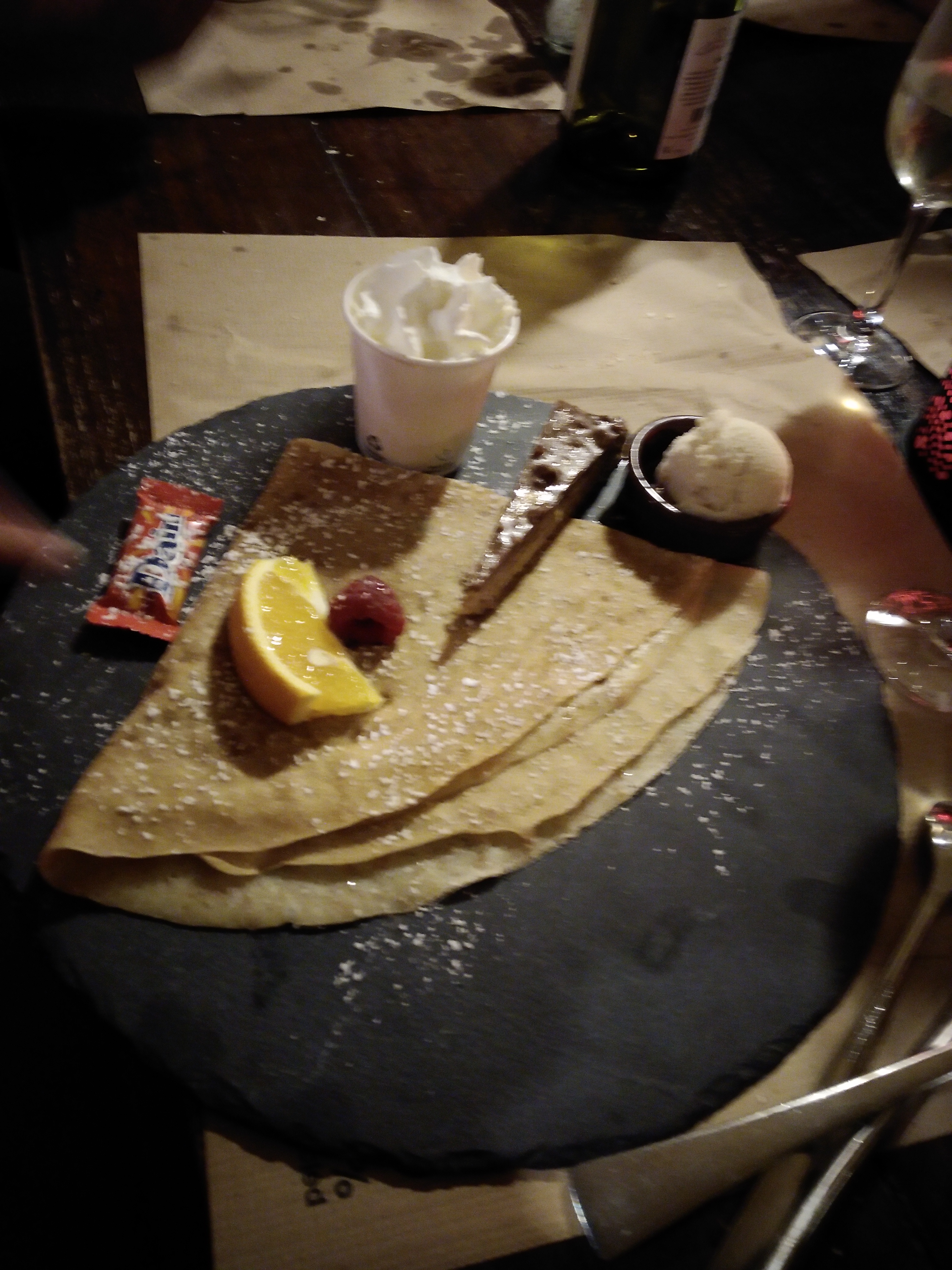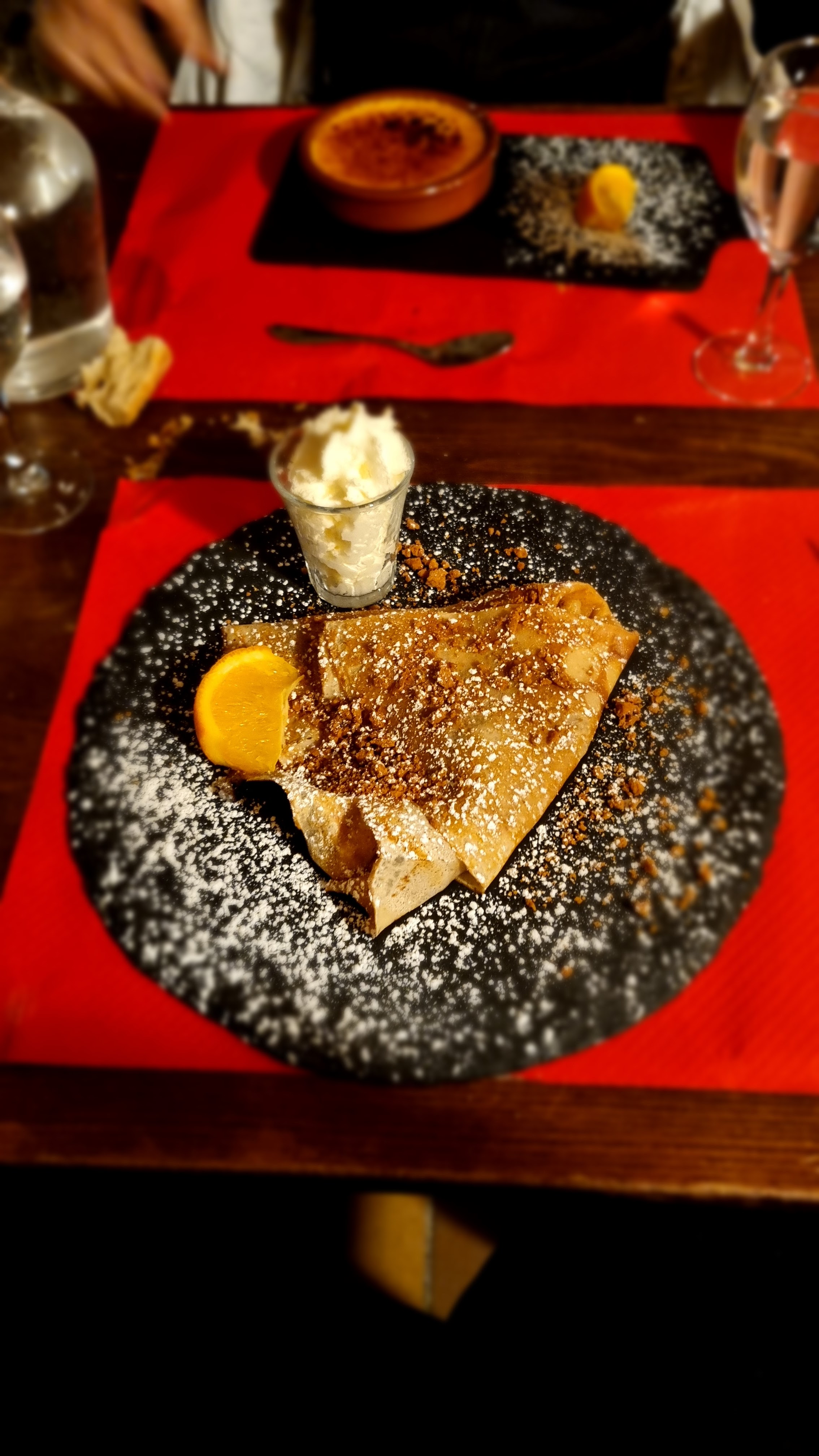 Alors,avis divergents..mon conjoint a trouvé sa crêpe trop sèche,comme faite trop à l'avance (cordée ),la mienne ,bobsleigh (tartiflette lardons pdt)était très bonne,et la 3eme était une classique complète. en dessert,crêpe Kinder apparemment délicieuse (mon conjoint)et caramel beurre salé très bonne aussi,mais la 3eme Flocon(noix de coco),il n est pas stipulé lait concentré sucré et pourtant ça en était à l'interieur .30 mns d'attente pour les desserts et les café sans explications malheureusement. attention,la terrasse déborde sur la devanture avec rideau de fer du magasin d'à côté ainsi qu'un distributeur de préservatifs à proximité de notre table pas très glamour. bref,c'est bon mais reste un peu cher pour des crêpes .98 euros à 3,dont 1 whisky,2 kirs bretons,une bouteille de rosé, 3 crêpes en plat,3 en dessert et 3 cafés. le vin est par contre très abordable.