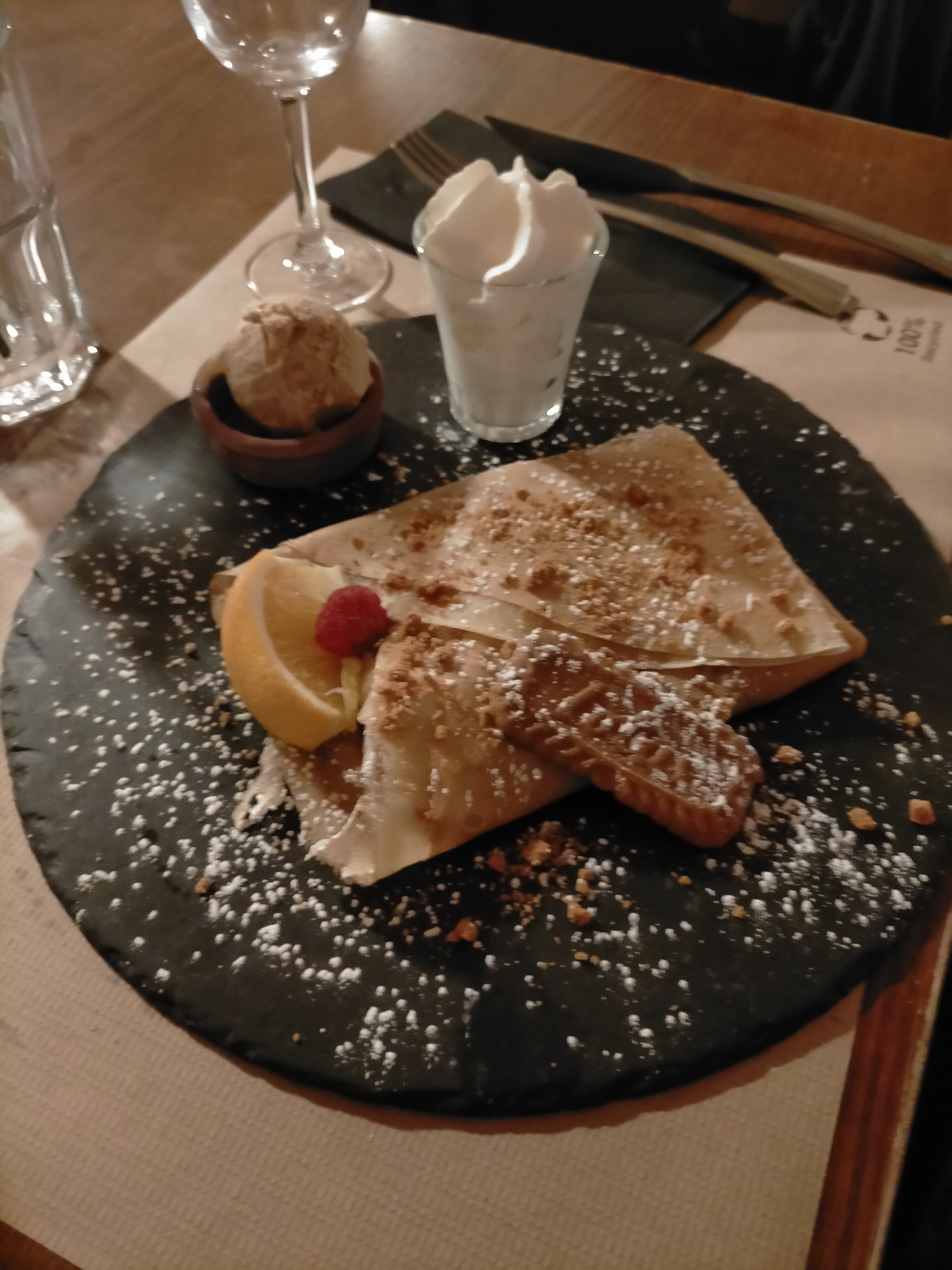 Premier repas au chalet et ce fut un régal ! J'avais peur des crêpes au sarrasin car je n'aime pas ça mais finalement avec le fromage, le goût du blé noir est léger. Très surprise par les glaces crème fraîche et chèvre, une tuerie, à goûter ! Le service était un peu long mais nous avons eu un serveur très consciencieux : il nous a apporté de l'eau avant qu'il nous en manque, il a aidé à nettoyer la bêtise d'un de mes amis, il a répondu à nos questions avec le sourire. Je recommande ce restaurant ! Le resto étant petit, il est conseillé de réserver. PS : les toilettes sont propres. (toujours important de le préciser ;))