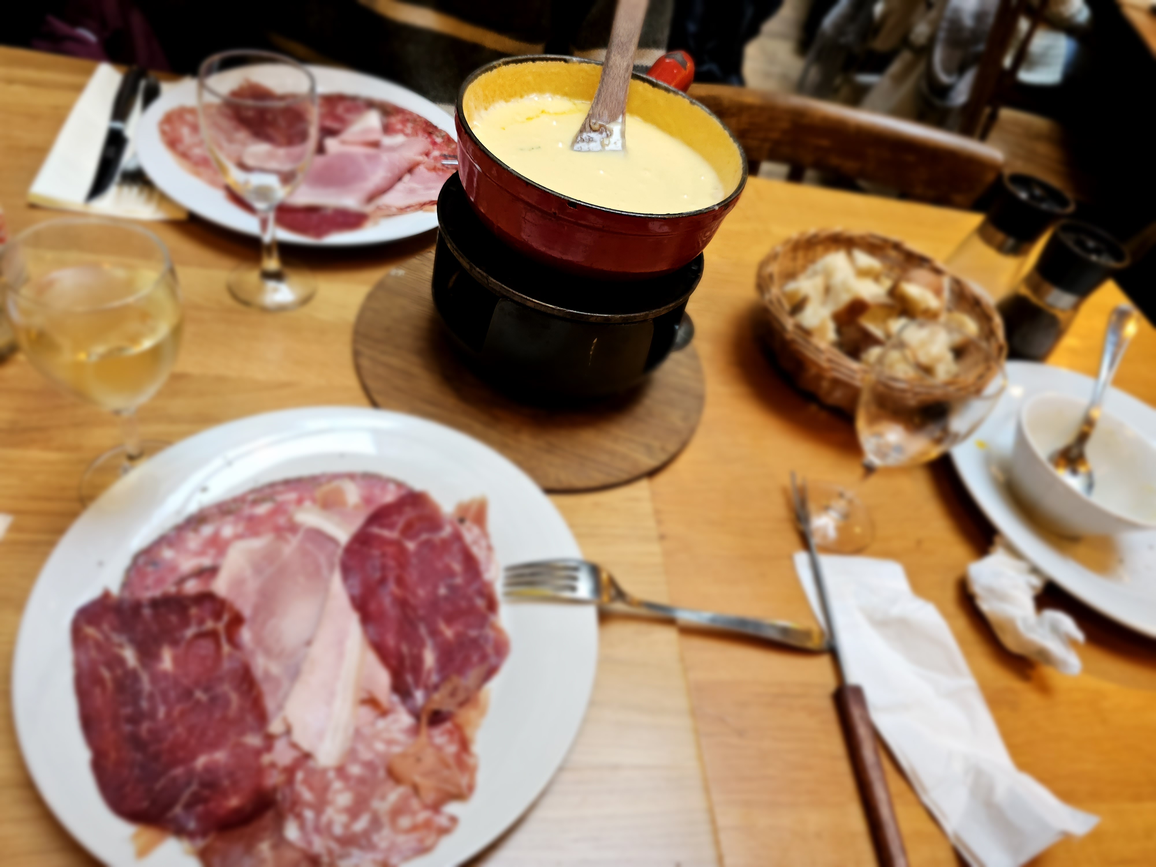 Fondue correcte, cadre sympa si l'on passe à côté de l'odeur qui imprègne les vêtements ☺️. L'assiette de charcuterie n'est pas excellente mais copieuse. Le personnel est très sympa. Bonne soirée conviviale.