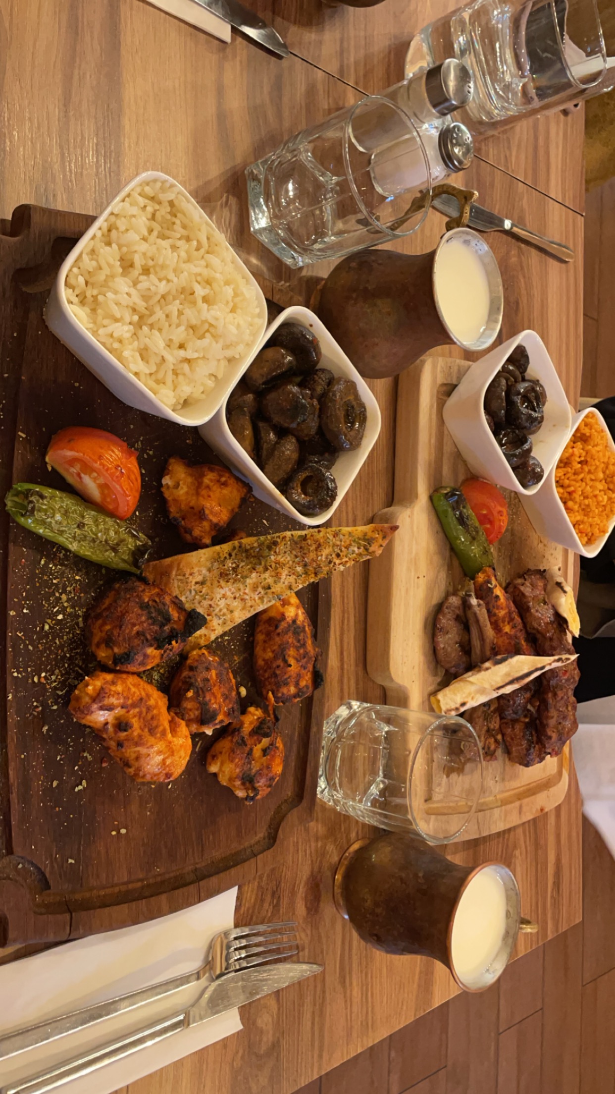 Le restaurant est vraiment beau, l’entrée est agréable avec le diffuseur d’odeur ! Le serveur était très sympa et service assez rapide. Les assiettes sont visuellement très beaux et bien garnis. Les déserts sont excellents. Dommage le pain servit n’était pas frais ou fait maison, vraiment pas très bon. Et manque de cuisson pour le poulet dans les assiettes mixte. Le ayran pas ouf avec les morceaux de yoğurt. Et le restaurant est situé dans un quartier pas très agréable pour se mettre sur notre trente-et-un et avec le chantier devant le resto boff.