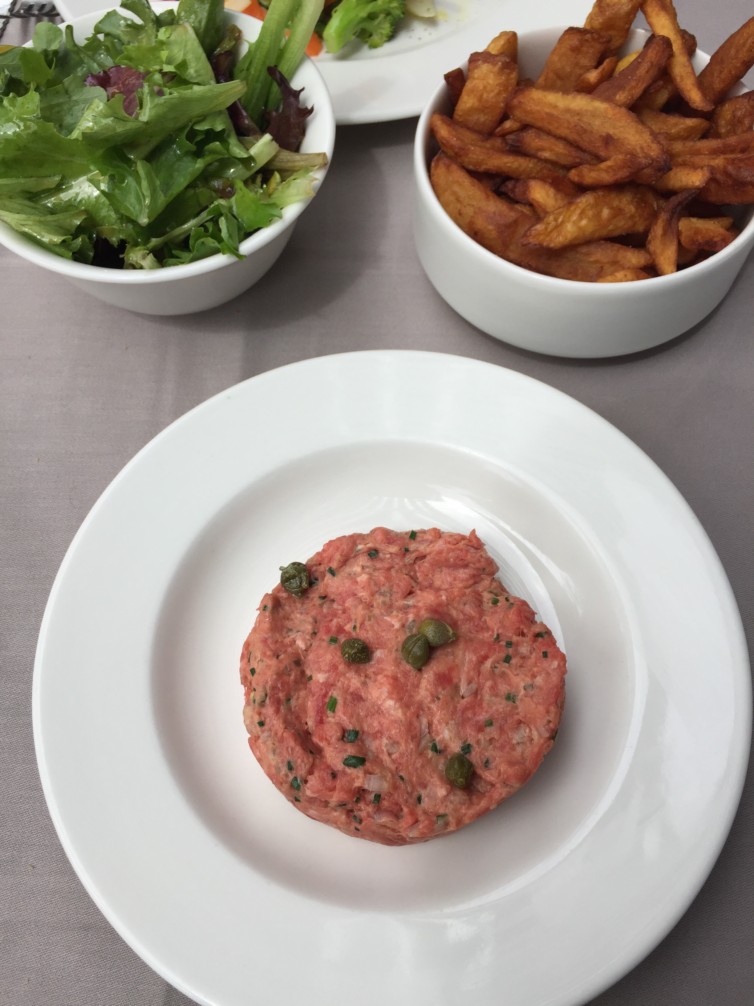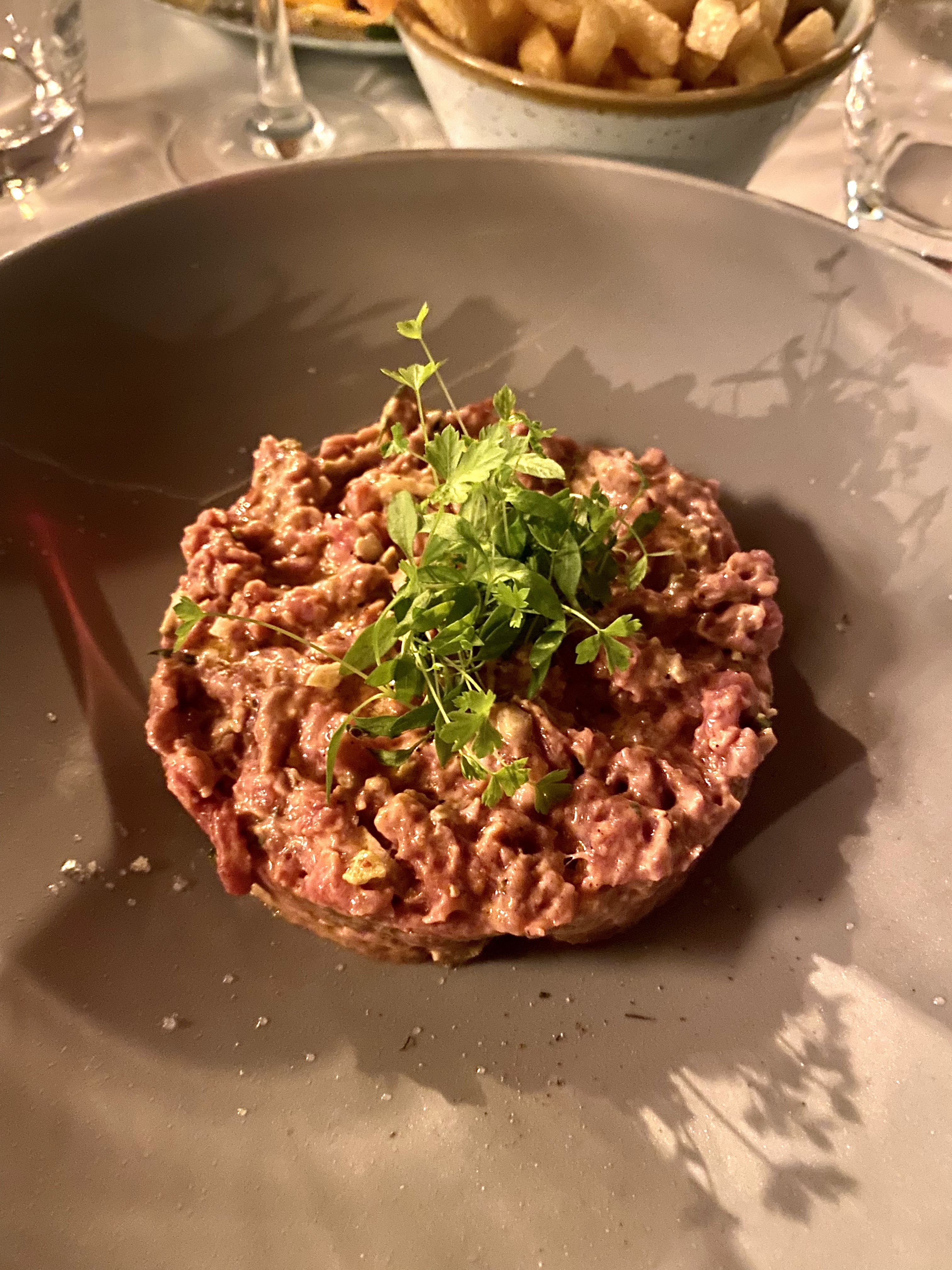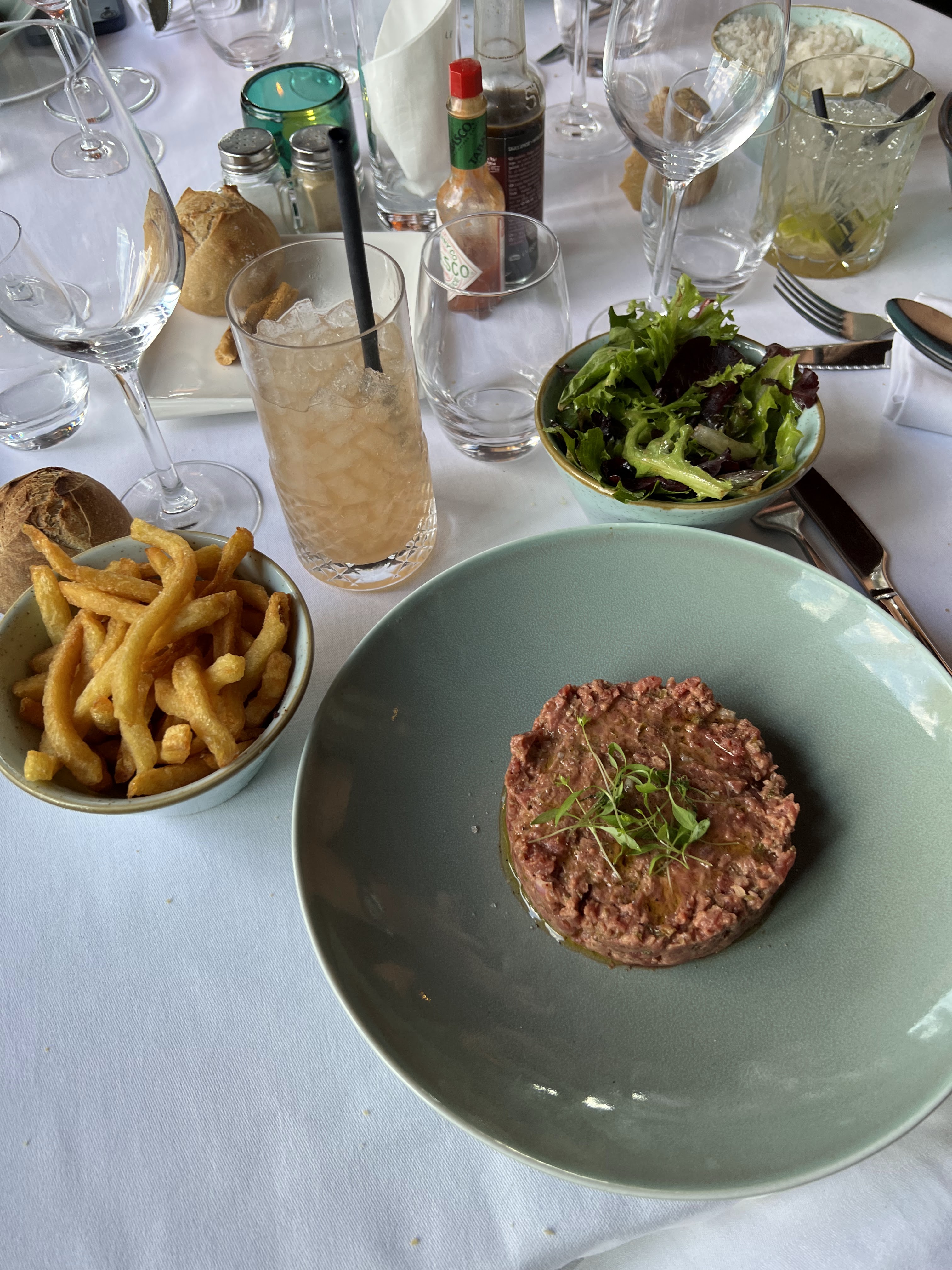 Je voulais essayer ce restaurant notamment pour le tartare malheureusement la carte en ligne n'était pas à jour. Nous avons pris un curry de crevettes et un steak frites avec un verre de vin, un coca et une bouteille d'eau le tout pour 100 euros. Si les plats étaient bons et le service sympathique, nous avons trouvé que le prix était excessif pour ces 5 articles. Peut être ce sont des produits d'exception mais cela n'est pas spécialement mis en avant. Les quantités sont très réduites. Le cadre est très joli mais j'en attends plus sur les plats à ce prix là