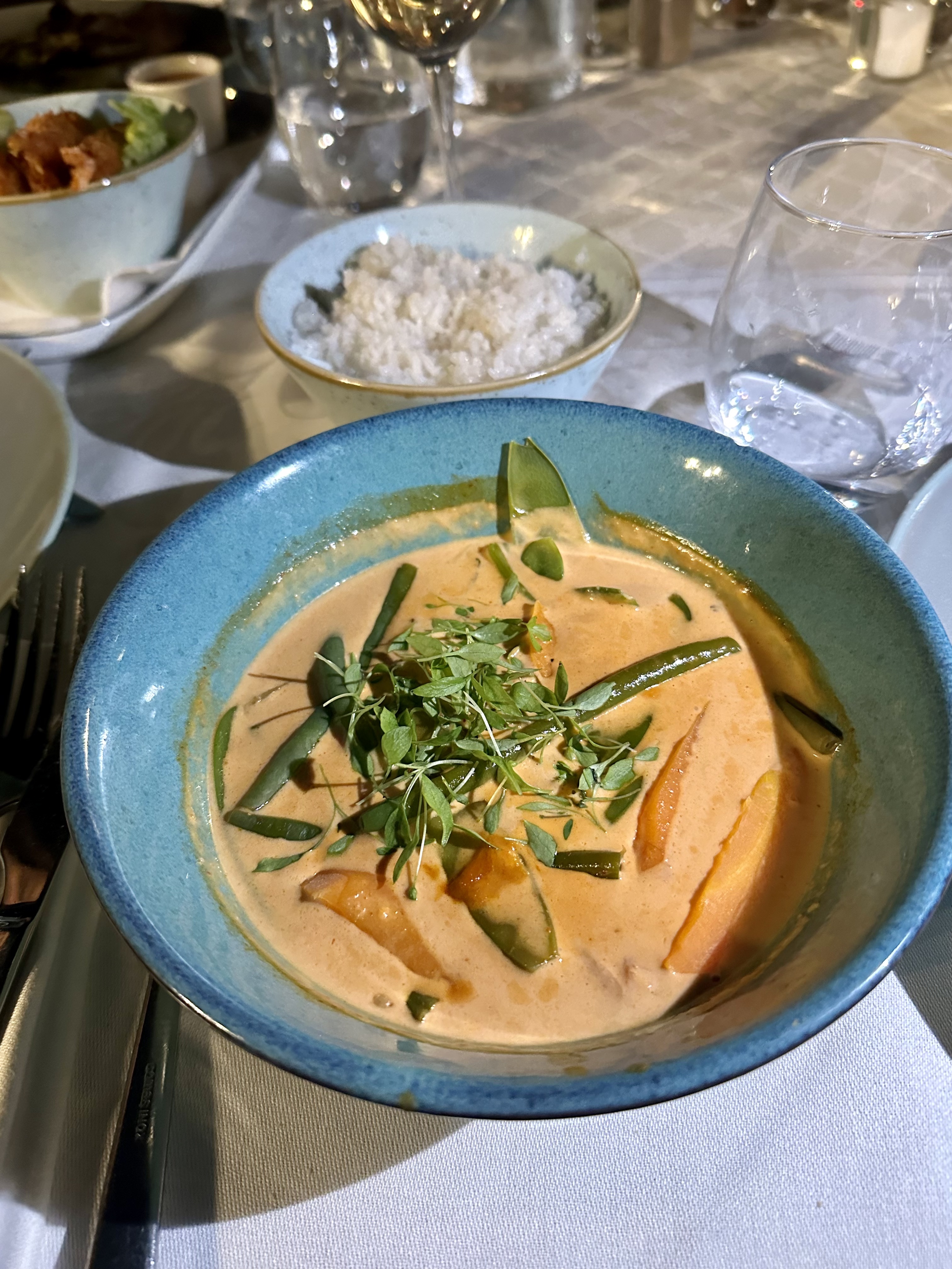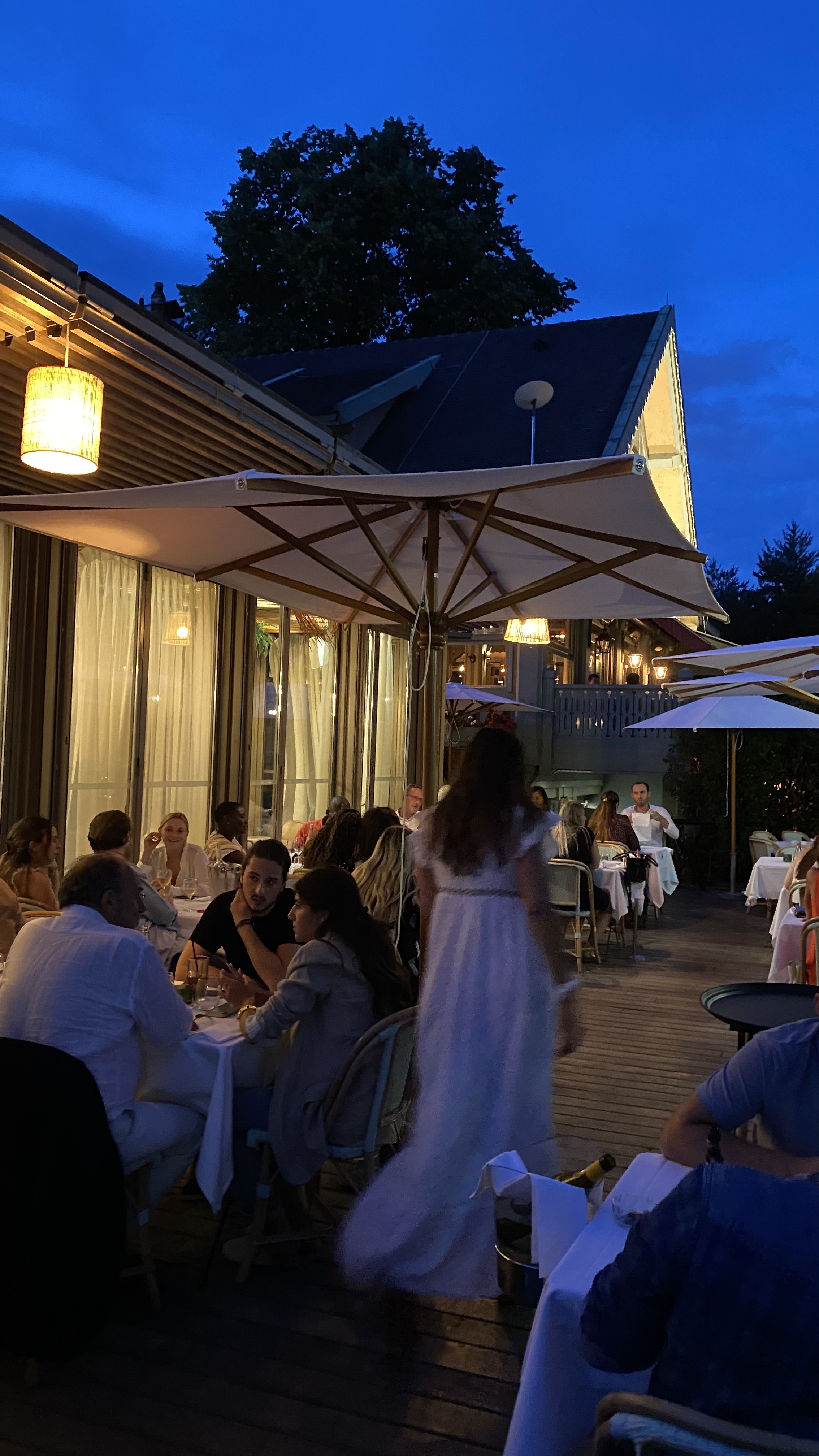 Nous sommes venus pour fêter un anniversaire familial, 8 personnes, service de 21h15. Notre serveur était adorable. Mais le reste laisse véritablement a desirer. En terrasse, nois sommes obligés de nous éclairer au téléphone pour lire les cartes et voir ce que nous avons dans l'assiette. Les plats sont bons, mais absolument rien d'exceptionnel. Le Curry de crevettes à 35€ compte exactement... 4 crevettes. Et surprise fort désagréable, notre table est collée à l'espace intérieur, où un mariage est célébré, nous ne nous entendons même plus parler. Pour un dîner a approximativement 70€ par personne, c'est tout simplement une honte.