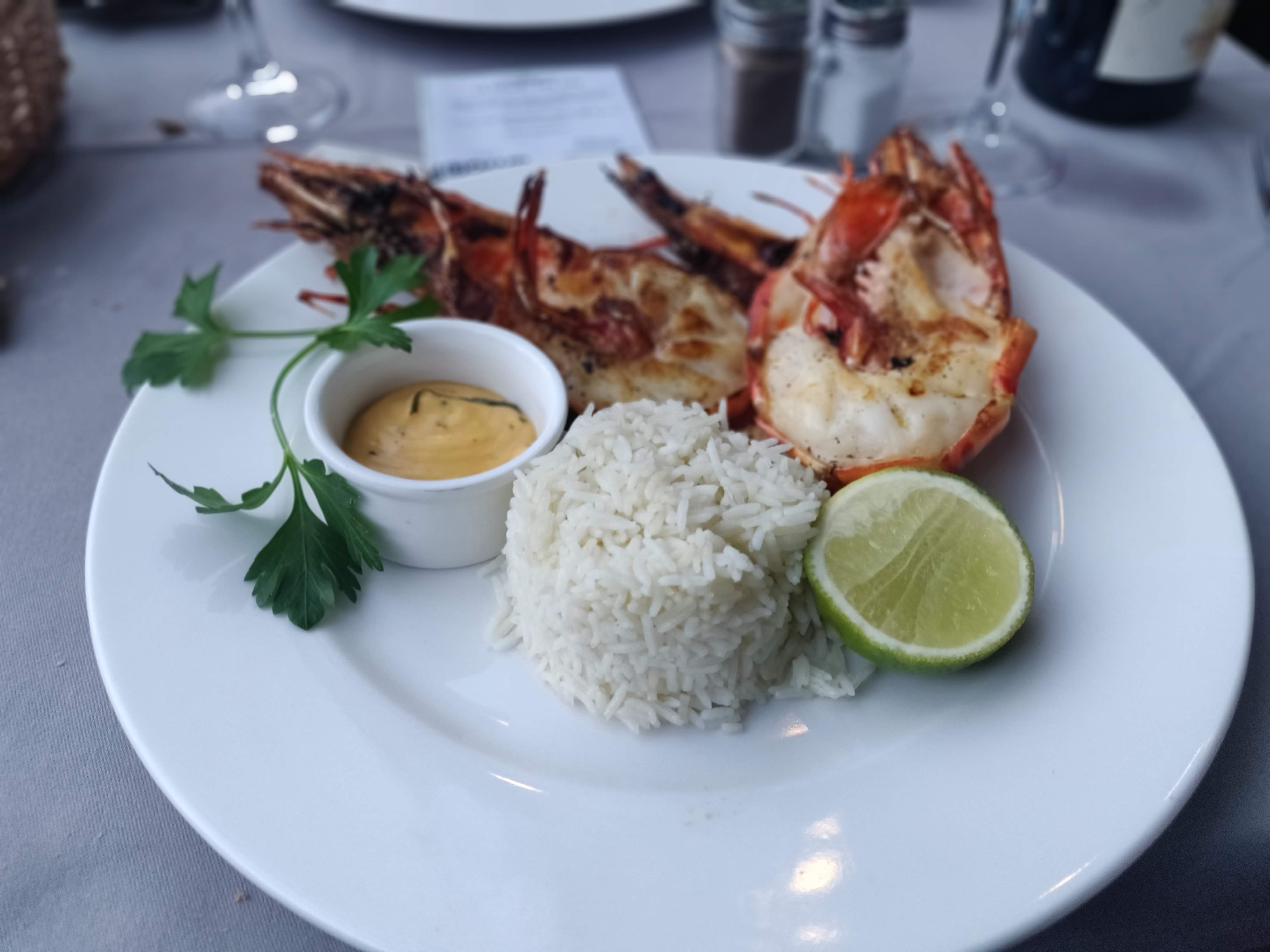 On a très bien mangé , personnel très souriant et agréable. Cadre très agréable, aller au restaurant en bateaux c est très sympa. En revanche on a manger en plein soleil avec 3 enfants et un nouveau né et bcp de guêpes