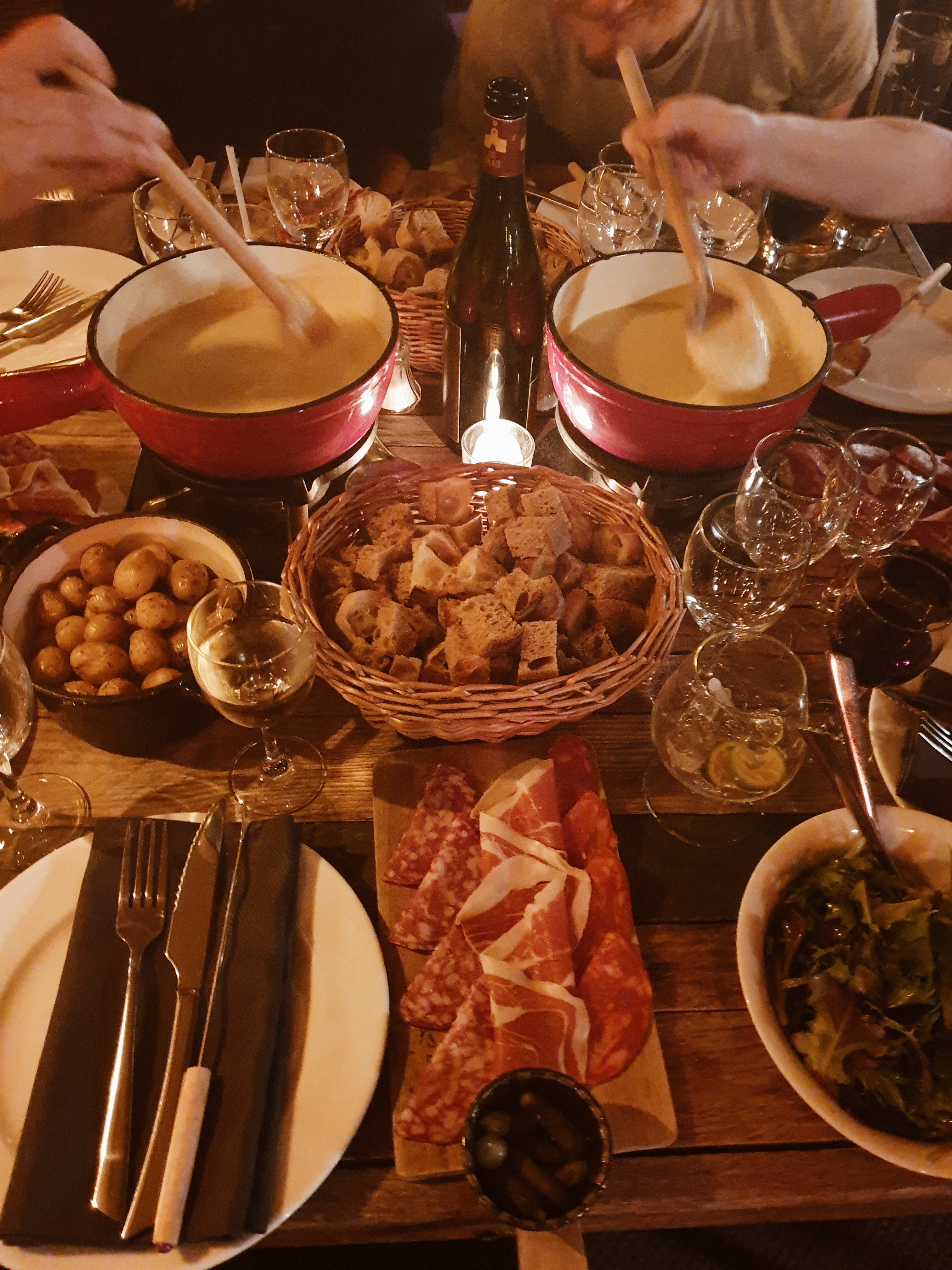Endroit très joli dans un calme total. On a l'impression d'être coupé du reste du monde et d'être en montagne et non à Paris... L'atmosphère a l'intérieur est vraiment très cozy, avec une déco en bois à l'entrée, une déco chic et classe à l'étage. Un large choix de cocktails originaux et très bons ! J'y ai mangé grâce à une invitation d'un client, c'était donc un menu déjà préparé, je n'ai pas vu la carte. Nous avons eu la fondue. C'était ma première fondue de la vie et j'ai bien aimé mais c'était trop fort, assez salé... Elle était servie accompagnée de pommes de terre, charcuterie et de la salade. En dessert nous avons eu une tarte aux myrtilles qui pour le coup est, sûr, décongelée..