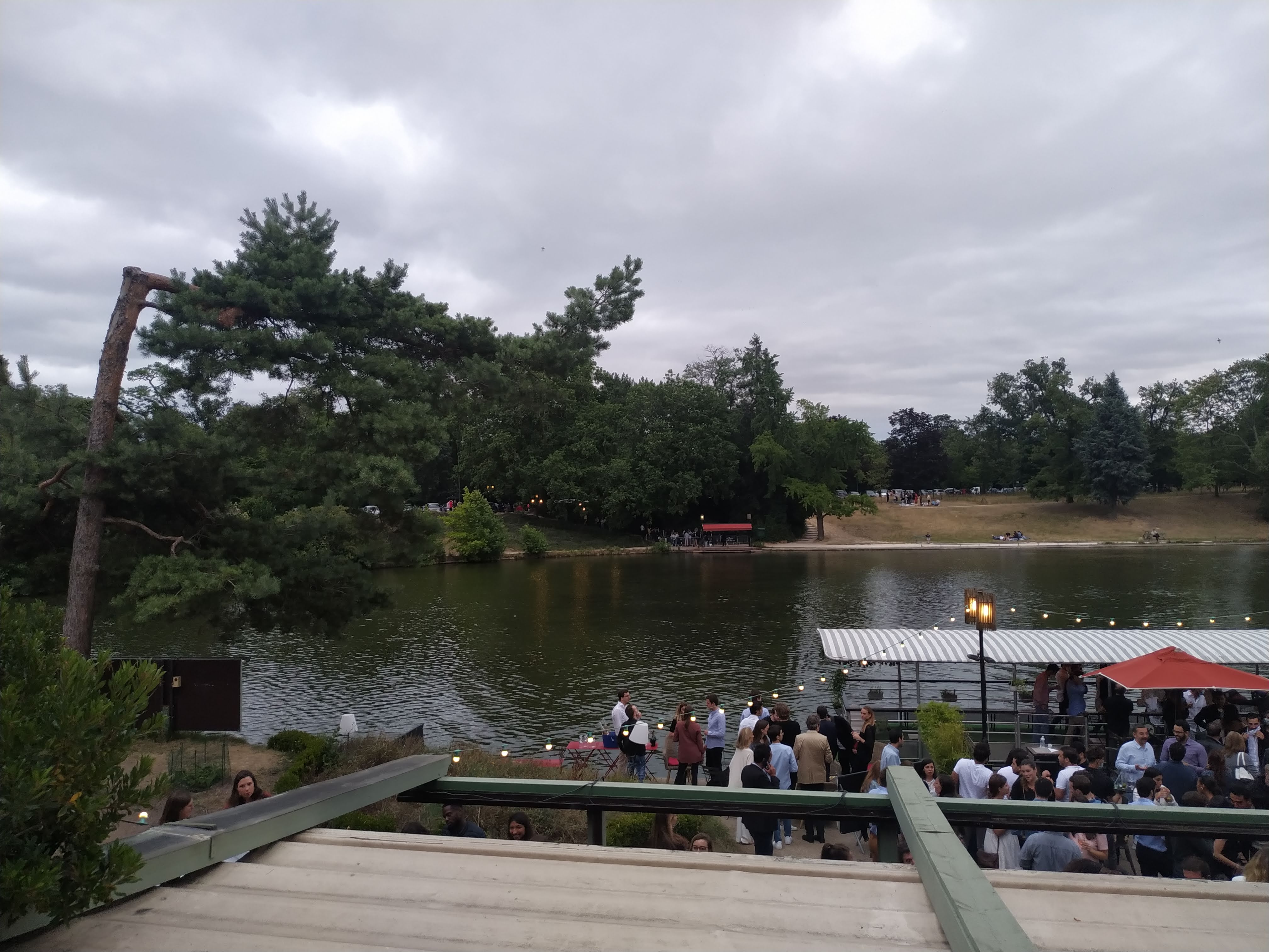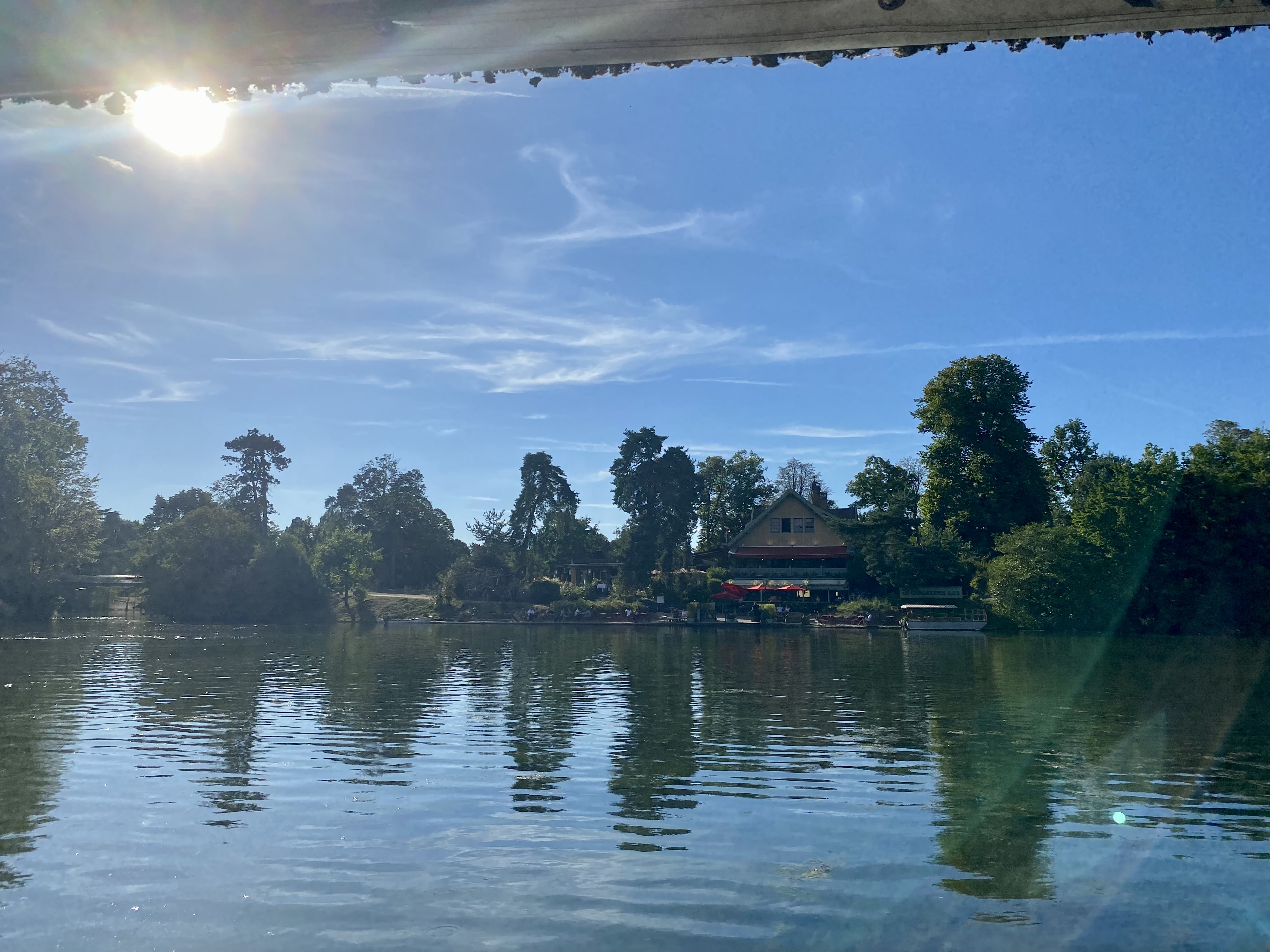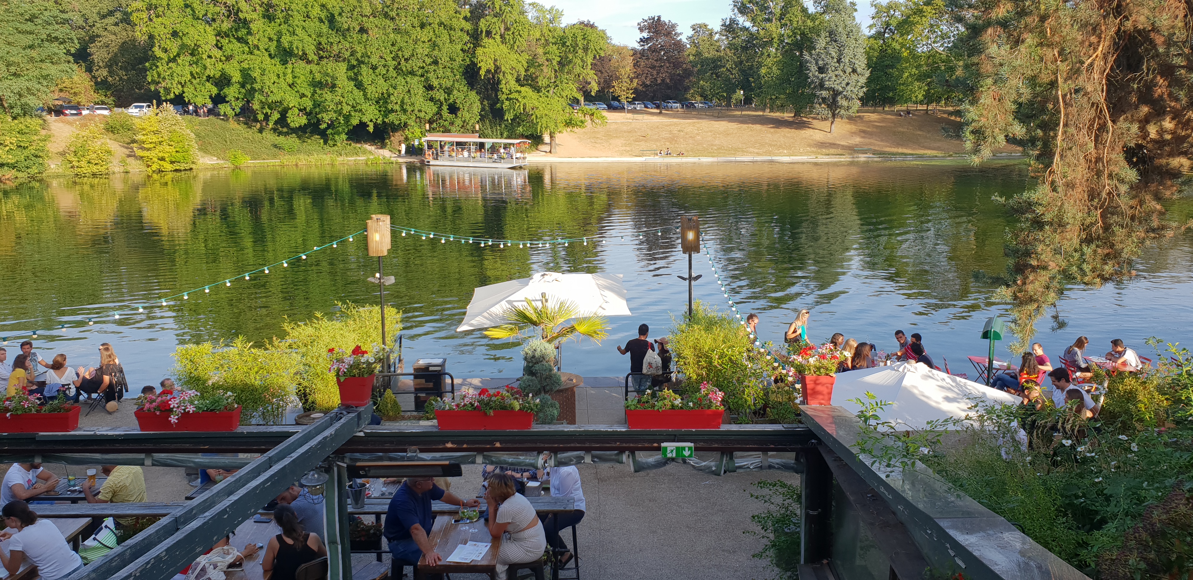 Au milieu du Bois de Boulogne il y a le lac. Au milieu du lac il y a une île. On y accède par un bac et on se retrouve au pied d'un ensemble de 2 restaurants. Un, formel et habituel. Nous n'y sommes pas allés. Un autre avec des tables en plein air et des bancs. Ambiance très décontractée. La bière, les verres de rouge et de blanc circulent. Les gens parlent et se sentent bien en fin de journée. On y partage des planches de charcuterie et de fromage. Cela m'a beaucoup plu. J'y retournerai. Si ce commentaire vous a aidé, mettez un like.