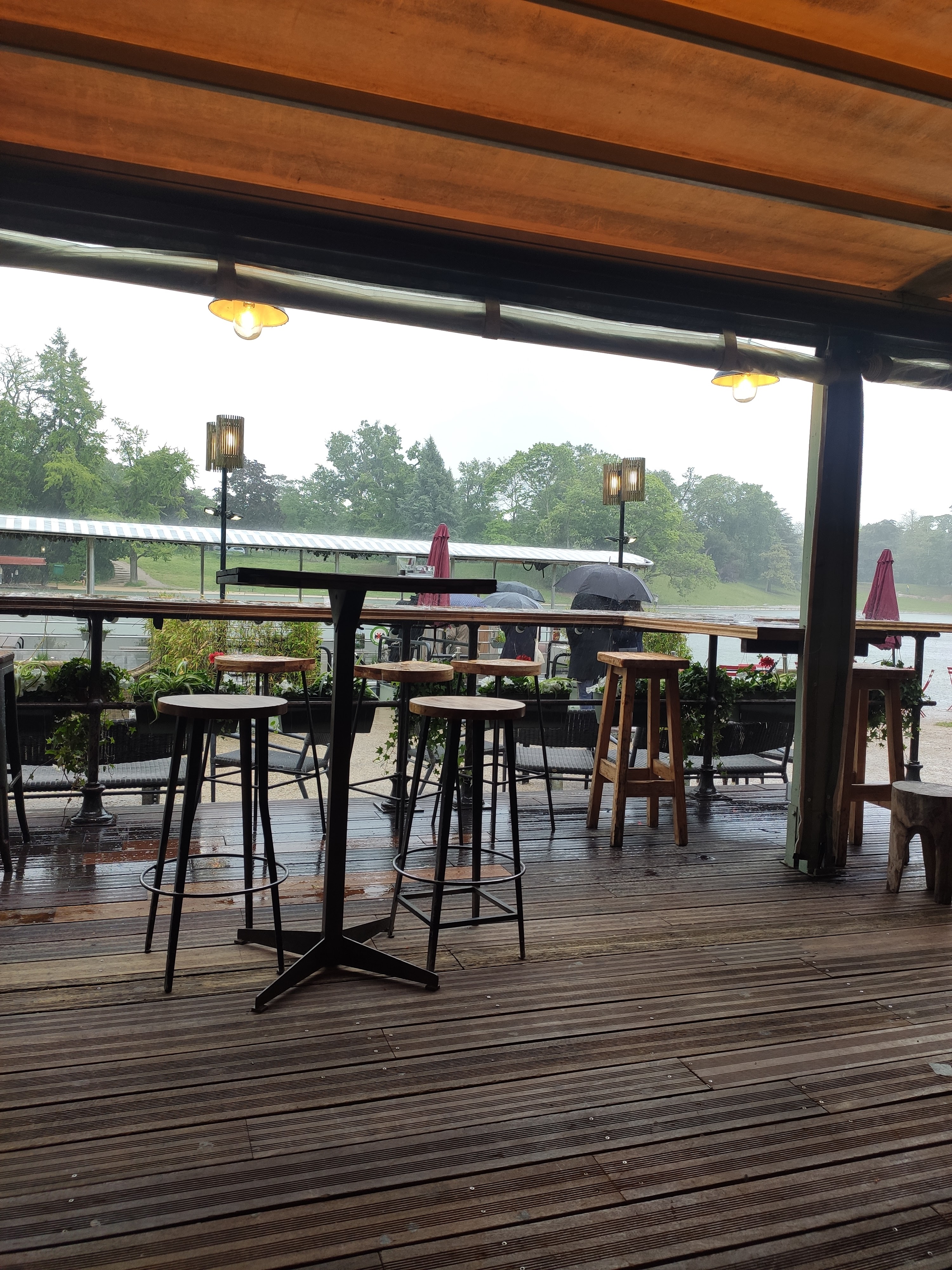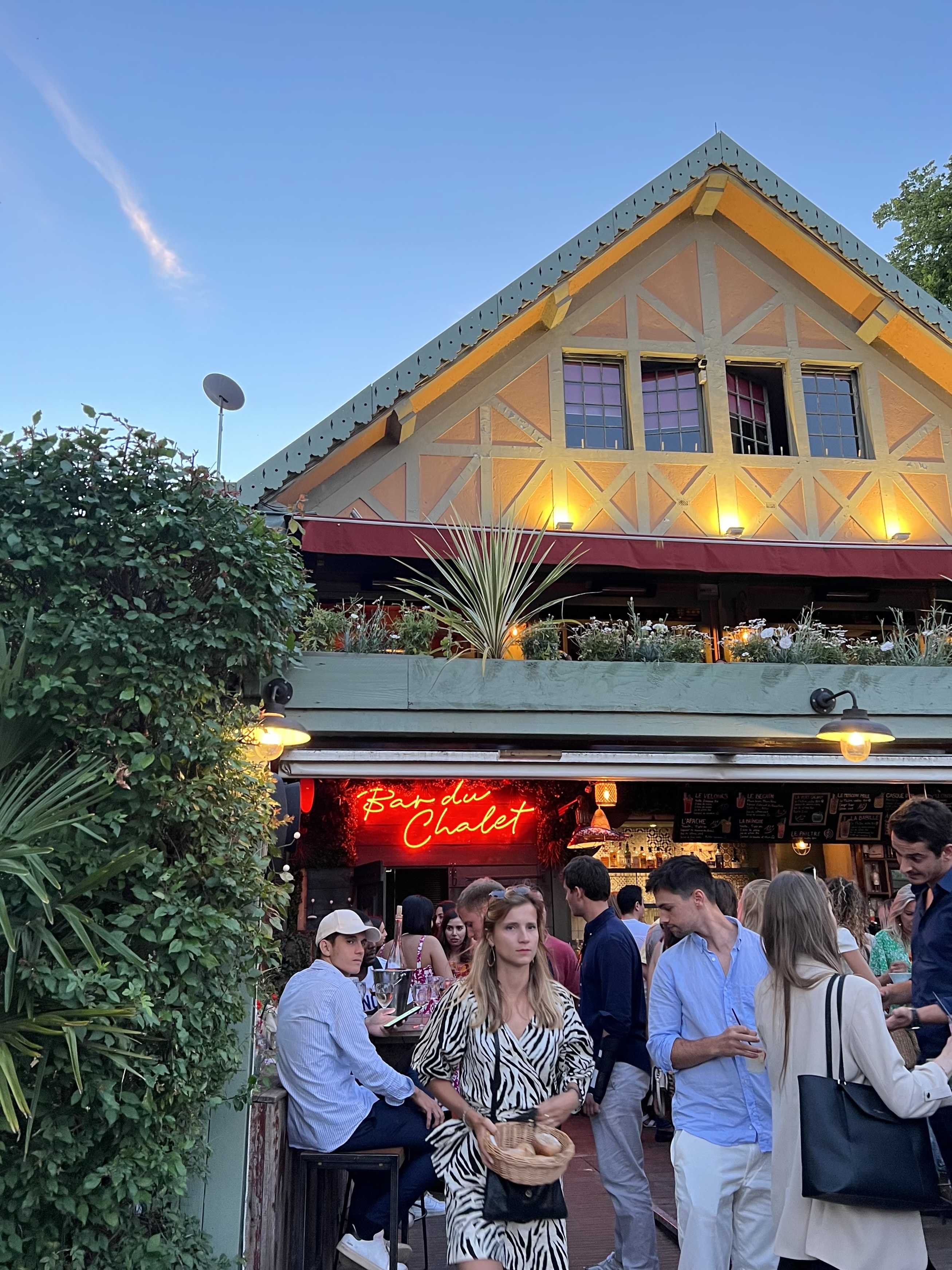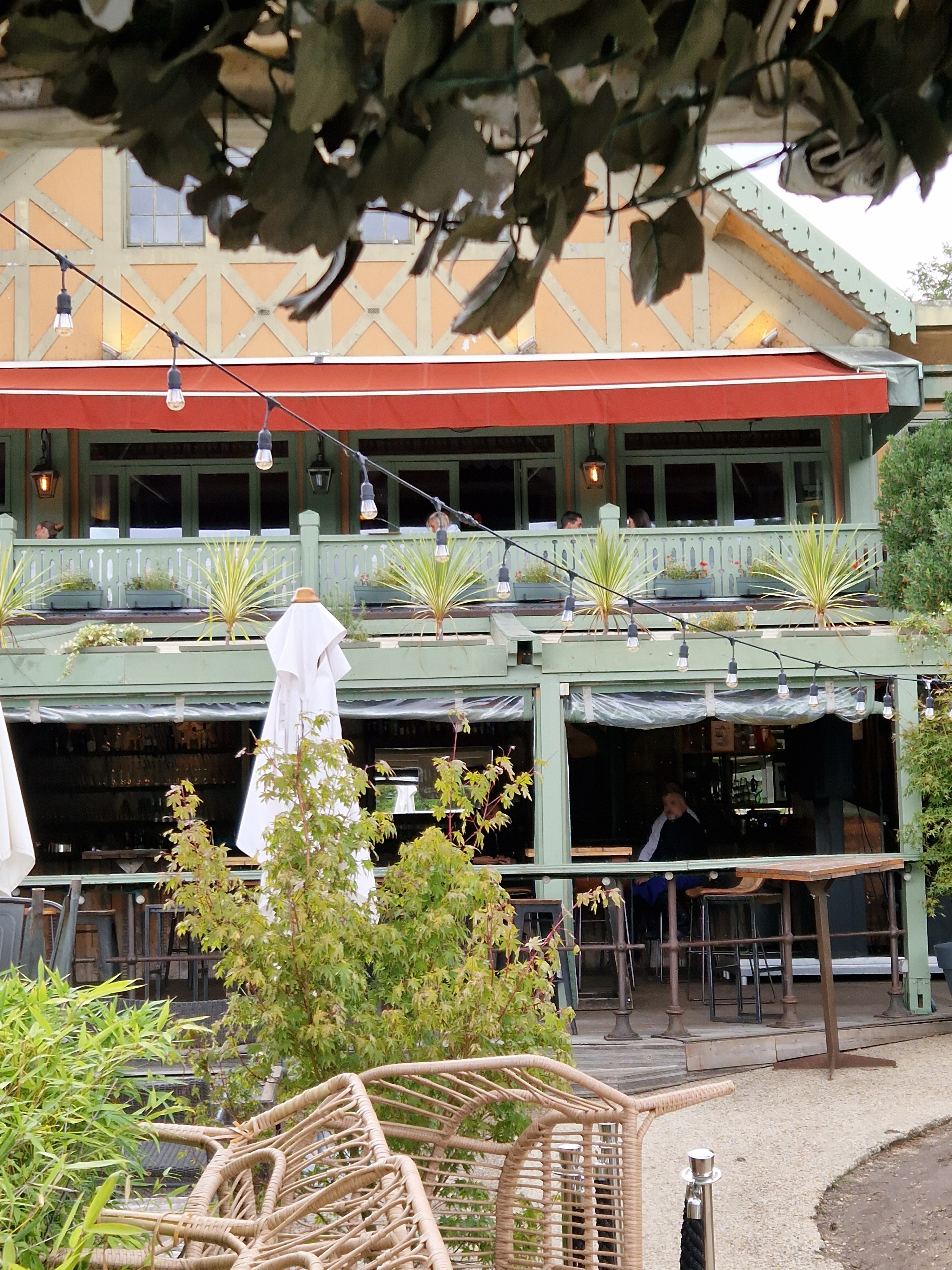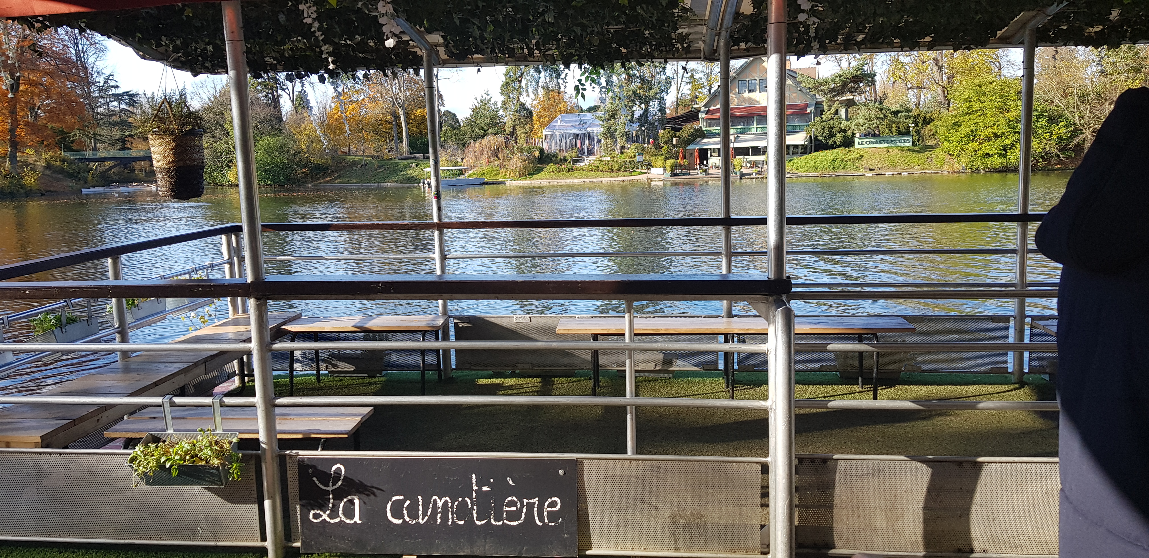 Au milieu du Bois de Boulogne il y a le lac. Au milieu du lac il y a une île. On y accède par un bac et on se retrouve au pied d'un ensemble de 2 restaurants. Un, formel et habituel. Nous n'y sommes pas allés. Un autre avec des tables en plein air et des bancs. Ambiance très décontractée. La bière, les verres de rouge et de blanc circulent. Les gens parlent et se sentent bien en fin de journée. On y partage des planches de charcuterie et de fromage. Cela m'a beaucoup plu. J'y retournerai. Si ce commentaire vous a aidé, mettez un like.
