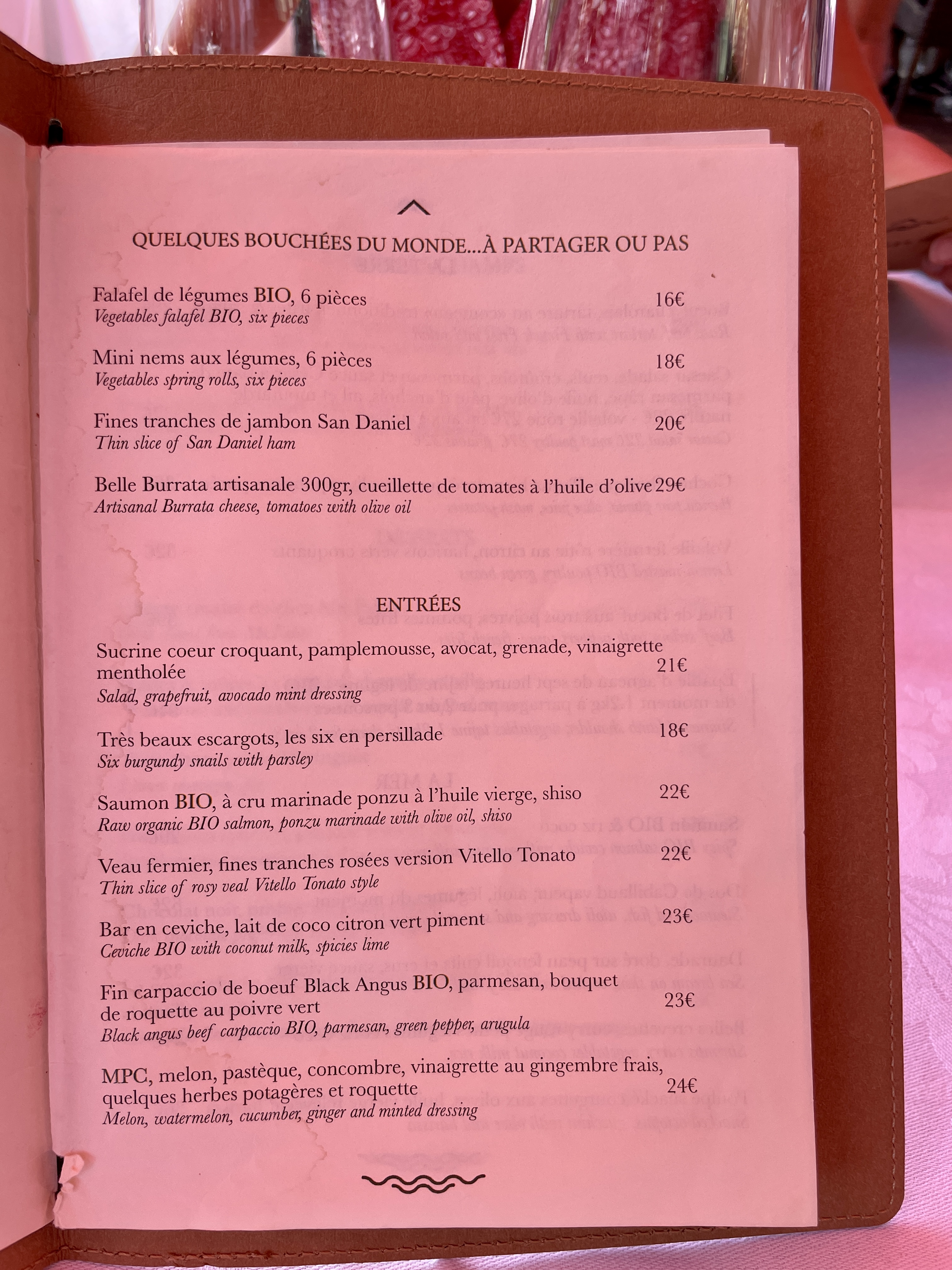 Pain sec et surgelé certainement de la veille, pas de mocktail même si marqués sur la carte, pas de jus de citron pressé demandé, pas de pornstar martini demandé pas de table bien placée (en plein milieu de la salle sans vue, pas de plat plat végétarien sans fruits à coque donc fait à partir d’une entrée haricots verts à 28€ + purée donc 35€ (nous avions prévenu des allergies et régimes mais n’avons pas été alertes de ce point), mousse choco commandée non tapée donc serveuse revenue encaisser à nouveau… nous avons refusé et avons dit que nous partions vu le service, elle a insisté en disant qu’elle l’avait demandé en cuisine, pour un tel prix toutes ces erreurs sont honteuses ! Les assiettes très peu chargées également. Nous sommes repartis en ayant faim