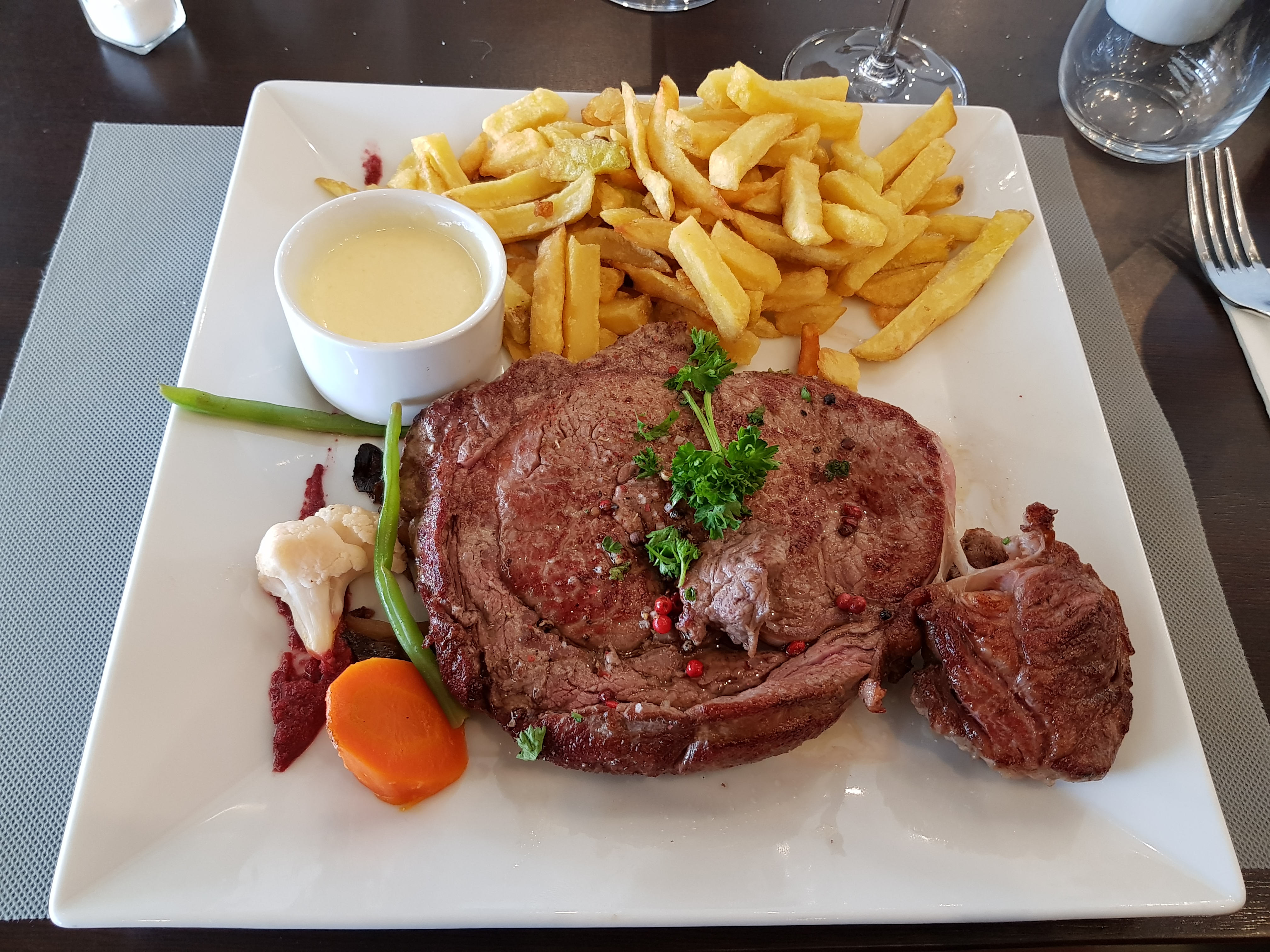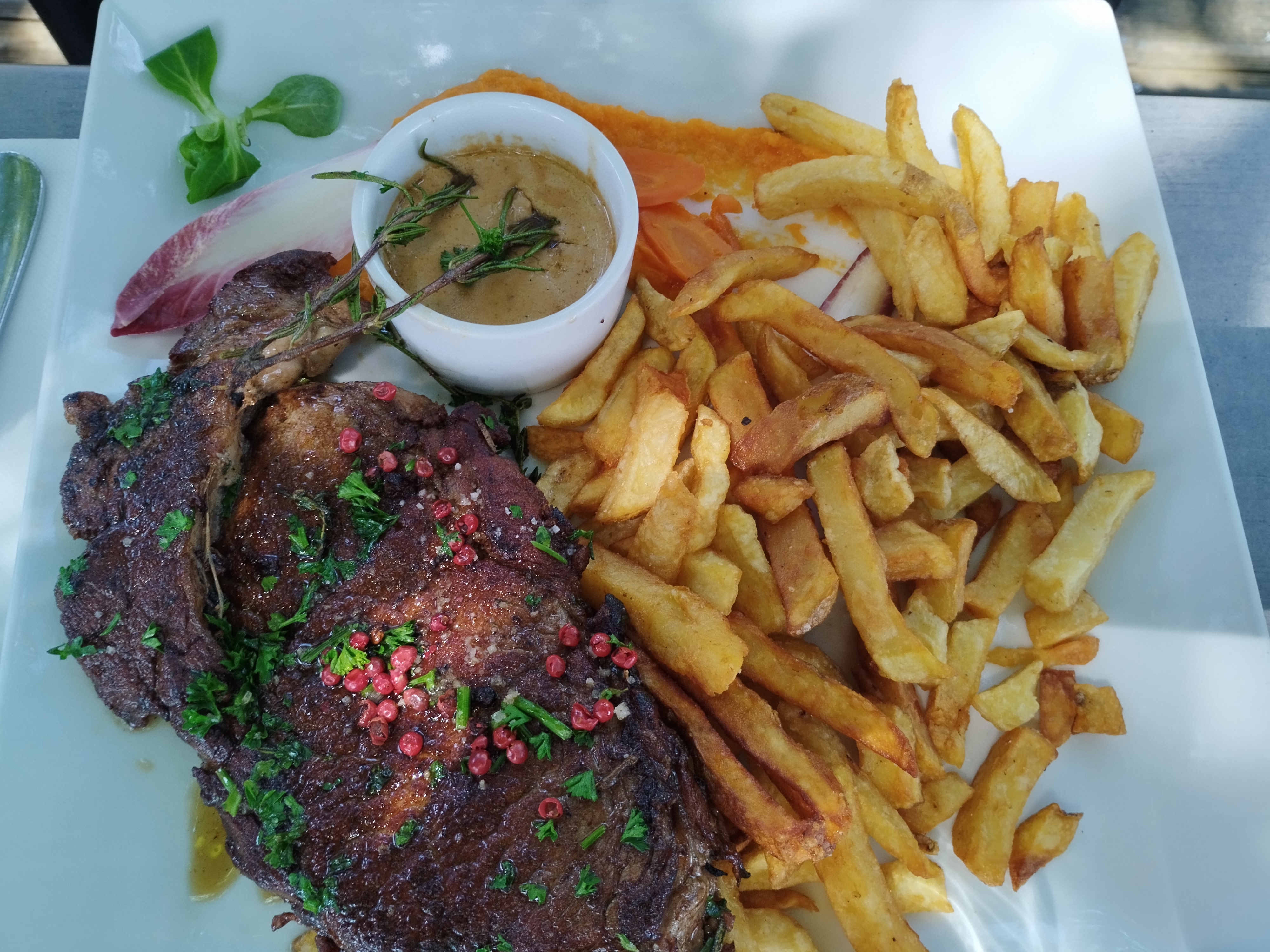 J'ai prit le menu à 25 euros, c'est un peu cher pour la région mais le repas en valait la peine. Les frites sont atypiques (petits morceaux) mais maison et bonnes. L'équipe est jeune, attentionnée et vraiment très sympa. Si vous êtes dans la région et que vous chercher un restaurant avec une belle vue et un service sympathique, je vous le conseil.