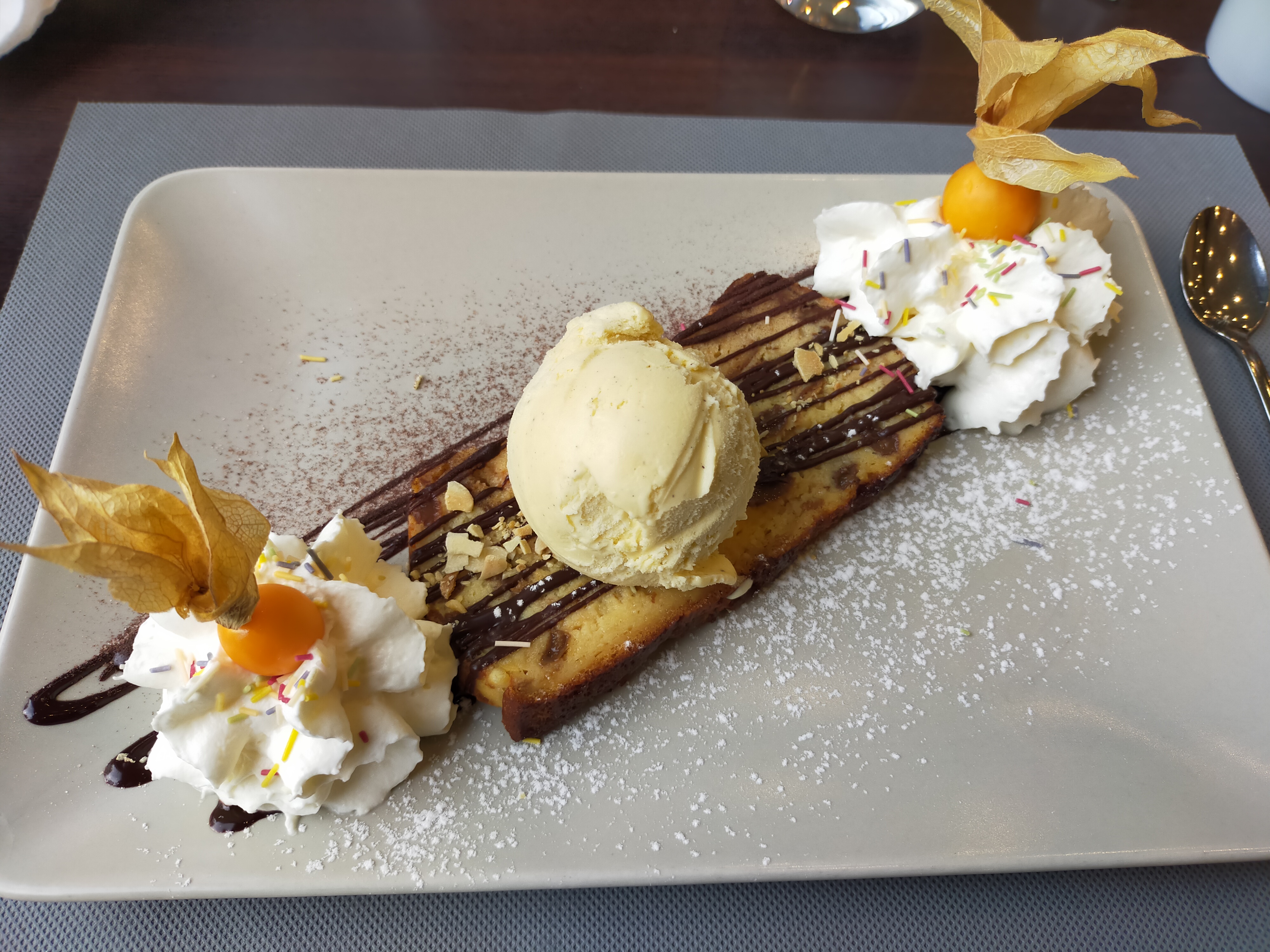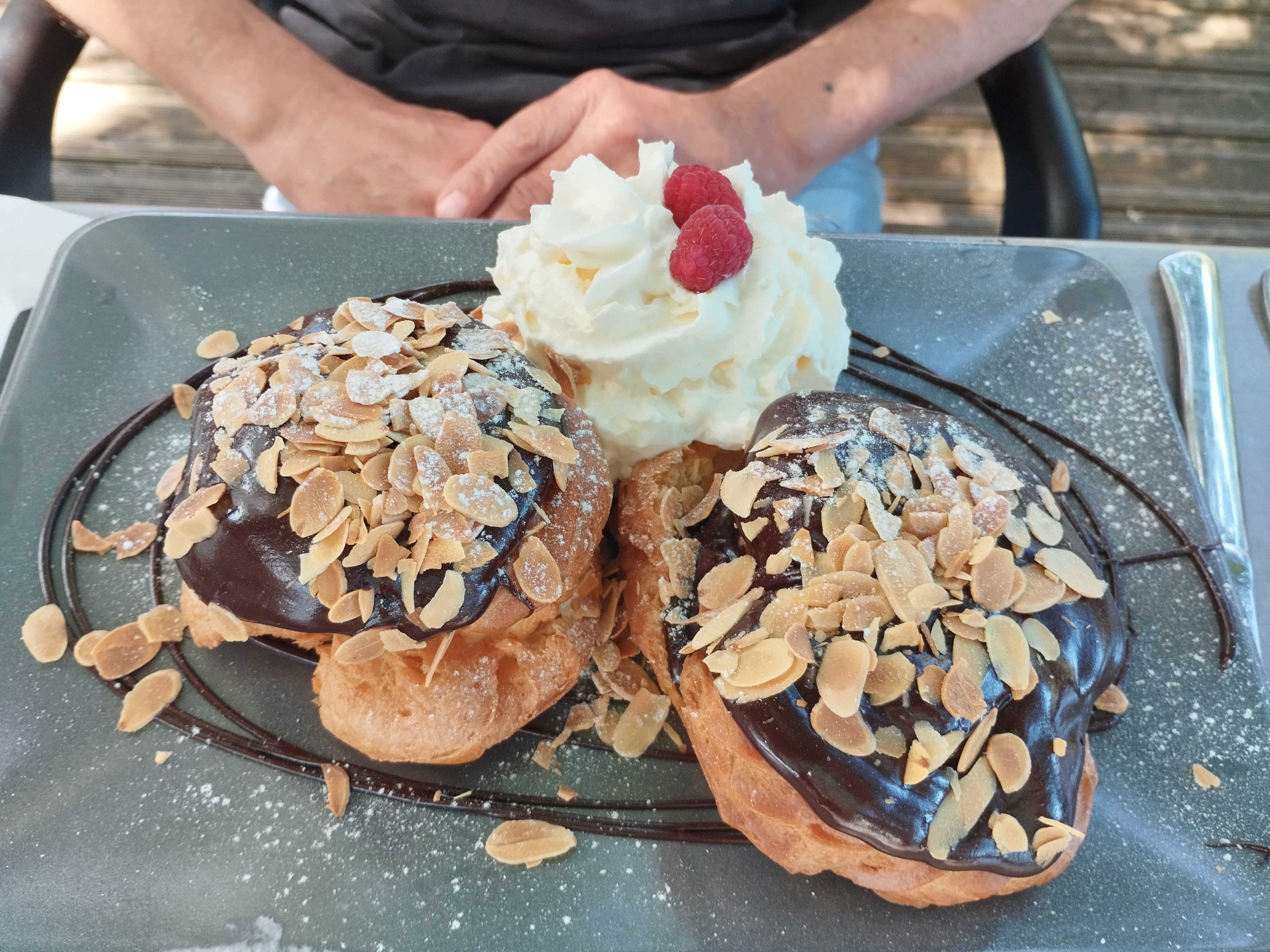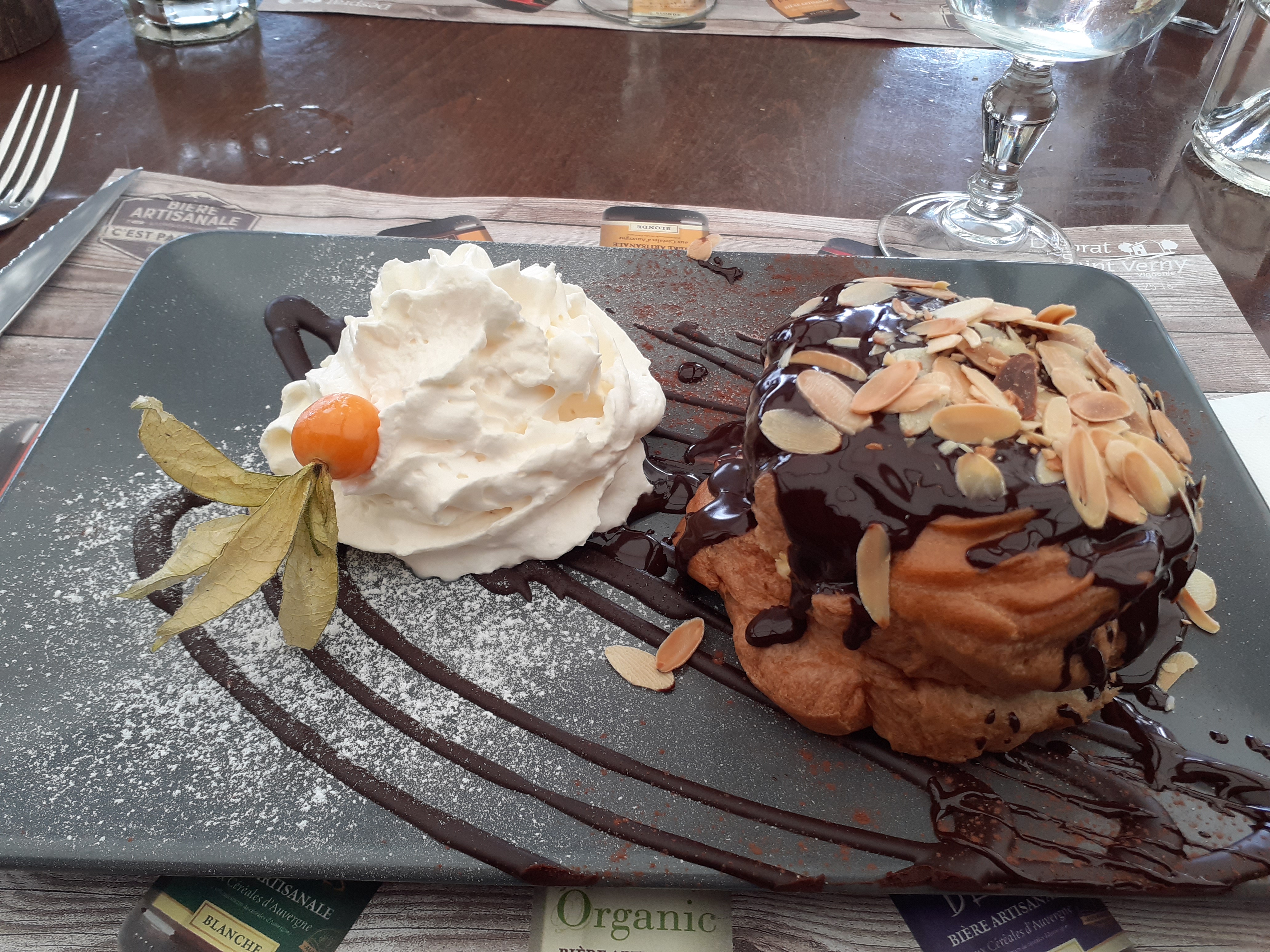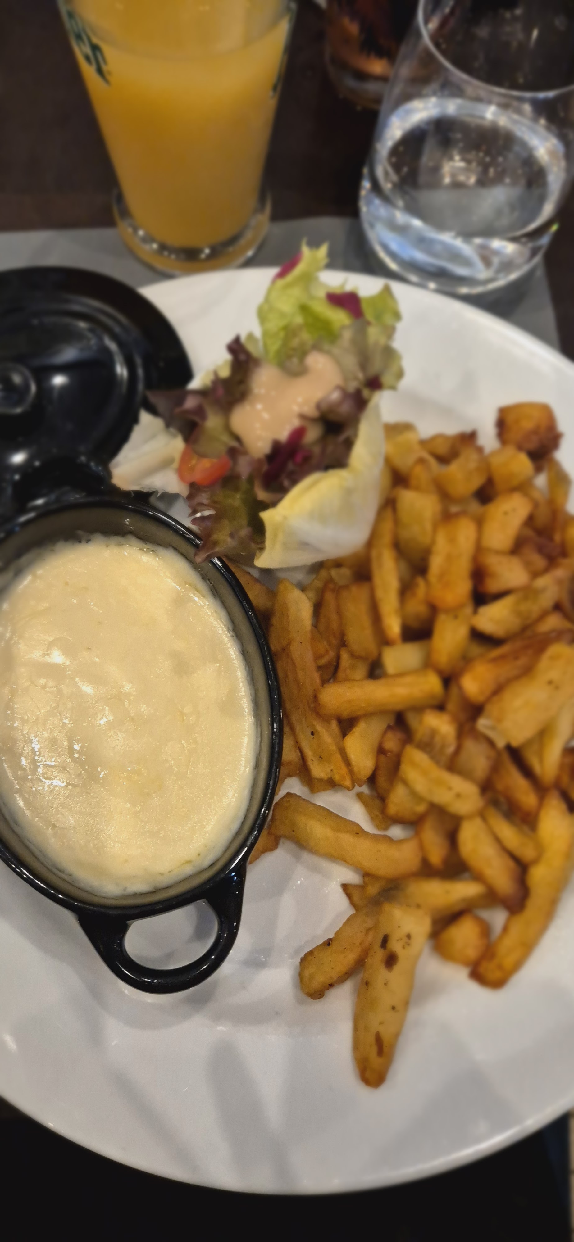 Que dire ‽ la profiterole géante était très bonne par contre la fondue creusoise m'a laissée perplexe, frites molles et colorées (problème de cuisson ou variété de pommes de terre pas adaptées pour des frites ?) Les frites ne devraient elles pas être dorées et croustillantes pour être trempées dans du fromage fondu ? Le service était réactif et professionnel.