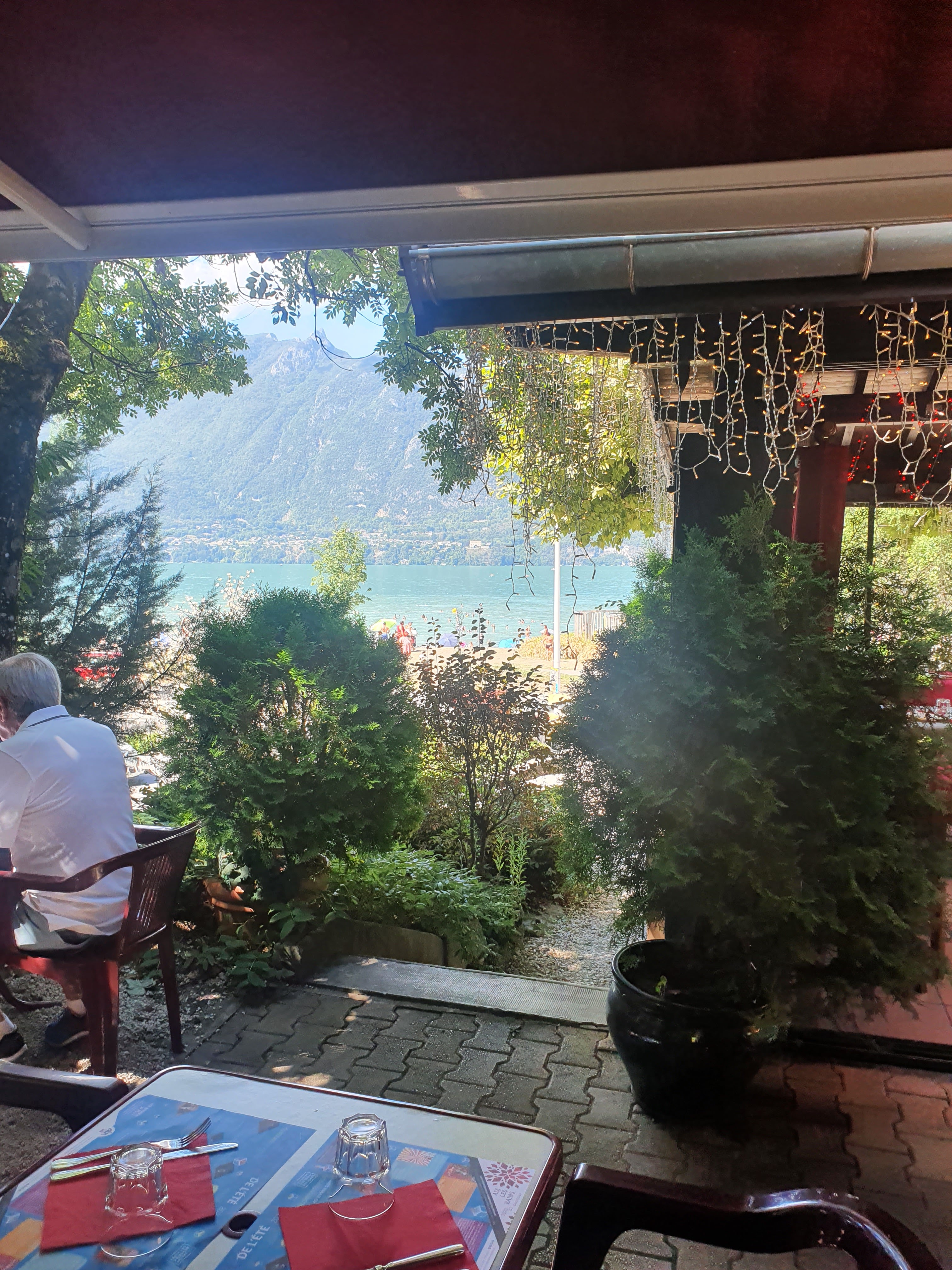 Bel endroit face au lac mais trop d'attente ce dimanche, et nos plats trop cuits (magret canard et saumon)