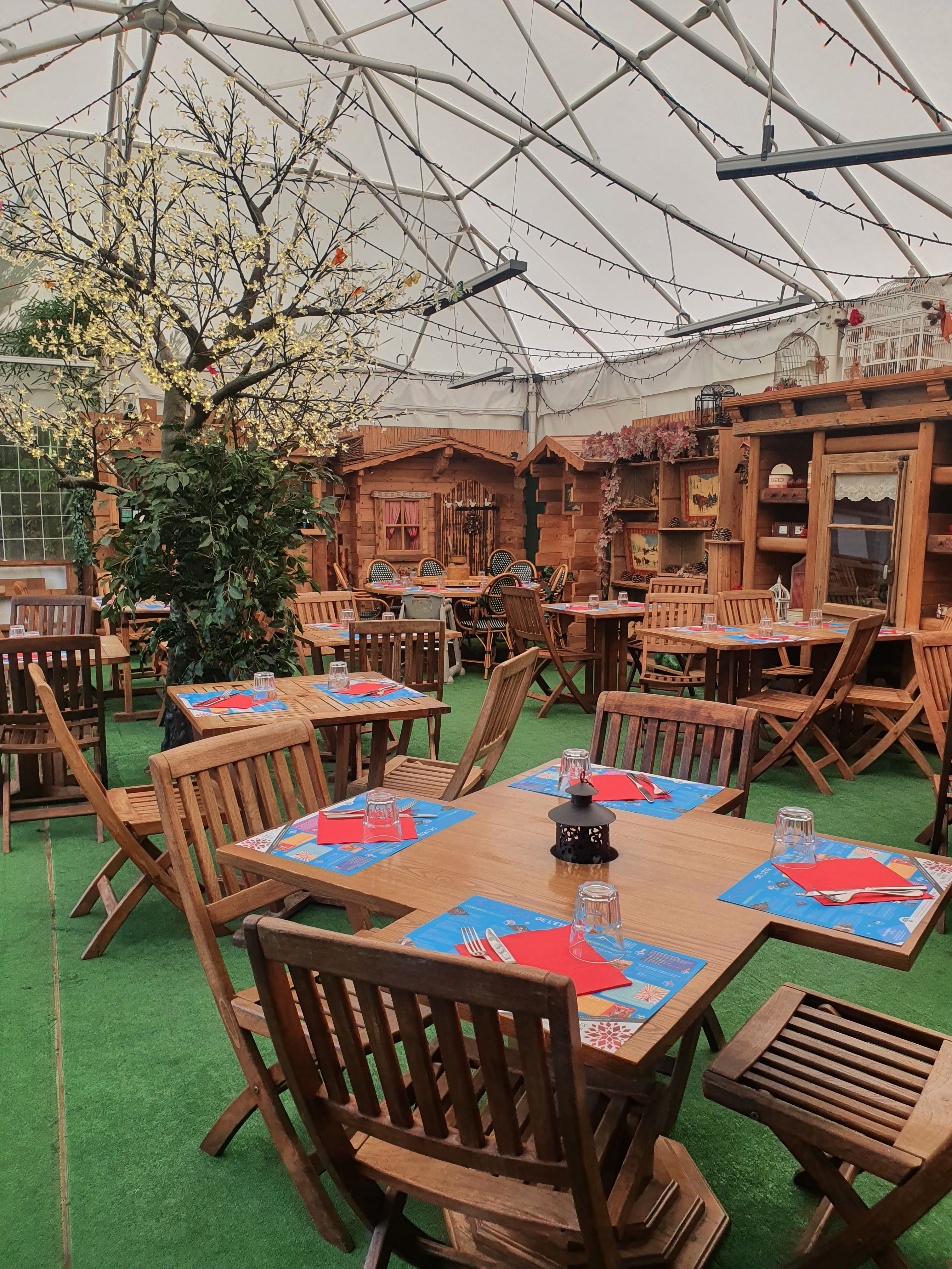 Déçu par l’ambiance, le chalet en bois vu de la route n’a que quelques tables. Sur la gauche un chapiteau en toile très bruyant accueille les clients dans une ambiance cantine malgré les efforts côté décos lumineuses. En cas d’orage, impossible de s’entendre! Toute petite carte elle aussi décevante. Seuls les poissons et les 2 choix de vin blanc au verre sont excellents...