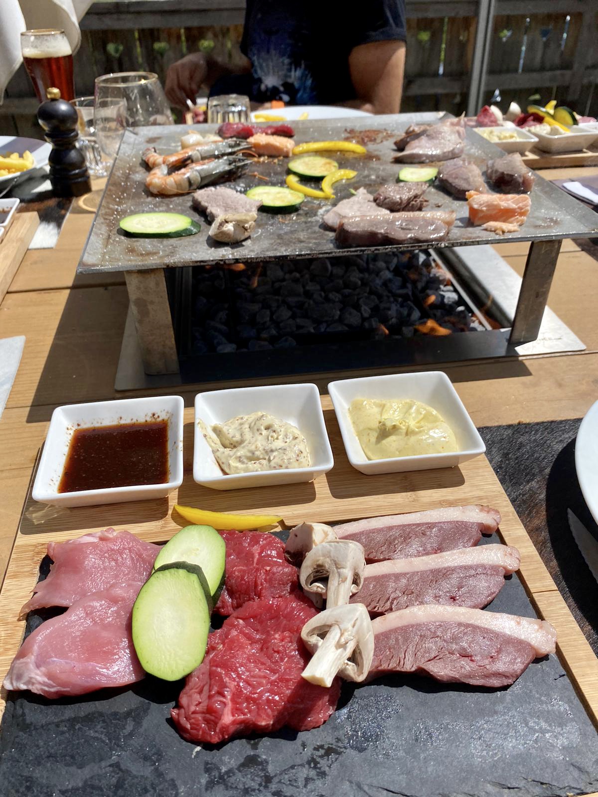 Concept très sympa avec le brasero sur la table. Nous avons pris 2 poissons et 3 viandes. Le plat est accompagné de frites et d’une salade. En dessert, nous avons pratiquement tout testé. Le seul défaut c’est que nous avons trouvé cela cher pour la quantité, que ce soit le plat ou les desserts. 9€ pour une tartelette aux myrtilles sans boule de glace ni chantilly, un peu rude… En revanche, le petit genepy offert à la fin est grandement apprécié 😊
