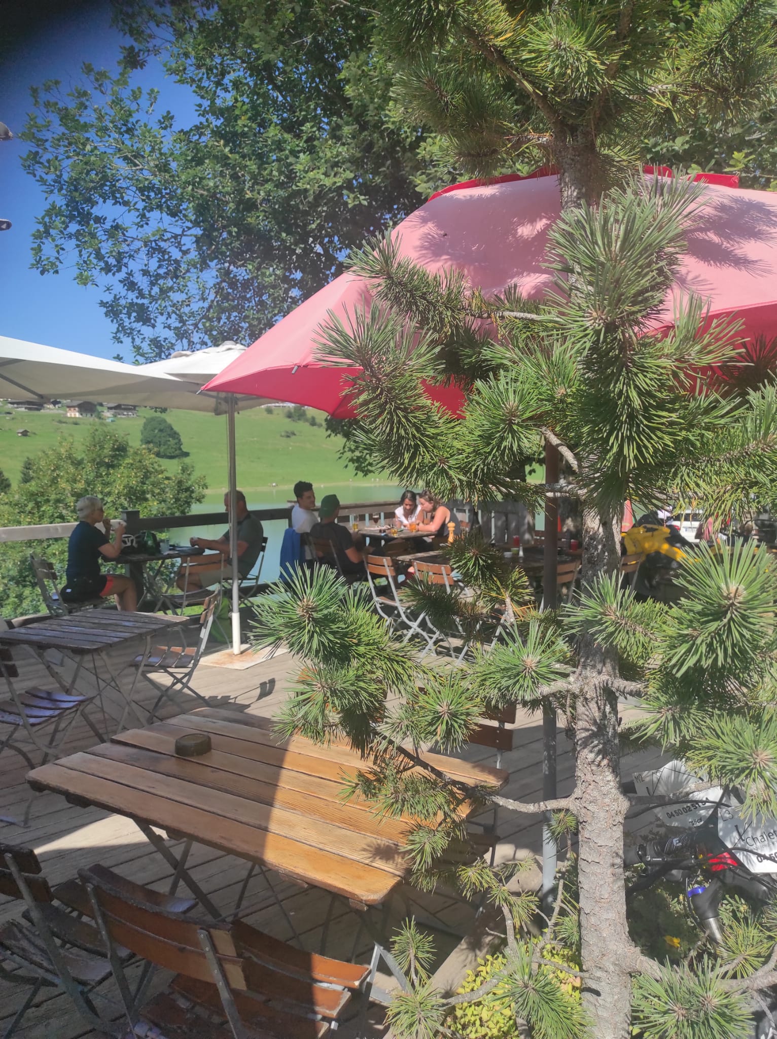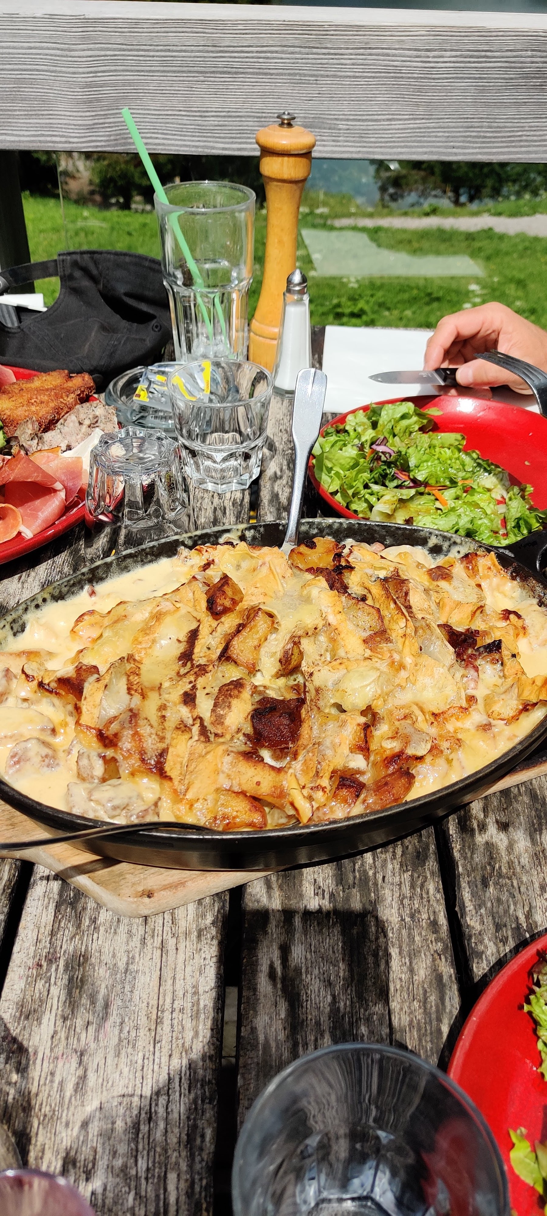 Après une belle rando en bord de lac et ses hauteurs, nous avions réservé pour 13h et nous avons passé un super repas bien montagnard ! Je conseil vraiment la tartiflette en plat car c'est la meilleure que j'ai jamais mangée ! 😉 Le cadre est super, et la terrasse offre une super vue sur le lac et les montagnes alentours