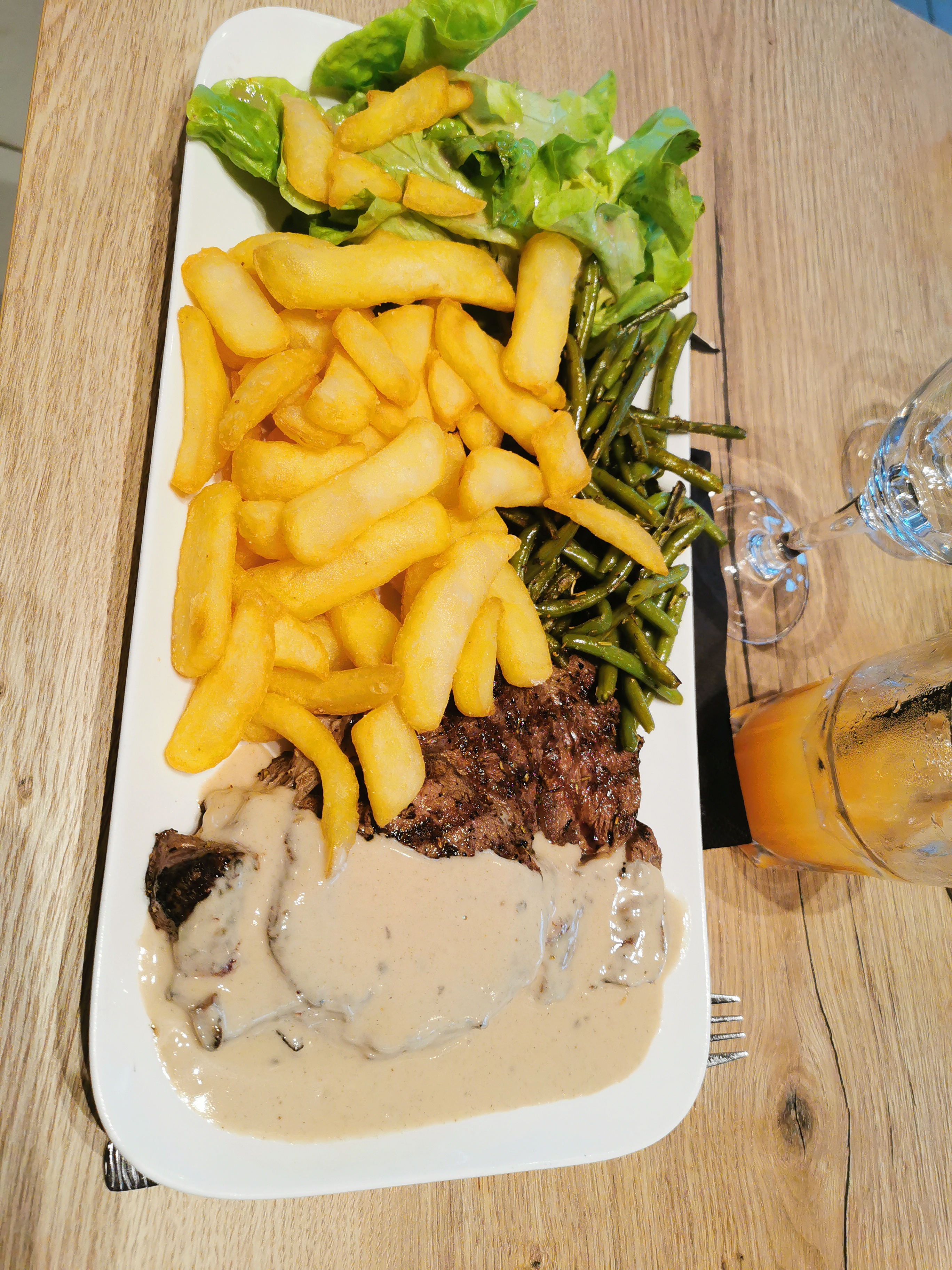 Nous avons très bien mangé ce midi. Pavé de bœuf cuit à point. Accompagnent bien garnis. Nous nous sommes régalés. Nous reviendrons avec plaisir. Un petit clin d'œil de la fille de la dame blanche 😉