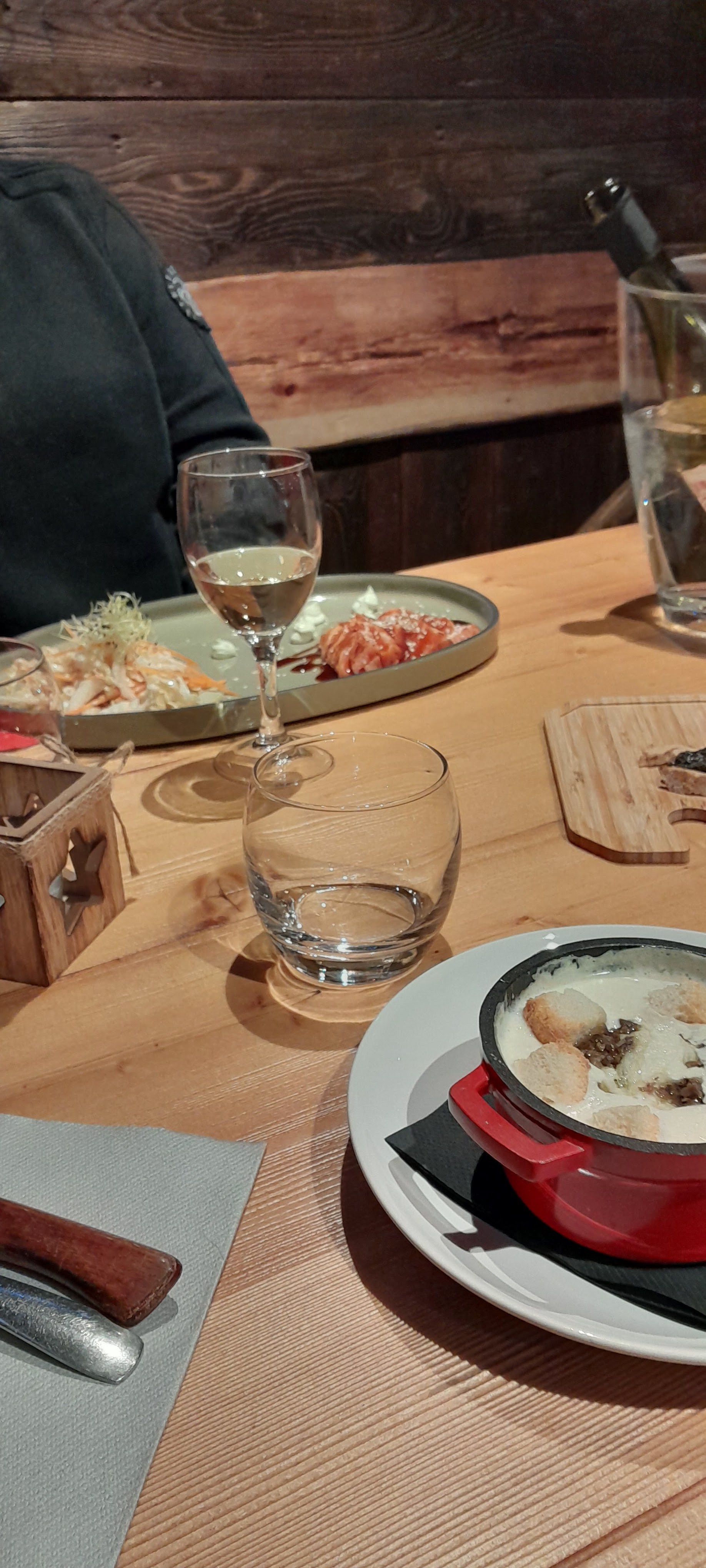 Commençons par les points positifs. Le cadre est magnifique, un chalet niché au cœur de la forêt. Le jour où nous y étions, il y avait de la neige. Cela rajoute du charme à l’endroit. Nous concernant, nous étions une société de 17 salariés à organiser un repas d’entreprise. Mikaela,Très sympathique, a tout mis en place pour vous accueillir au mieux. La communication passe bien, nous obtenons toujours une réponse à nos mails. Les prix sont certes plus cher que dans d’autres restaurants mais le cadre en vaut détour et je pensais que la cuisine allait suivre. Nous arrivons donc le jour J avec toute notre équipe. Nous prenons un apéro non compris dans le tarif. Arrivent ensuite les différents menus pour notre part : 12 fondues savoyardes, 2 raclette savoyarde, et trois menus avec entrée plat. Arrive le moment du dessert, dans la proposition de menu il était indiqué dessertS de là-haut. On nous amène une Pana cota aux myrtilles sans nous demander notre avis. Rien n’était précisé dans les offres que c’était le dessert prévu pour les groupes. Si j’avais été au courant de ce choix, je l’aurais refusé. La quantité de fromage pour la raclette n’est pas sérieuse. Deux hommes sur la part de raclette. À 36 € le menu raclette, ça fait un peu cher au vu de la quantité. Sachant que ce ne sont pas de gros mangeurs, ils sont sortis de table En ayant fait. Certes la fondue est bonne même si je trouve qu’il manque du vin blanc. À noter que toute l’équipe est savoyarde. Nous concernant, nous connaissons donc parfaitement ce plat. L’absence de vin blanc n’est toutefois pas un point négatif à la saveur gustative du plat. Quand je réclame par rapport au dessert on me répond simplement que c’est comme ça et que c’est vrai et que c’est le dessert prévu pour les groupes. Après contact avec Mikaela, celle-ci m’informe aussi que c’est le dessert prévu pour les groupes sans que cela me soit indiqué auparavant. Nous étions 17, la note est élevé à 1000 €. Soit 62,50 € par personne pour une raclette ou une fondue, une Pana cota en apéritif par personne et quatre ou cinq bouteilles de vin. Je trouve effectivement cela cher pour la quantité proposée et surtout l’absence de choix du dessert. Bref une expérience mitigée avec en prime un serveur pas très avenant. Le vin rouge proposé au verre est un rouge de Provence. Quel dommage alors que nous sommes en Savoie.
