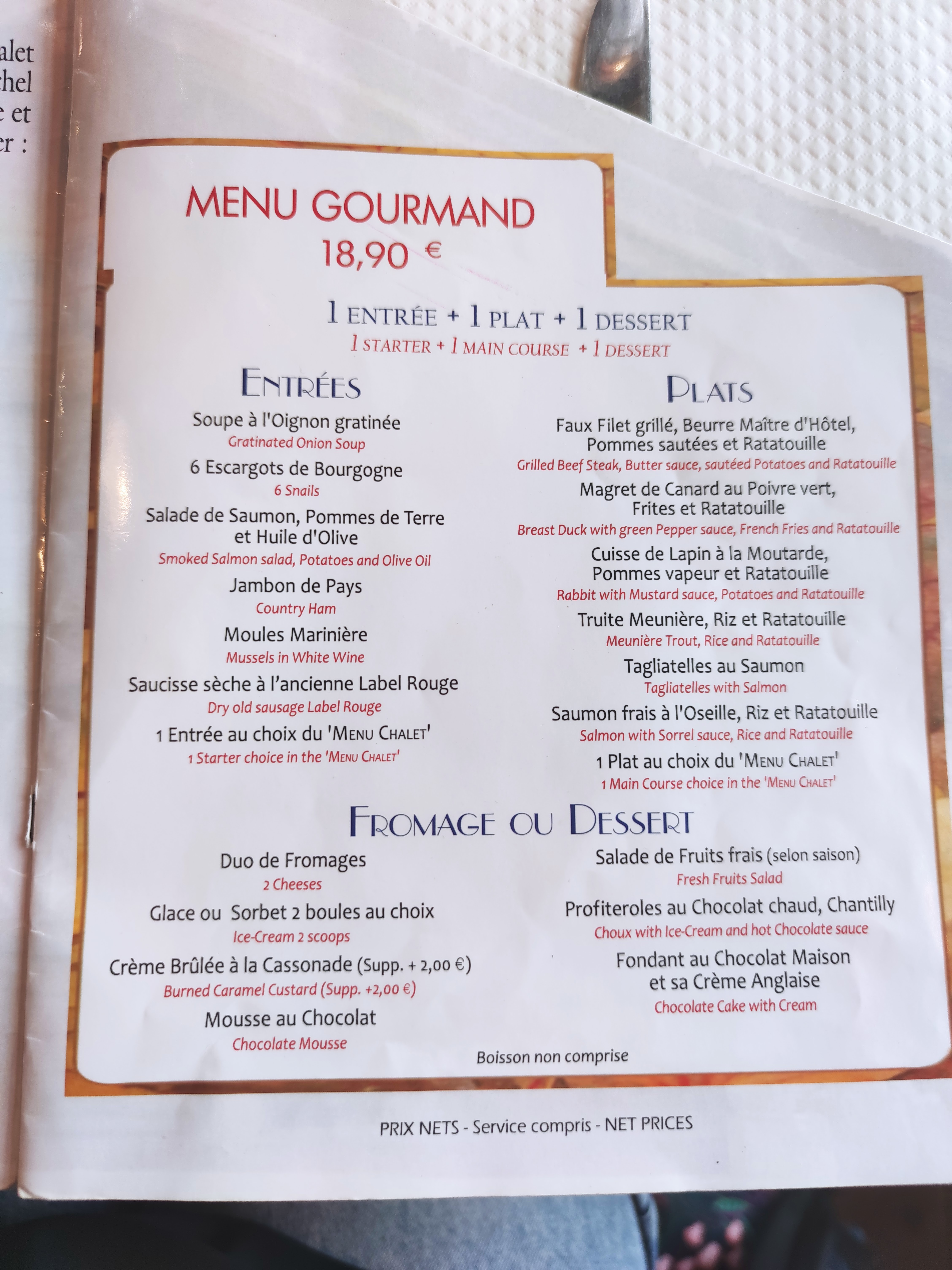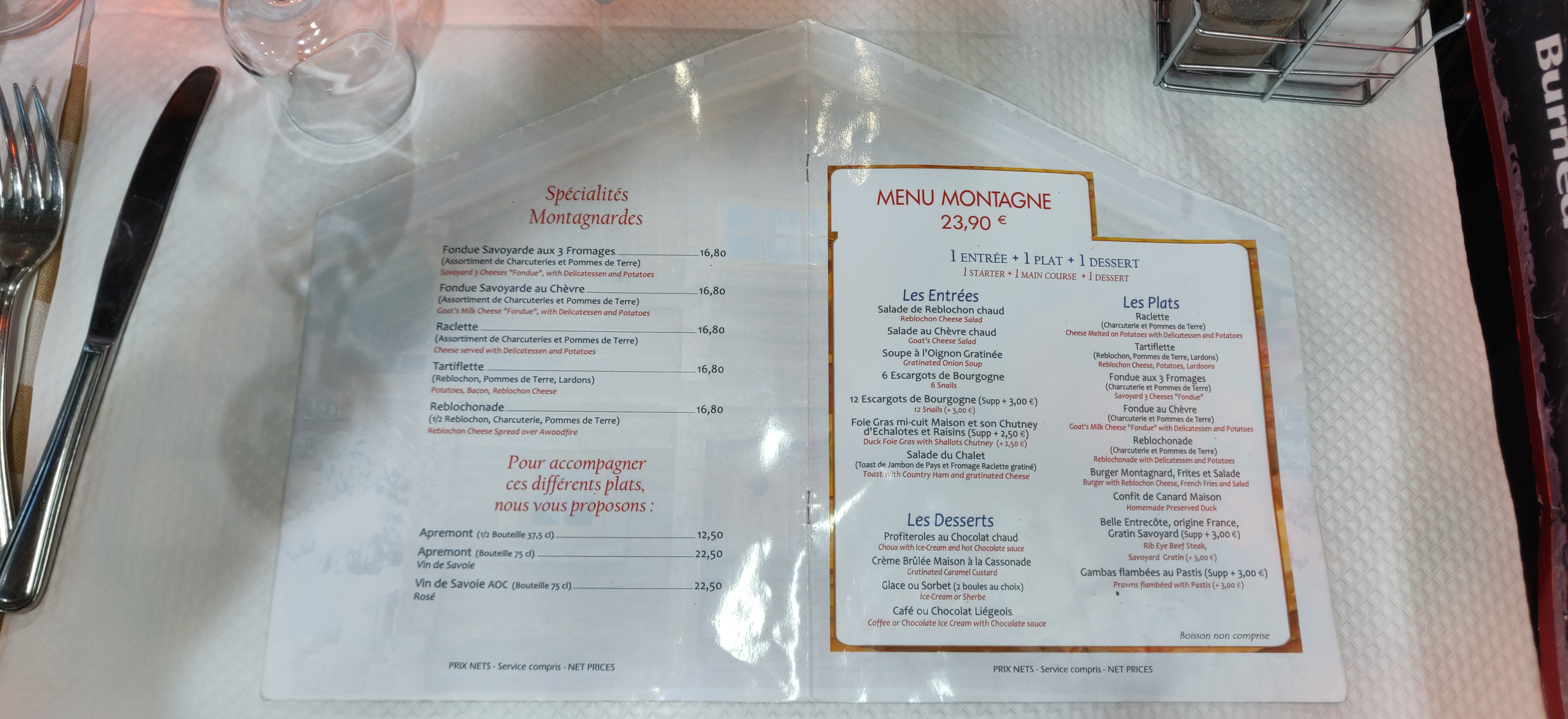 2 menus Montagne -les entrées : bonne soupe aux oignons et bonne salade chèvre mais le fromage n'était pas assez cuit (bonne salade). -les plats : reblochonade et fondue 3 fromage servis avec pomme de terre et charcuterie. Très bons et copieux (en particulier la fondue). -dessert : bonnes profiteroles mais la pâte à choux était fine et pas très moelleuse. Sauce chocolat très goûteuse (chocolat noir). Personnel peu chaleureux mais cordial. Service rapide et efficace.