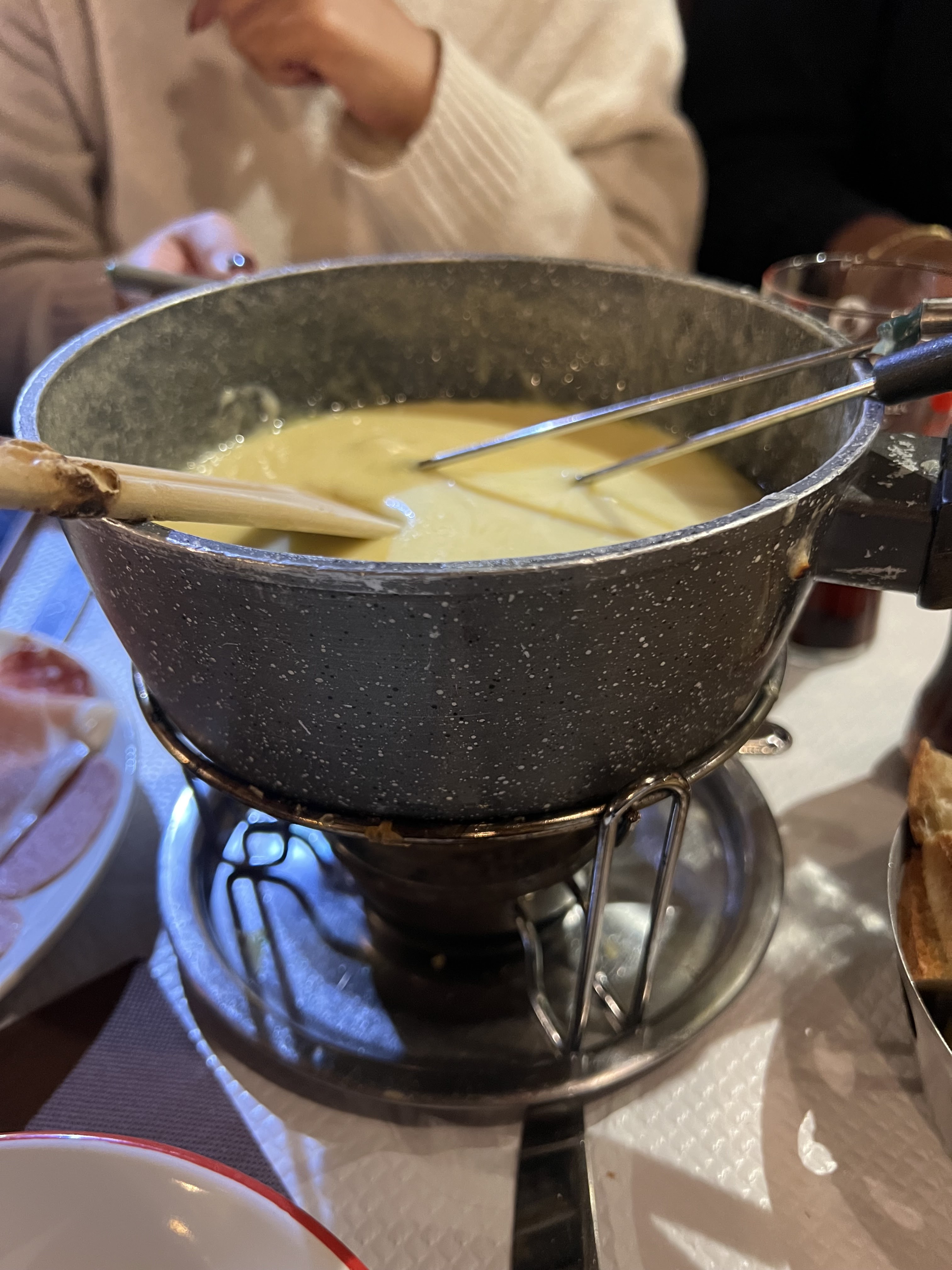 On se retrouve dans un esprit chalet . Très fréquenté ce qui décide à y aller . La cuisine et la vaisselle ne sont pas très raffinées . La fondue est simple . Le verre de rose n est pas top . Y aller pour le cadre