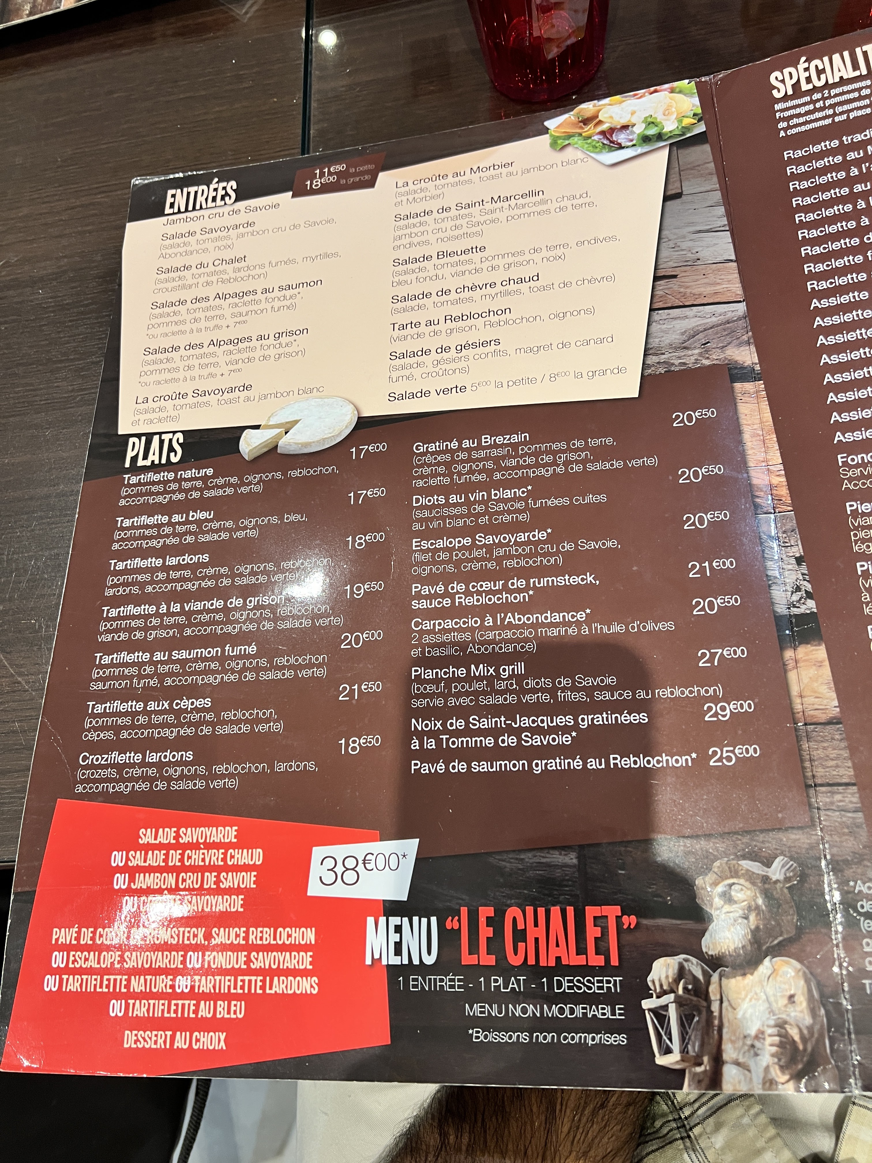 Très bon restaurant de Savoyard !!! On se sent déjà en Haute Savoie ! Le decor est sympa mais vraiment il manque l'ambiance du chalet et une cheminée!! Équipe très dynamique et serviable ! Les serveurs sont souriants et aimables ! Toilettes très propre ! Un décor avec une touche de granite Très bon fromage ! Bon vin de la région de Savoie et de l eau minérale! Le choix des viandes de poulet, ou jambons ne sont pas beaucoup , qualité moyenne! On attendait une variété de charcuterie de la région savoyard ! La seule chose à améliorer ! En gros ! Nous avons passé un job moment ! Merci